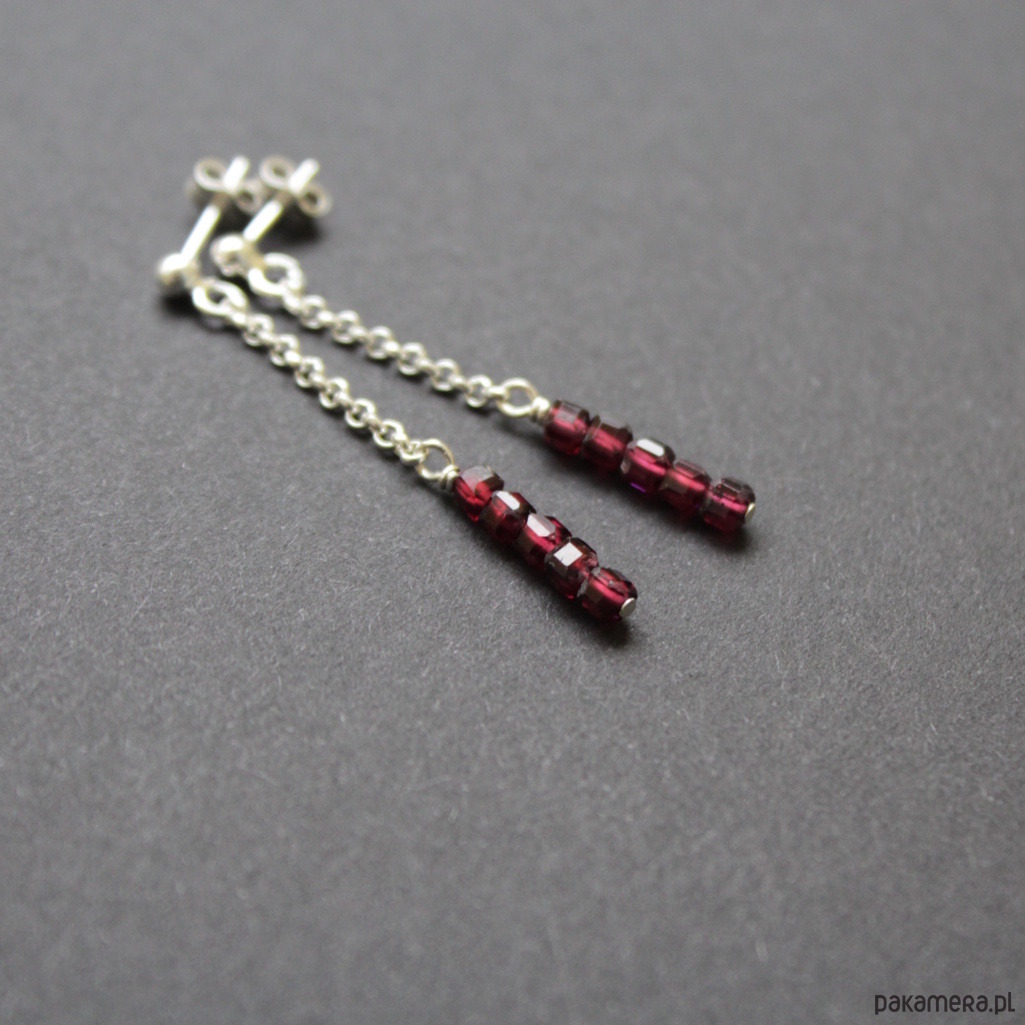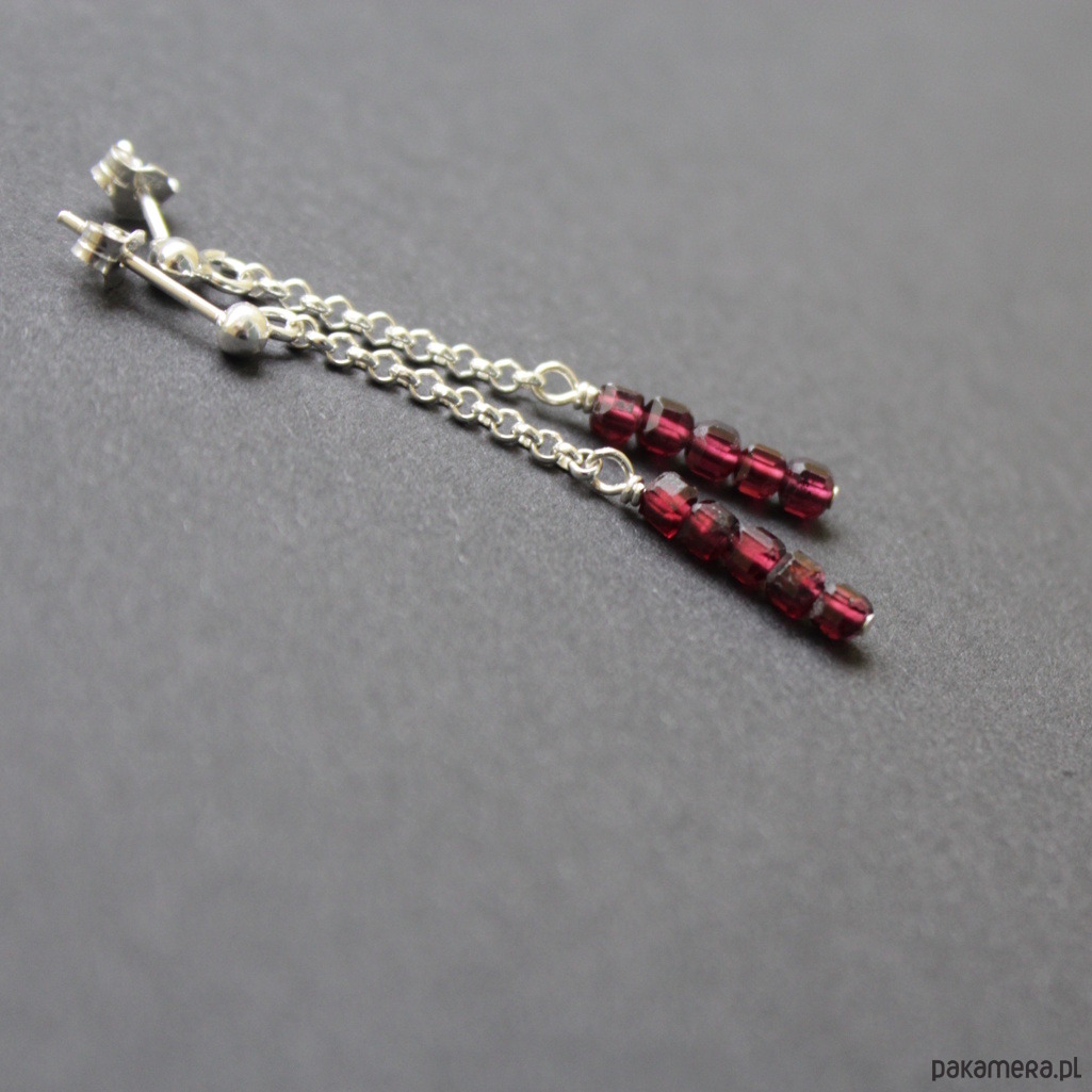 Delikatne kolczyki wykonane zostały ze srebra próby 925 oraz pięknych kosteczek granatów wielkości 3x3 mm..