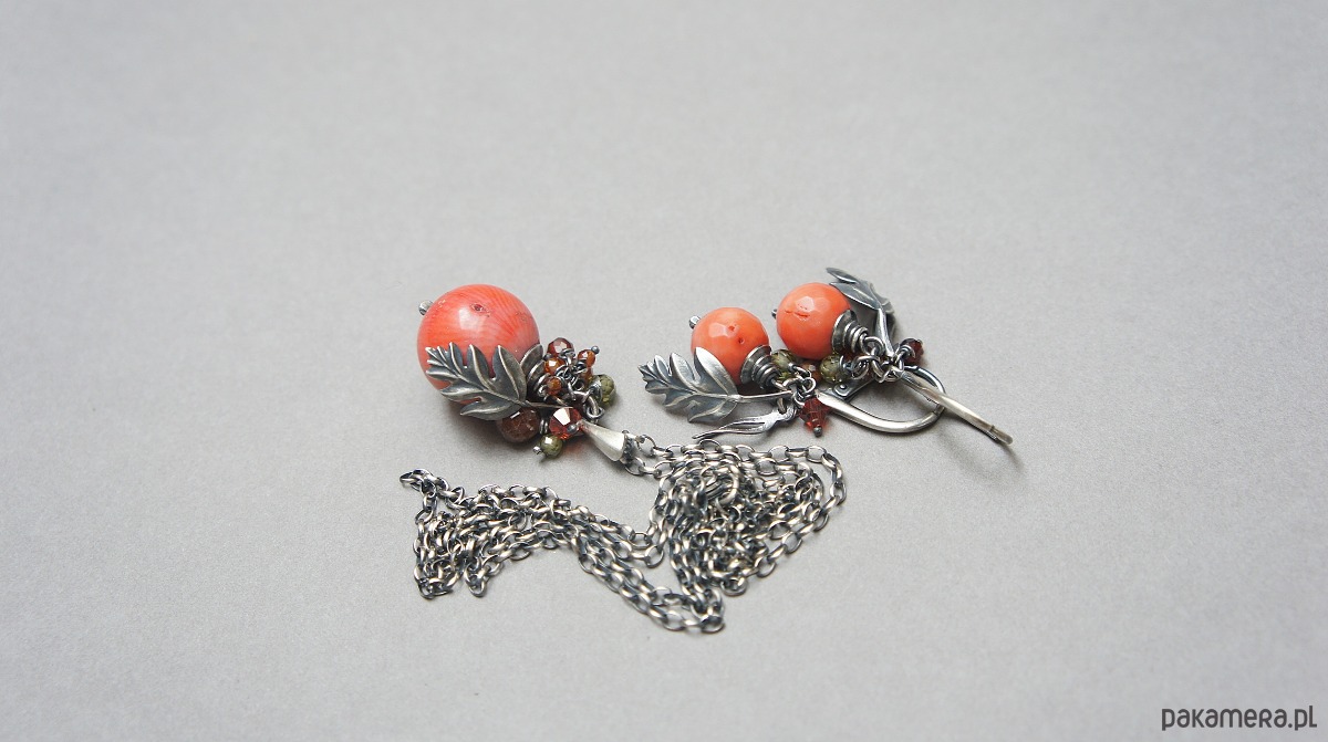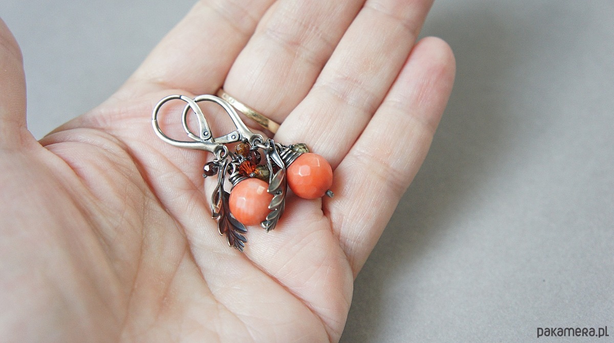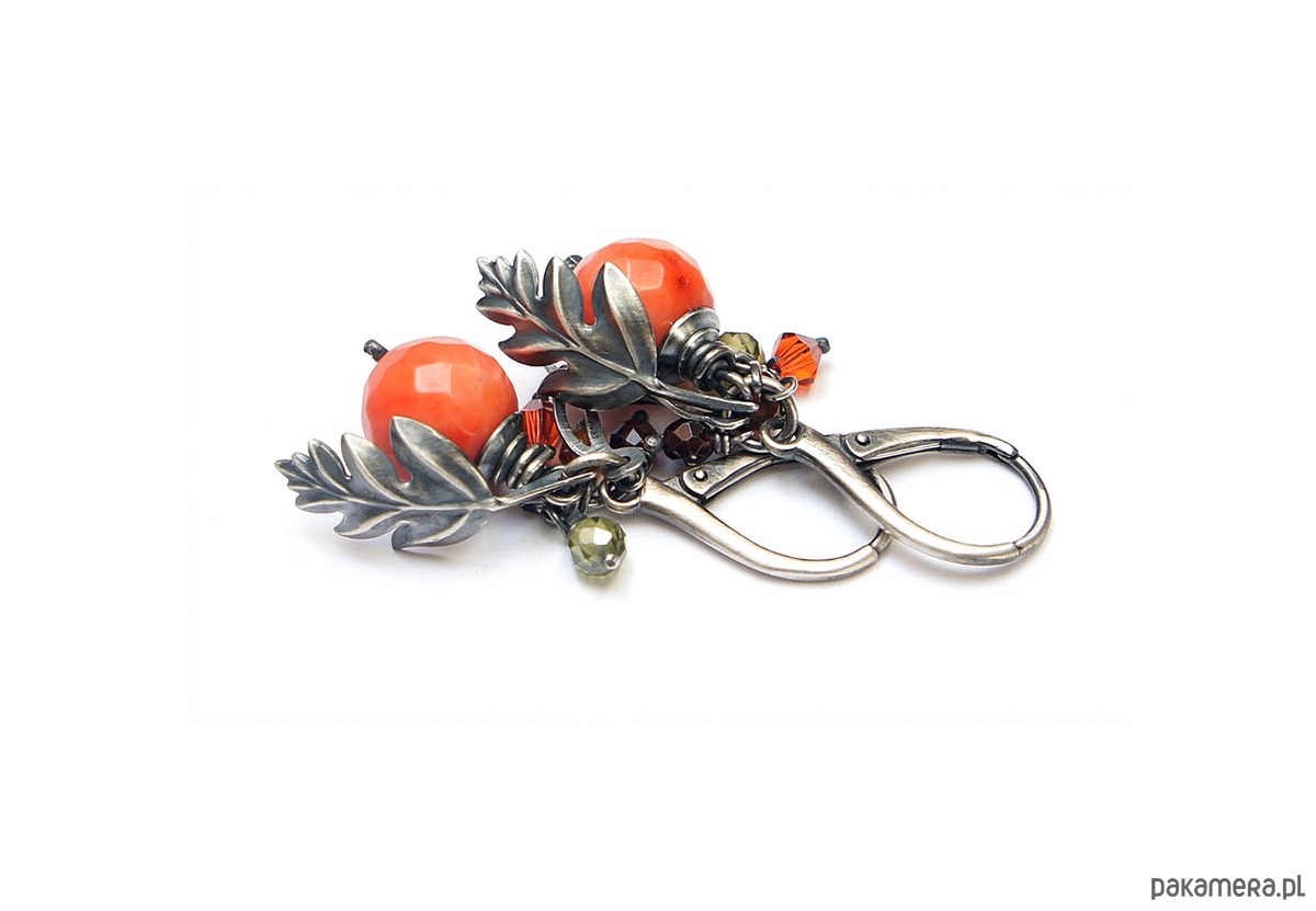 Kolczyki wykonane ze srebra [pr.925] w połączeniu z fasetowanym koralem robaczywką w pomarańczowym kolorze [9mm -kamienie posiadają naturalne niedoskonałości ,wżery widoczne na zdjęciach ], fasetowanymi granatami [3mm - hessonit] ,cyrkoniami [3 i 2mm] ,kryształkami Swarovski [4mm] oraz srebrnymi listkami. Całość oksydowana i przetarta. Całkowita długość kolczyków 4,2cm. Biżuteria ozdobnie zapakowana.
