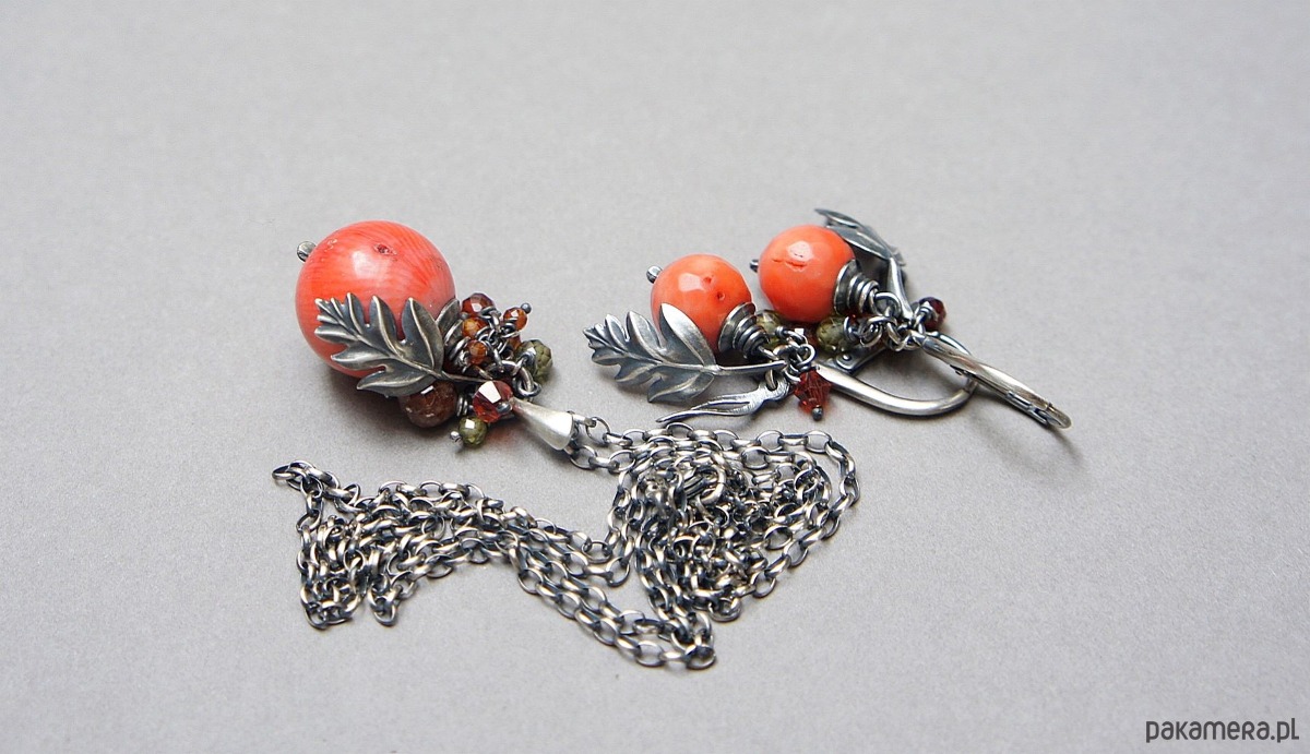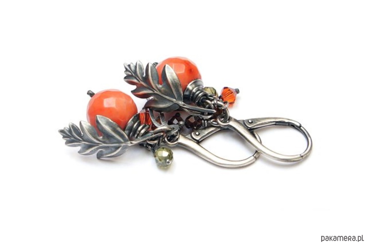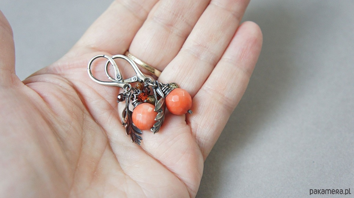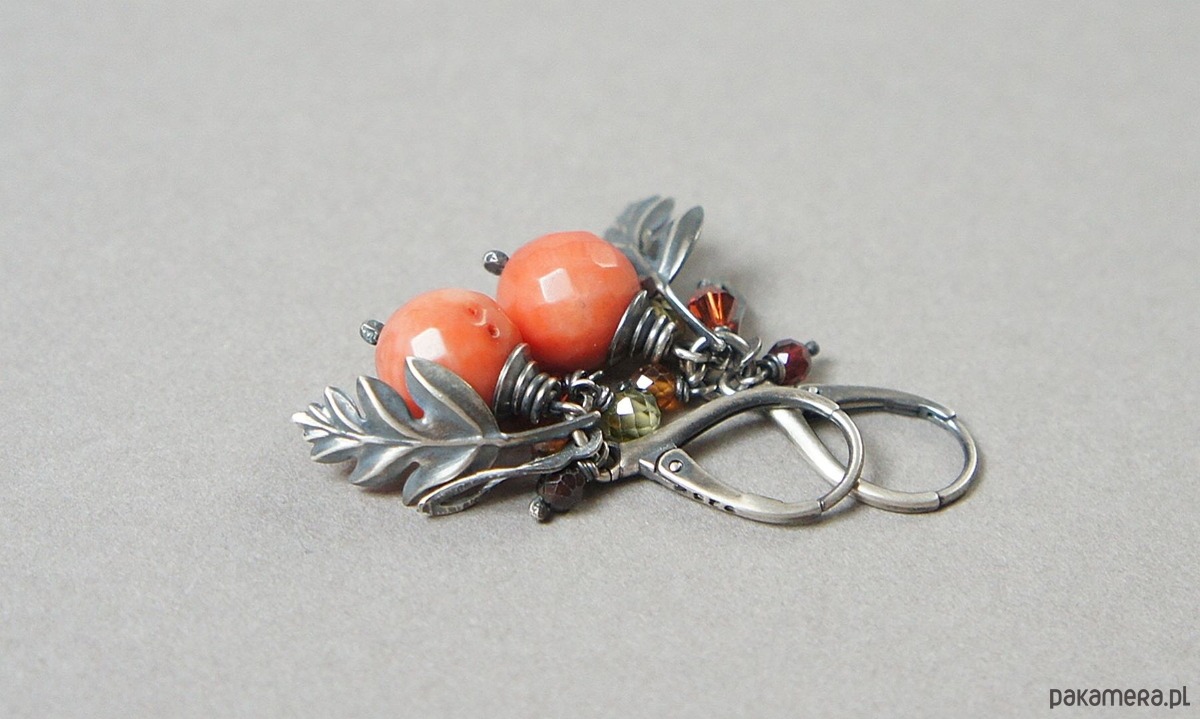Kolczyki wykonane ze srebra [pr.925] w połączeniu z fasetowanym koralem robaczywką w pomarańczowym kolorze [9mm - kamienie posiadają naturalne niedoskonałości, wżery widoczne na zdjęciach], fasetowanymi granatami [3mm - hessonit],cyrkoniami [3 i 2mm], kryształkami Swarovski [4mm] oraz srebrnymi listkami. Całość oksydowana i przetarta. Całkowita długość kolczyków 4,2cm. Biżuteria ozdobnie zapakowana.