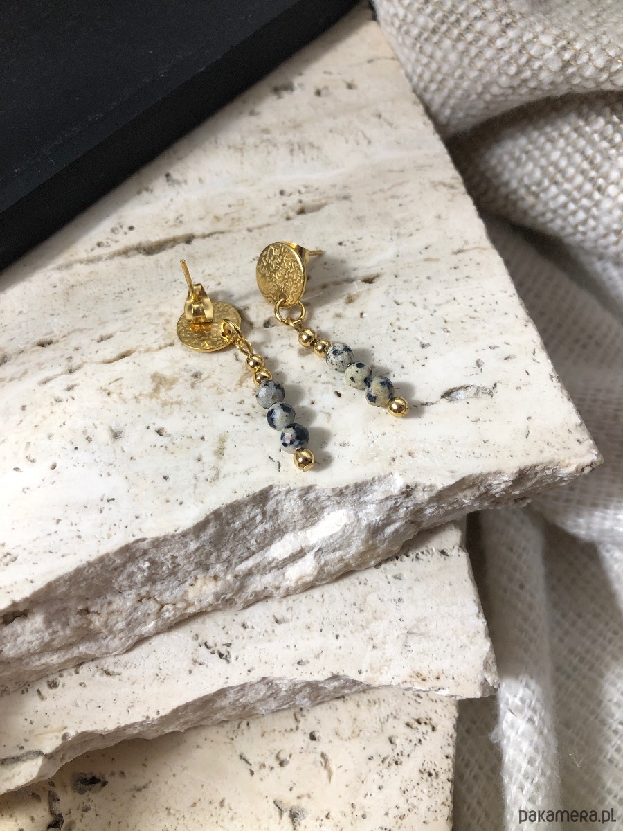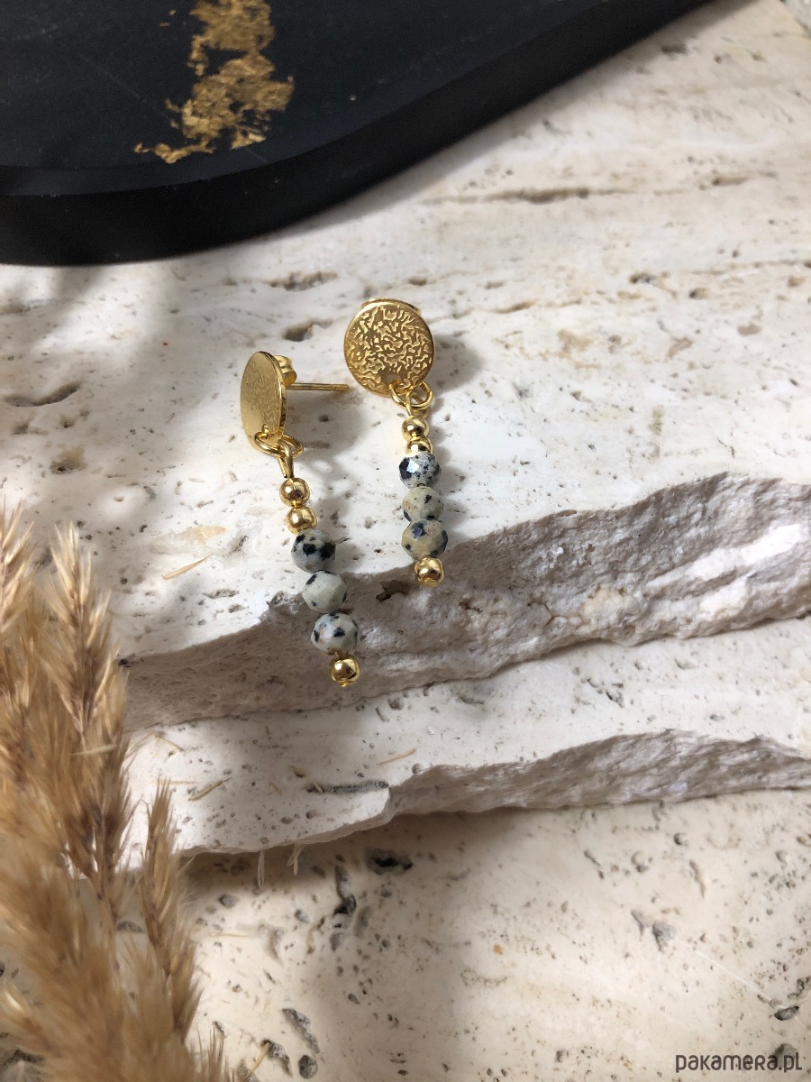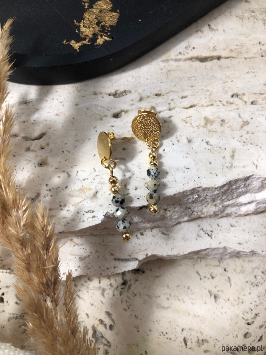 Kolczyki wykonane z kamieni naturalnych i stali chirurgicznej. Na szpilkę jubilerską nawlekłam jaspis dalmatyński o średnicy 4,5 mm oraz kuleczki ze stali chirurgicznej w kolorze złotym. Baza kolczyka to kółko nakrapiane ze stali chirurgicznej w kolorze złotym 10mm. Długość całkowita kolczyków to około 3,5 cm.