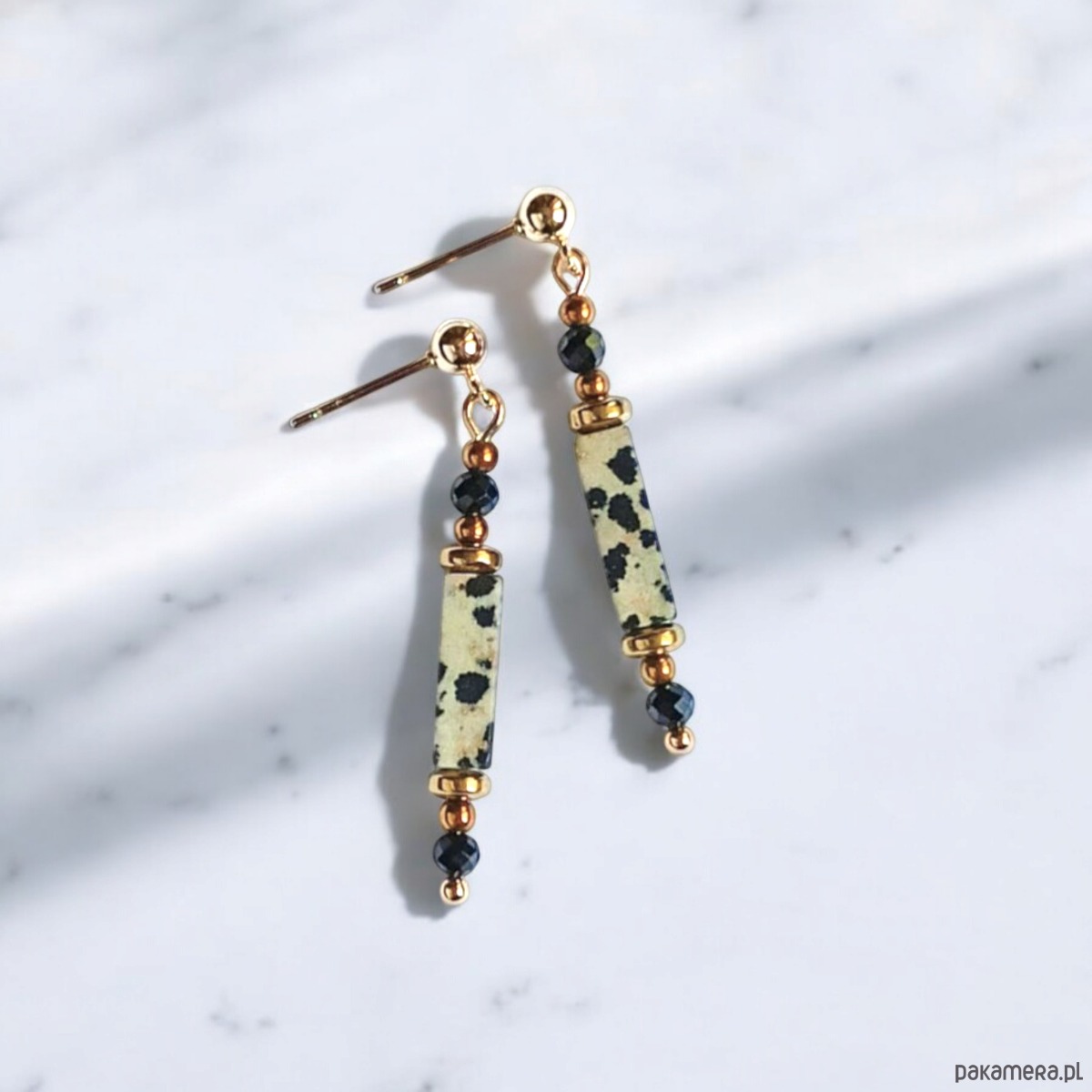 Kolczyki wykonane z połączenia jaspisu dalmatyńskiego (prostopadłościany 4x13mm) i fasetowanego czarnego turmalinu (3mm) oraz przekładek że złotego hematytu.