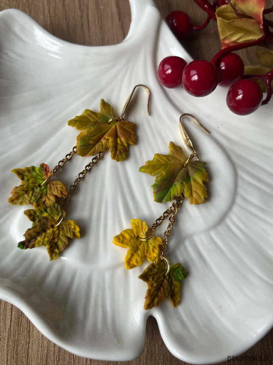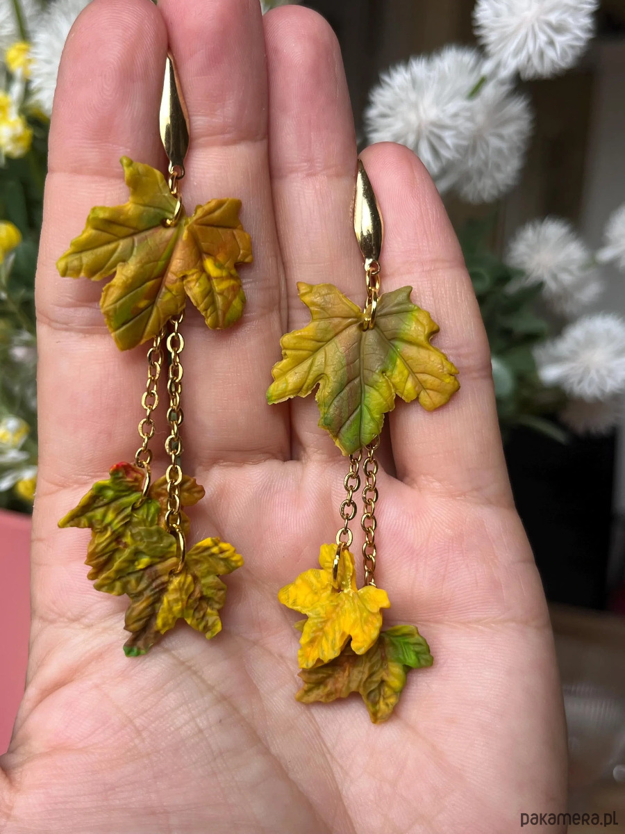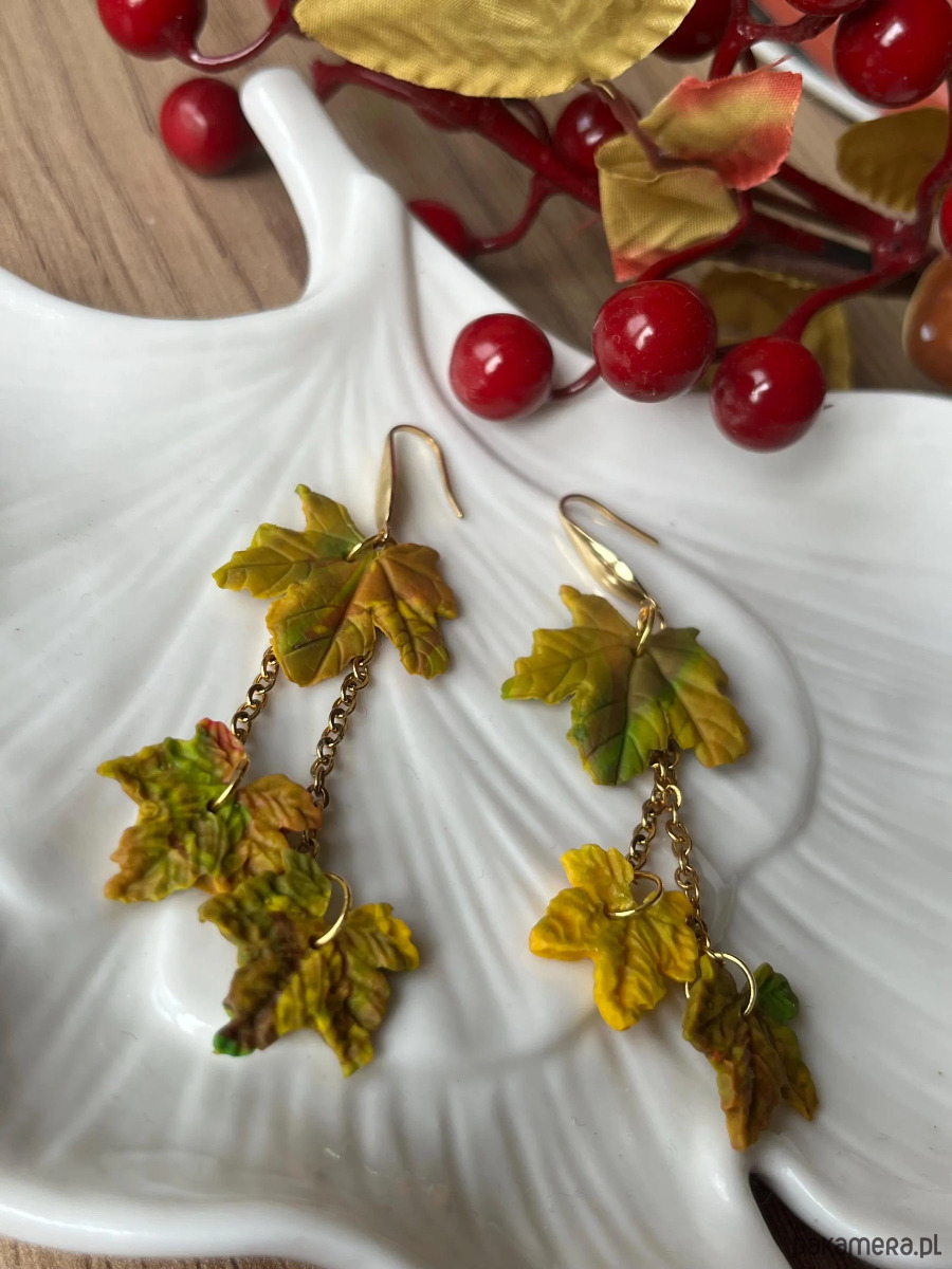 Piękne kolczyki Jesienne Liście wykonane ręcznie z dbałością o każdy detal. Delikatne złote łańcuszki ozdobione realistycznymi listkami w odcieniach żółci, zieleni i brązu przywołują ciepło jesiennych dni.