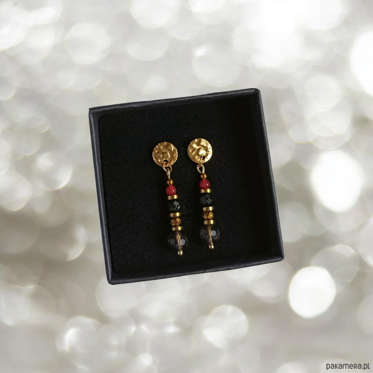 Wykonane z fasetowanych kuleczek karneolu (ruda czerwień) 3mm, fasetowanych kul kwarcu dymnego 6mm, fasetowanych kul czarnego turmalinu 4mm i przekładek ze złotego hematytu.