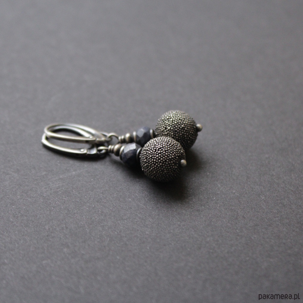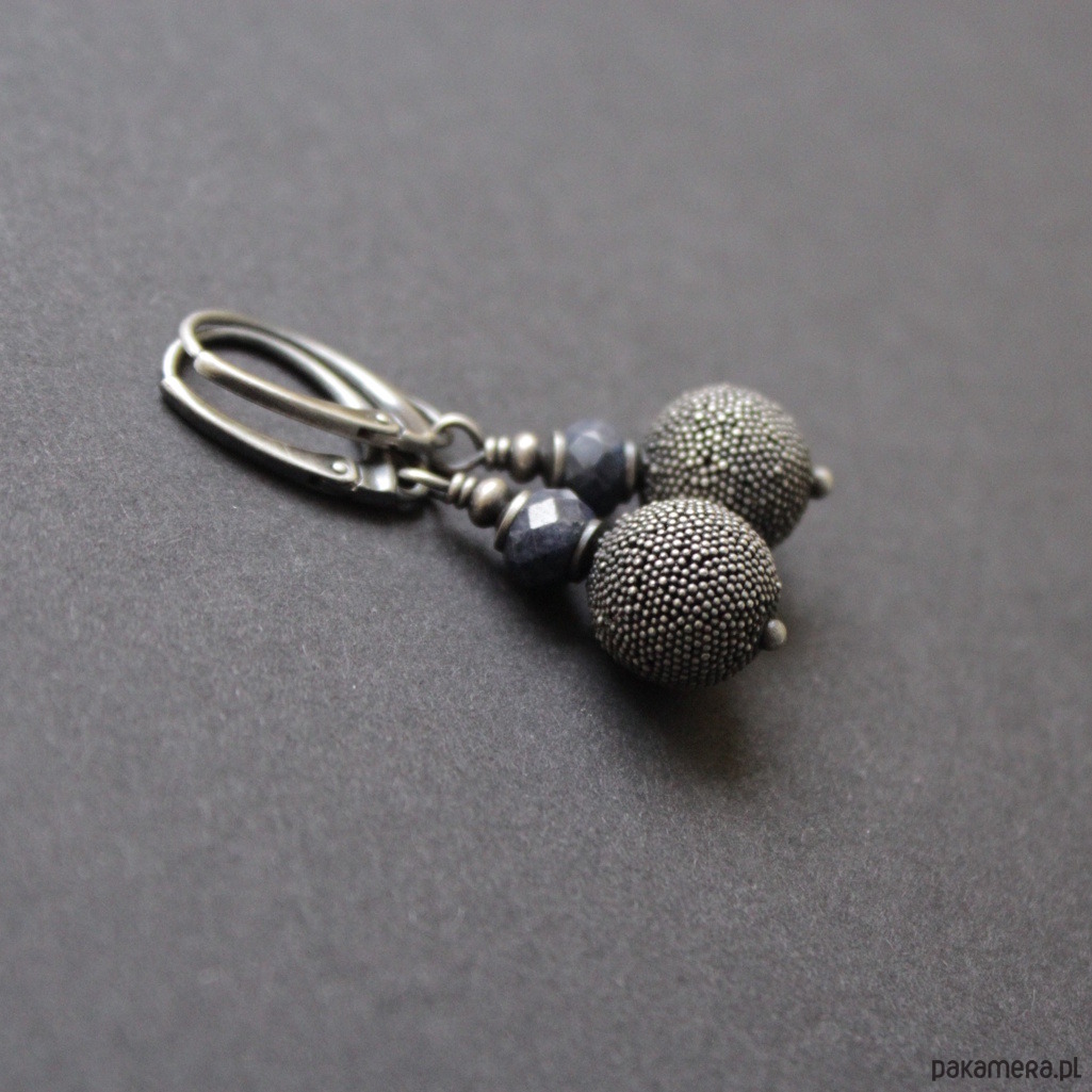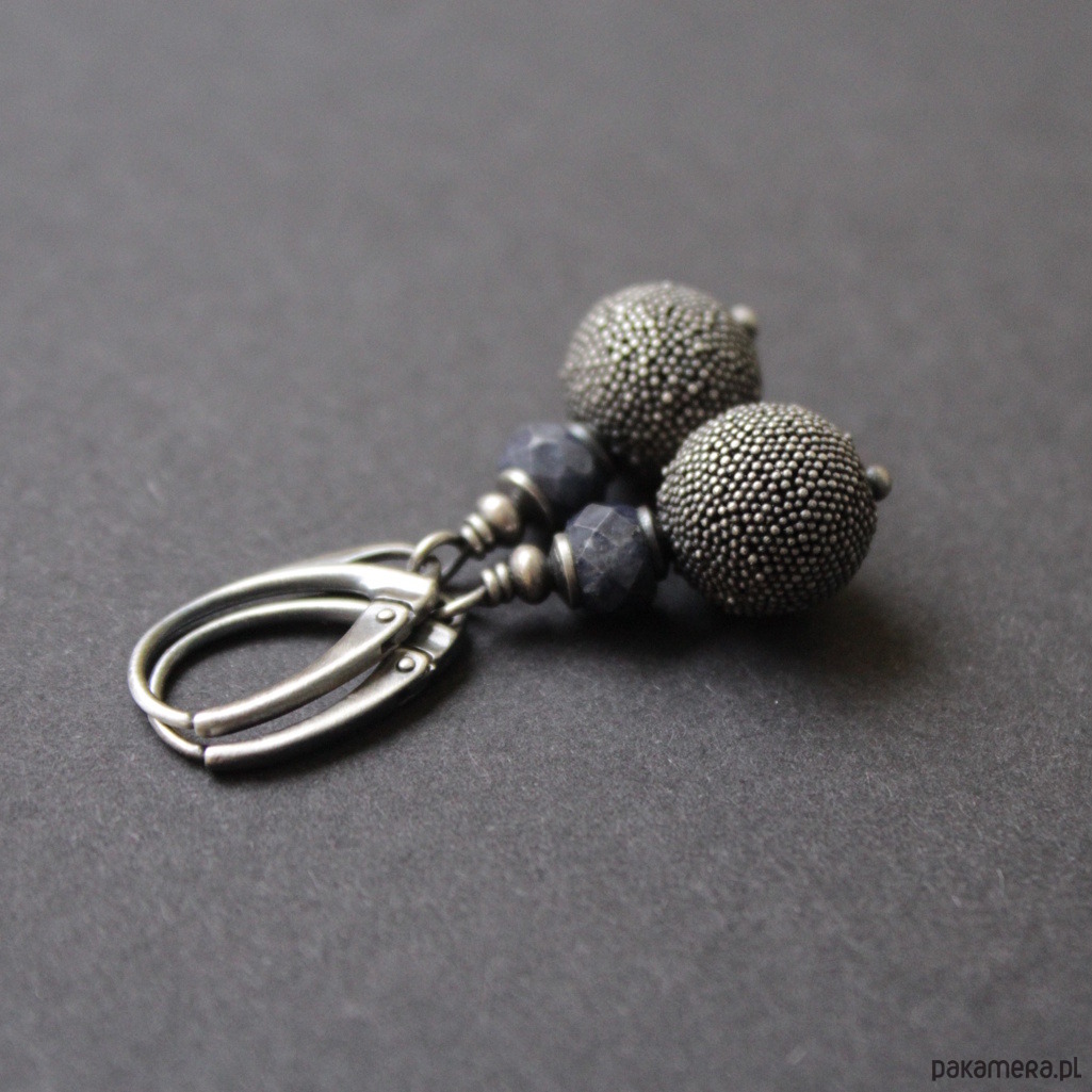 Głównym ozdobnikiem kolczyków jest srebrny ręcznie wykonany koral bali wielkości 1,4 cm w towarzystwie fasetowanych szafirów wielkości 0,7 cm.