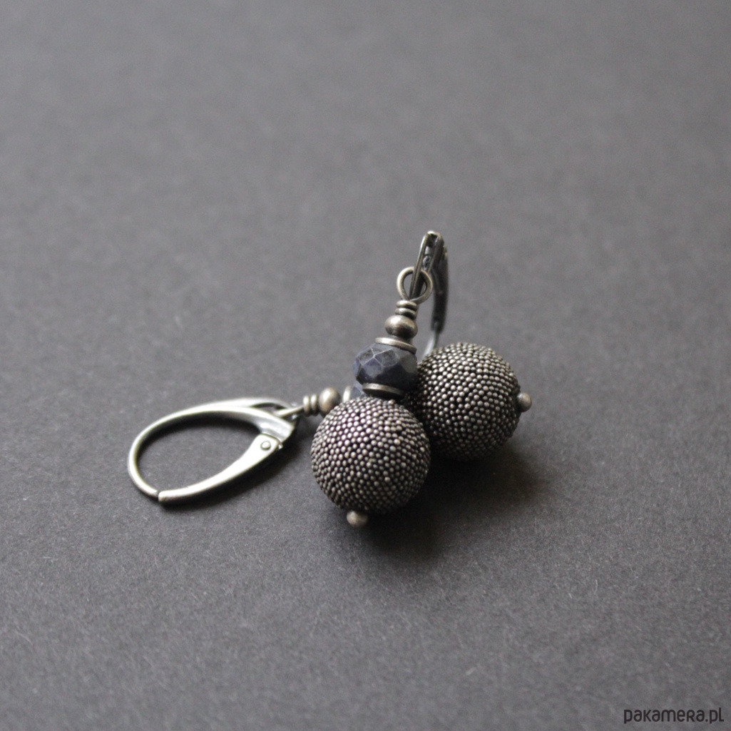 Głównym ozdobnikiem kolczyków jest srebrny ręcznie wykonany koral bali wielkości 1,4 cm w towarzystwie fasetowanych szafirów wielkości 0,7 cm.