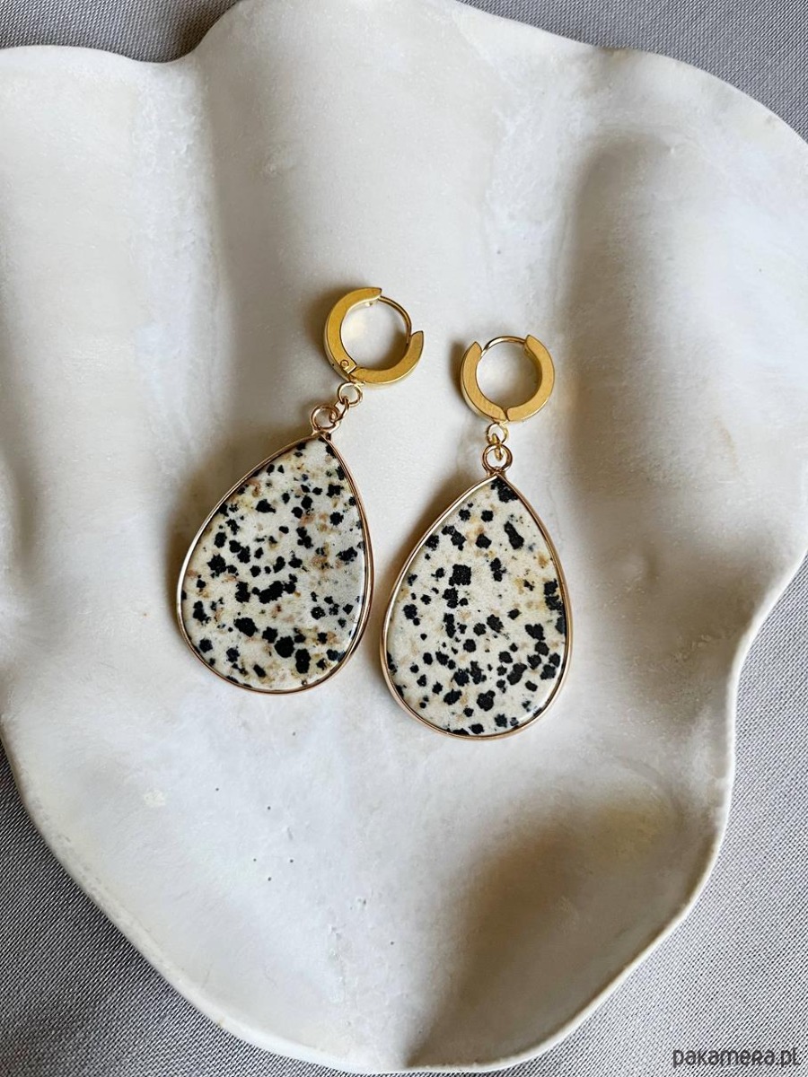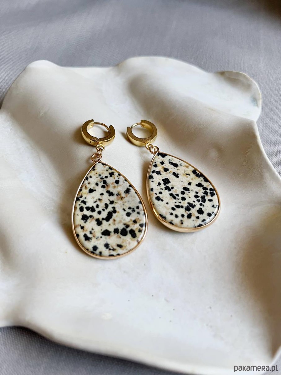 Klasyczne kolczyki na biglu z antyalergicznej stali chirurgicznej w kolorze złotym, zakończone dużą zawieszką z jaspisu dalmatyńskiego w kształcie łezki.