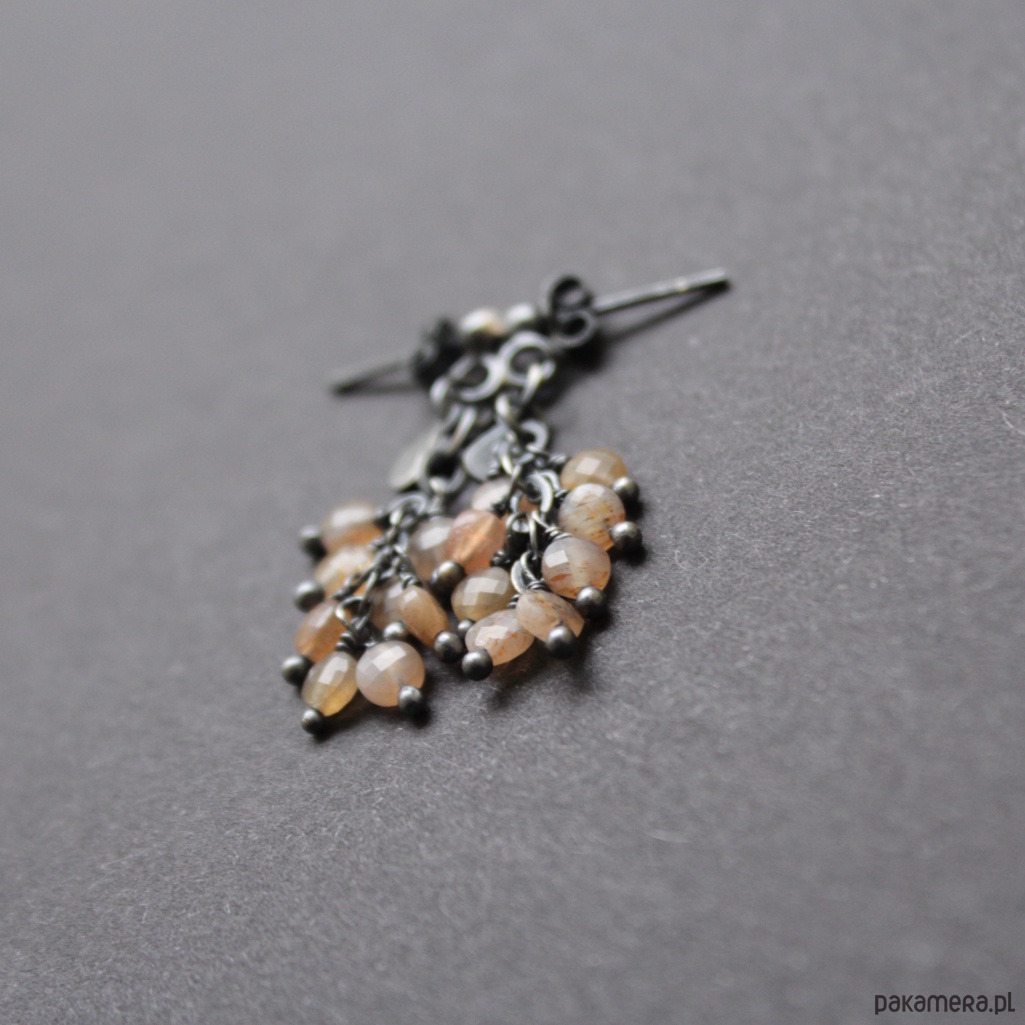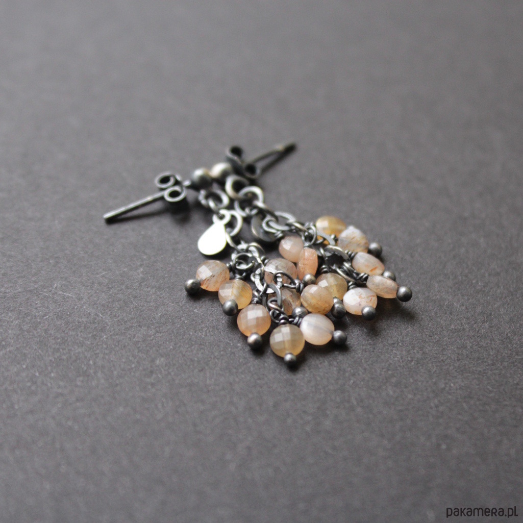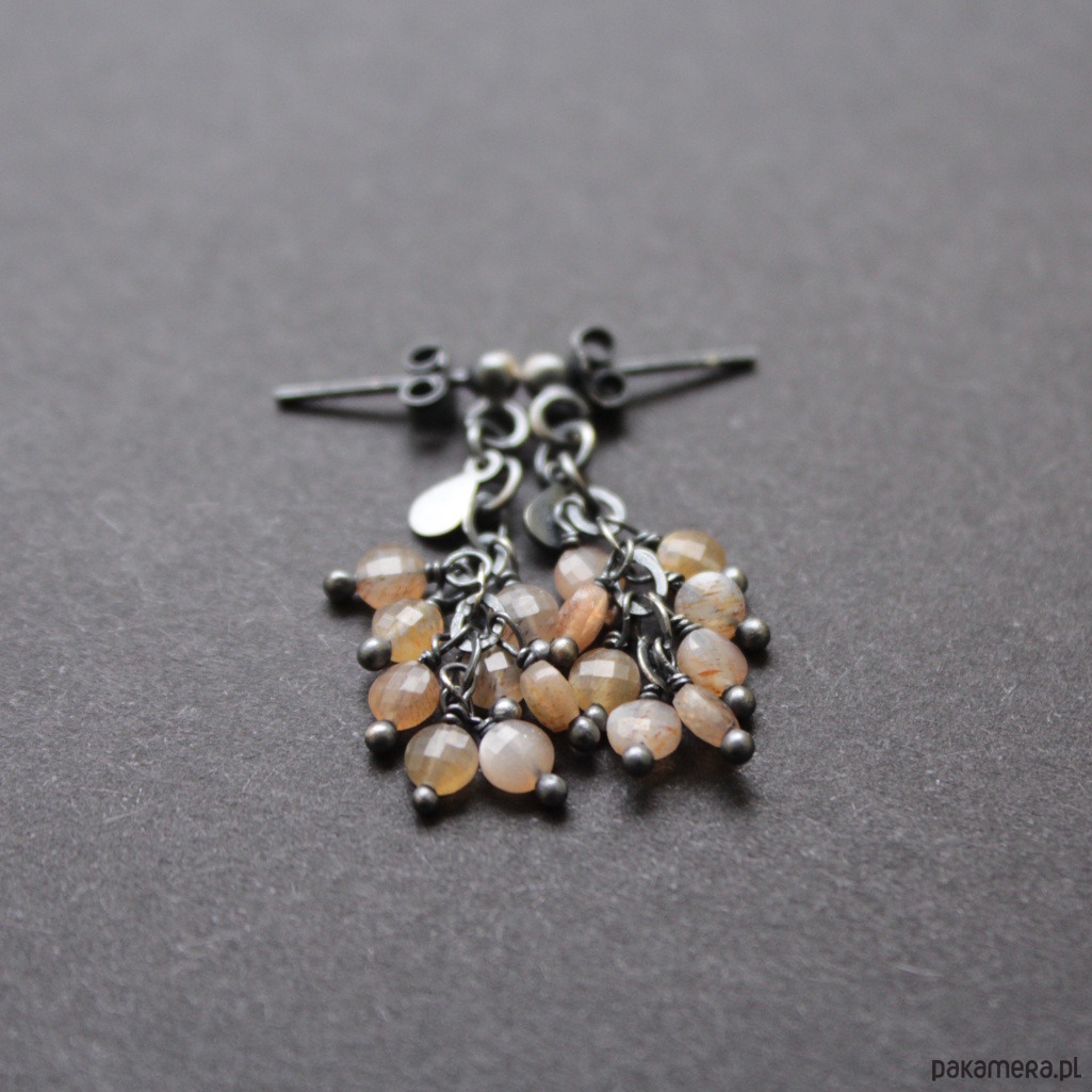 Kolczyki wykonane zostały z oksydowanego srebra próby 925 oraz fasetowanych kamienie słonecznych wielkości 0,4 cm.