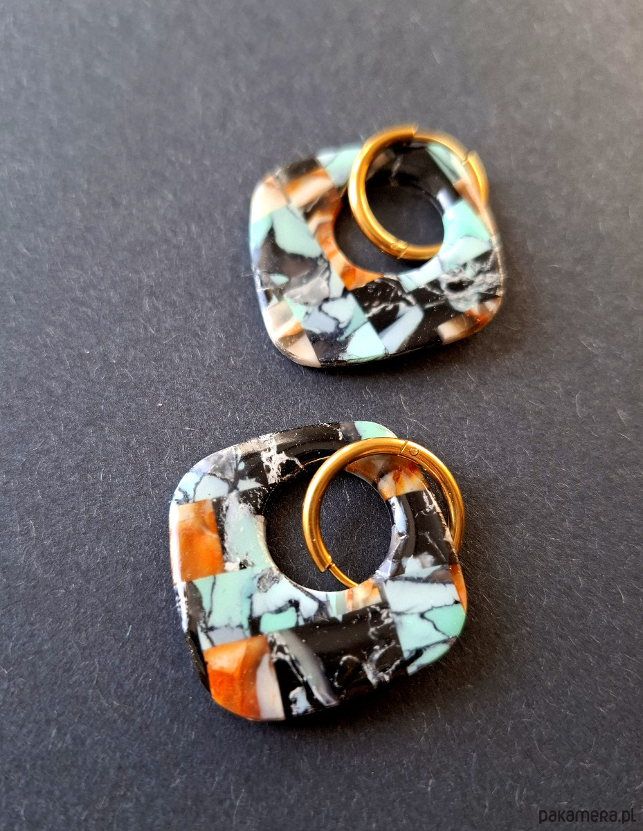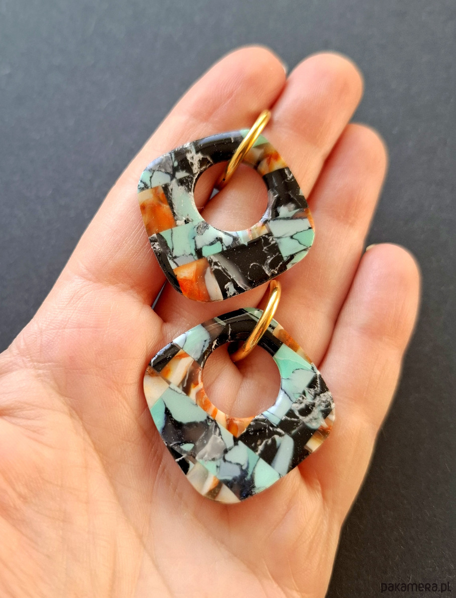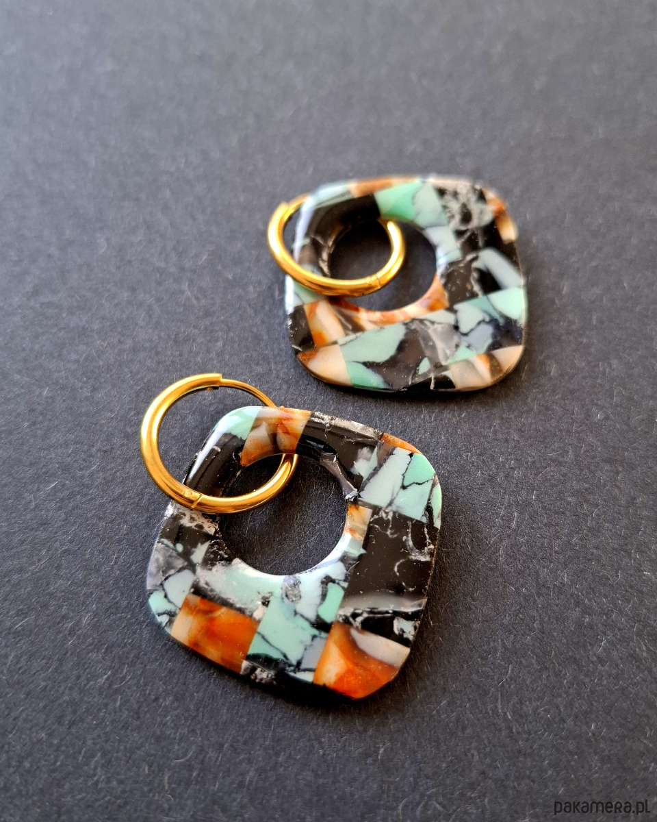 Kolczyki wiszące wykonane z wysokiej jakości glinki polimerowej z efektem półprzezroczystości. Bigle typu kajdanki - z zapięciem na zatrzask, pozłacane i nieuczulające ze stali szlachetnej. Kolczyki jednostronne i lekkie. Wymiary: długość całkowita - 4,5 cm, szerokość 3,5 cm. Wykonane w jedynym egzemplarzu.