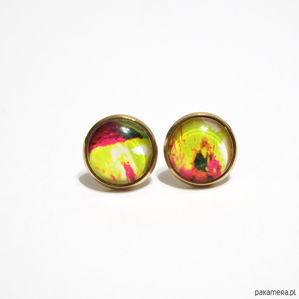 Grafika ukryta w prostych, eterycznych kolczykach, pod osłoną przeźroczystego półokrągłego szkiełka.