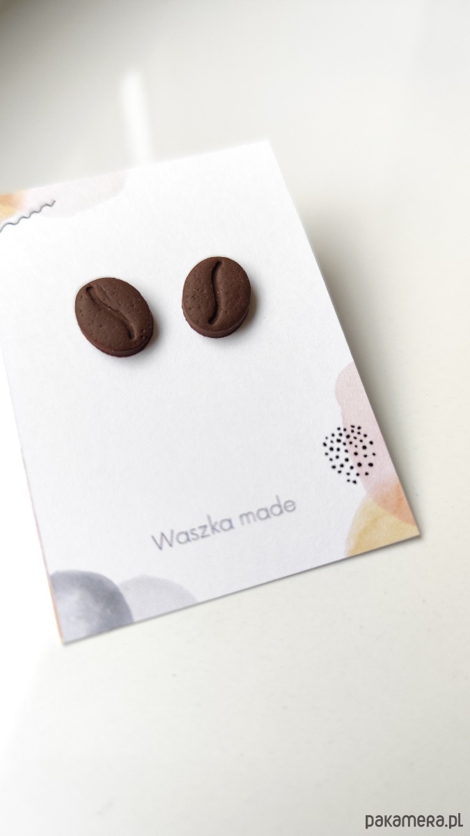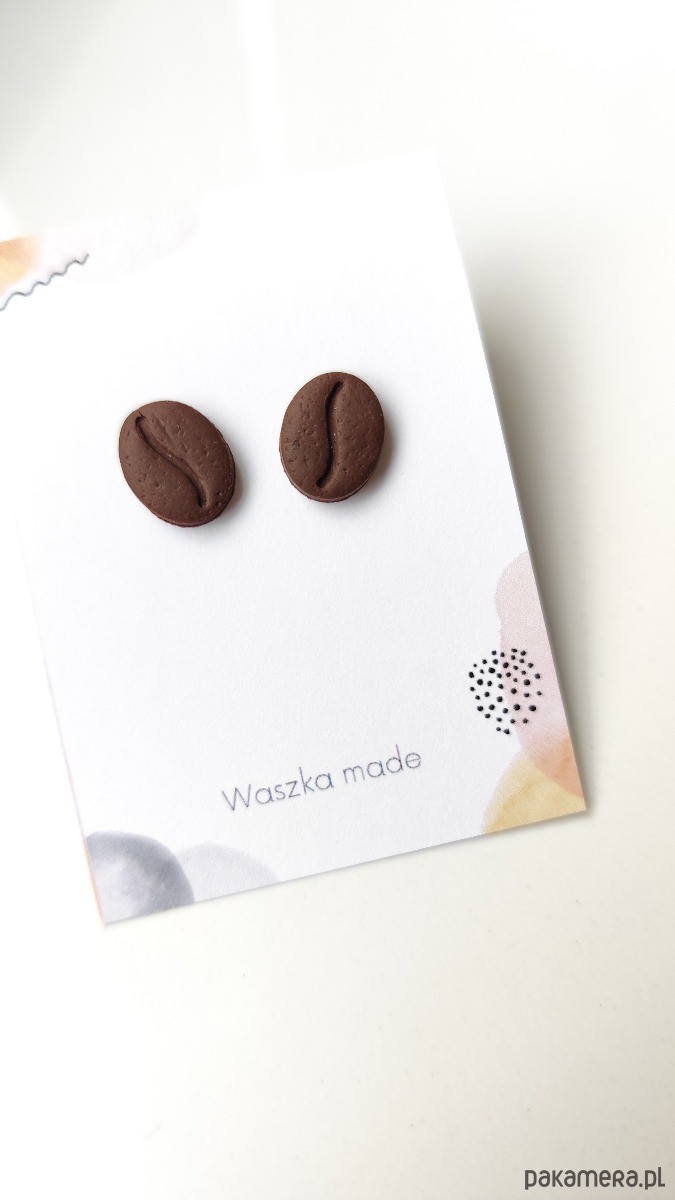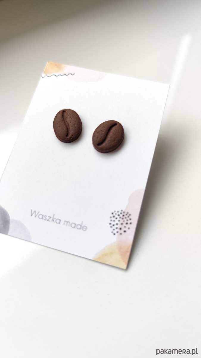 Kolczyki w kształcie ziarenek kawy, kolor ciemny brąz. Elementy metalowe to stal chirurgiczna.
