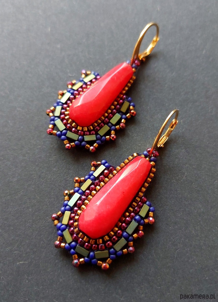 Kolczyki wiszące wykonane swoistą techniką haftu drobnymi, szklanymi koralikami w połączeniu ze szlifowanymi kroplami jadeitu oraz hematytami platerowanymi. Dwustronne, podwieszone na pozłacanych i nieuczulających biglach typu angielskiego. Wymiary: długość wraz z zapięciem: 5,6 cm; szerokość max. 2,8 cm. Wykonane w jedynym egzemplarzu.