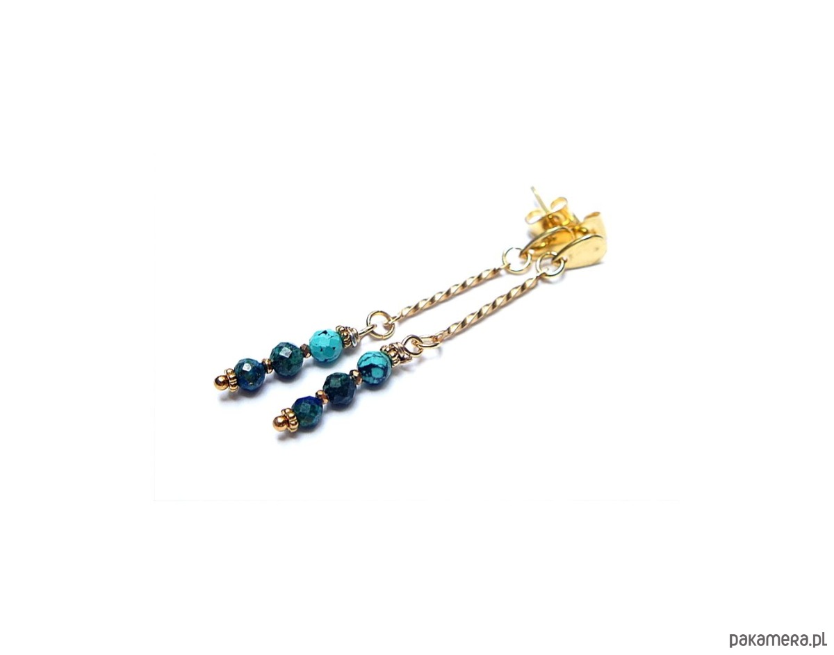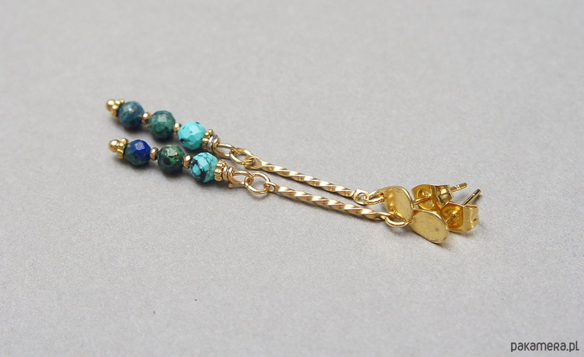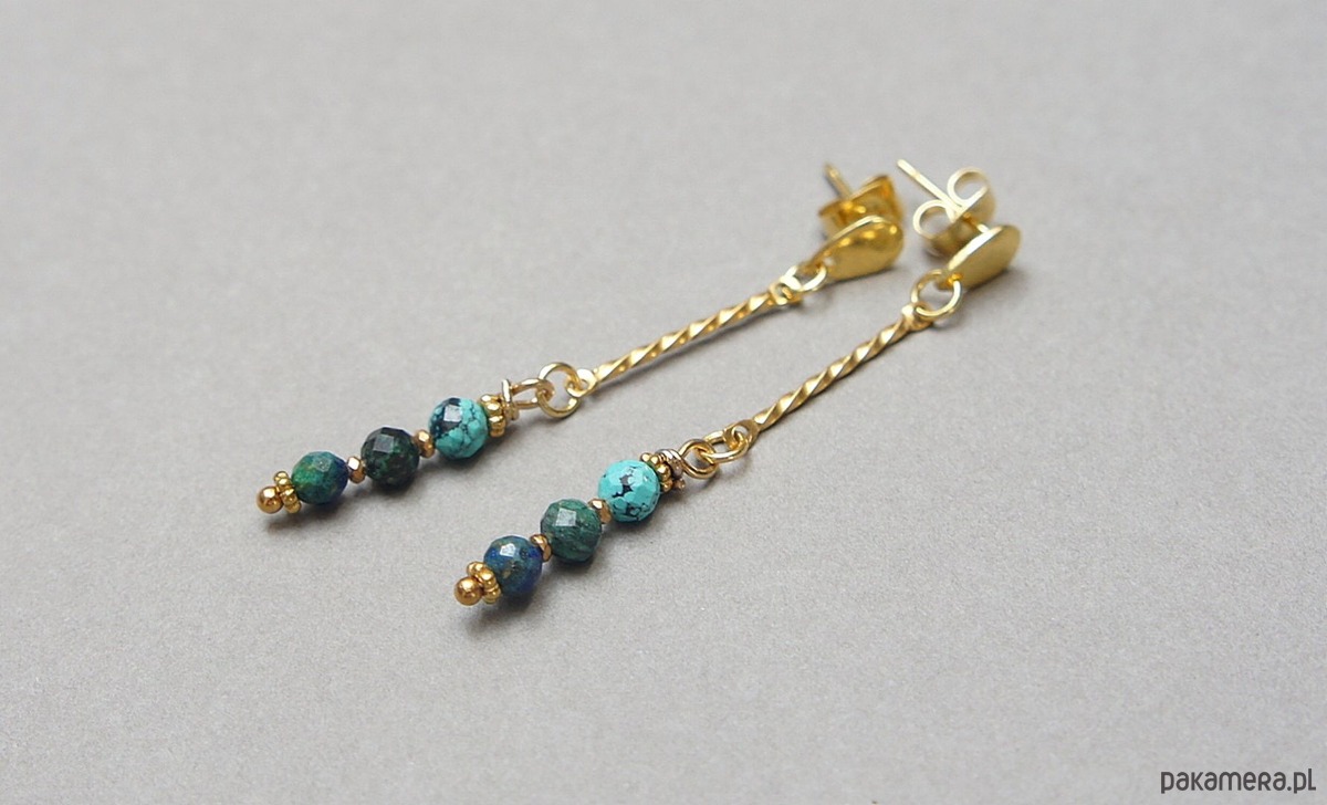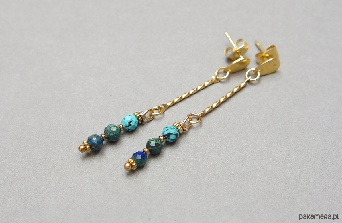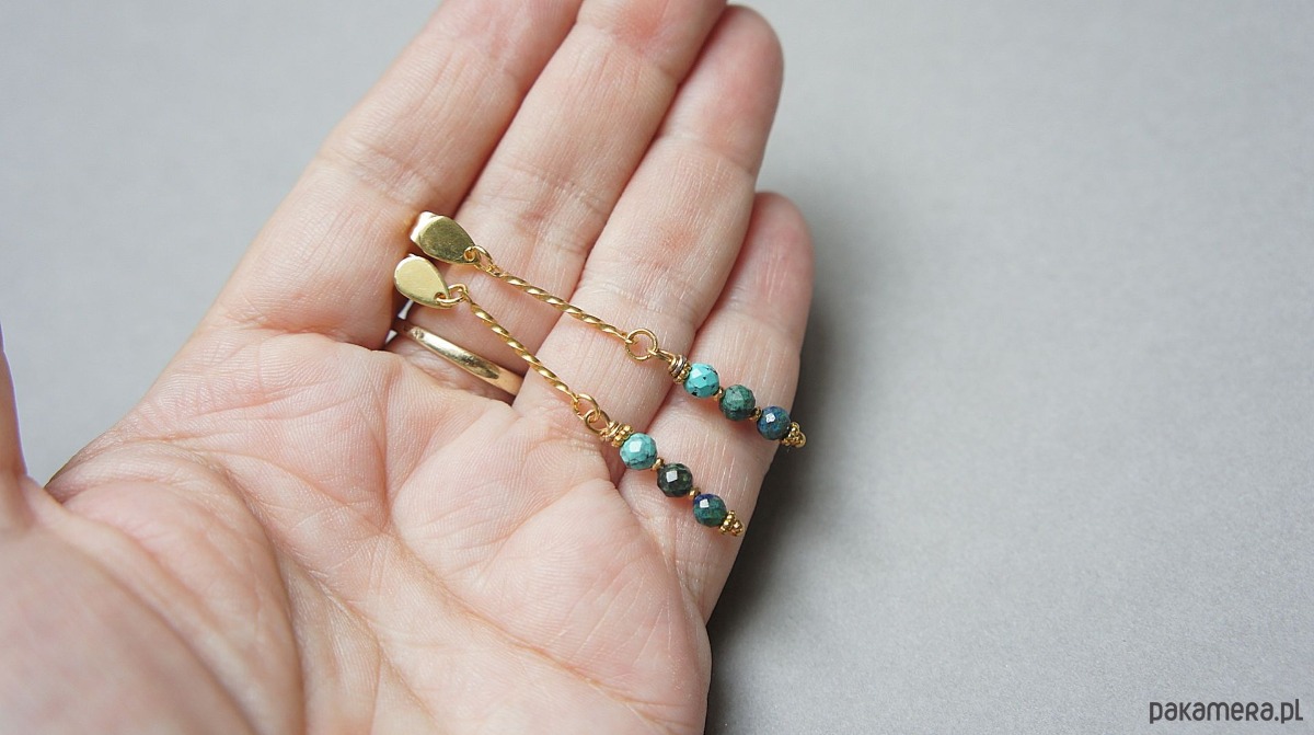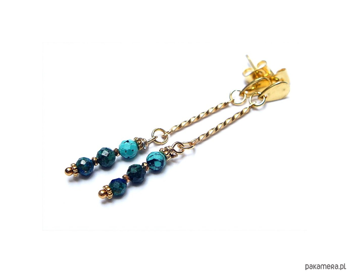 Długie, delikatne kolczyki wykonane z naturalnych, fasetowanych kamieni - szmaragdy, turkus, chryzokola [4mm] oraz z pozłacanej stali szlachetnej. Długość kolczyków: ok. 5,2cm. Biżuteria ozdobnie zapakowana.