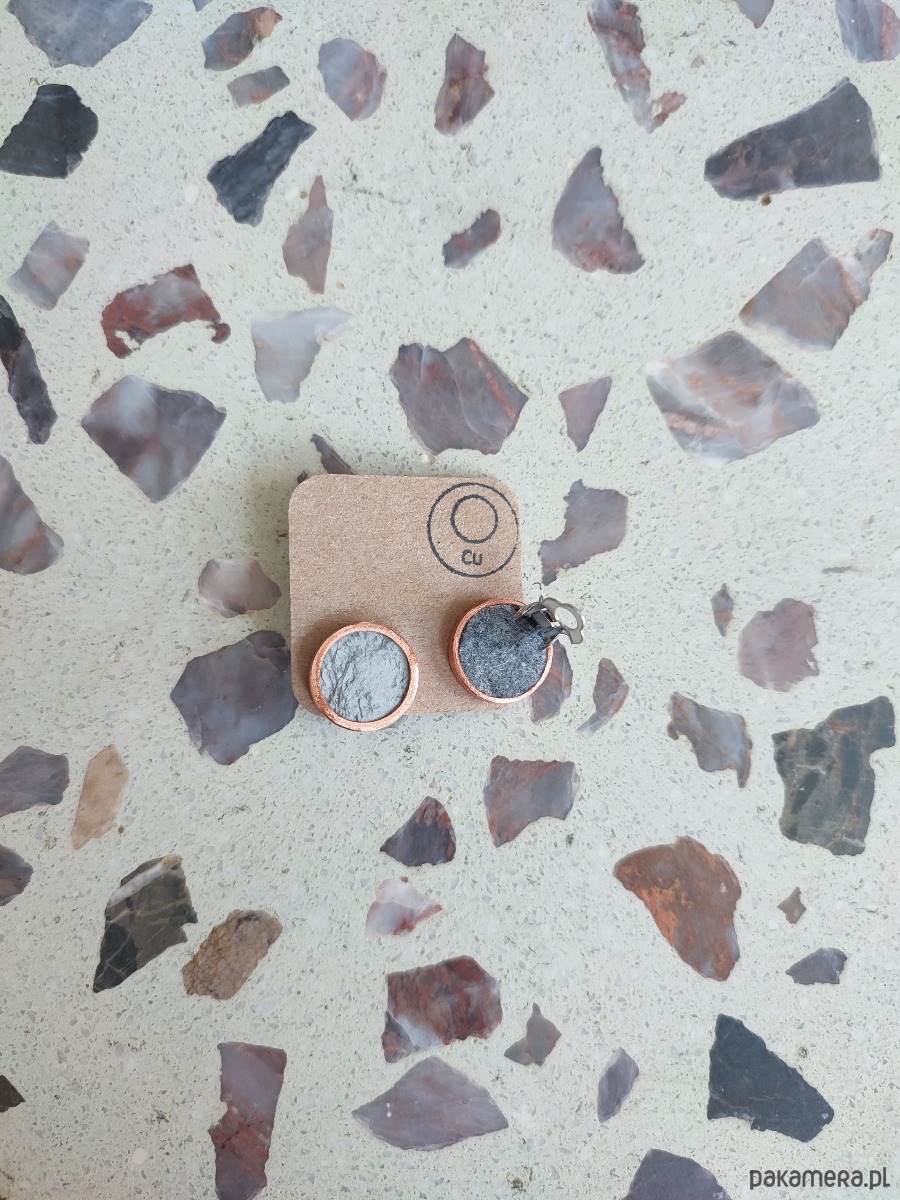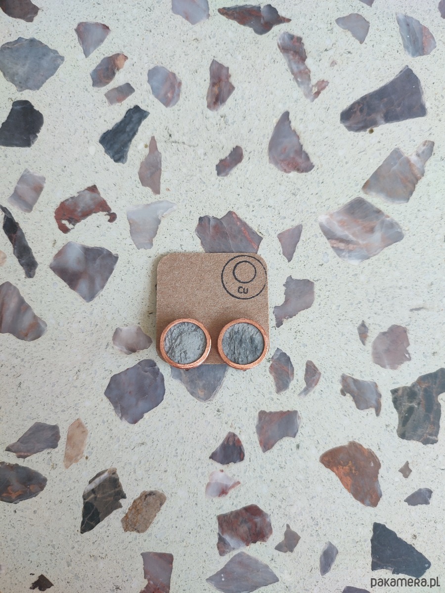 Kolczyki klipsy wykonane z rurki miedzianej i forniru kamiennego. Średnica klipsa 15 mm.