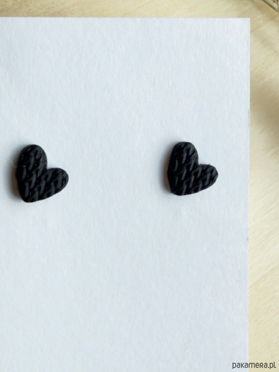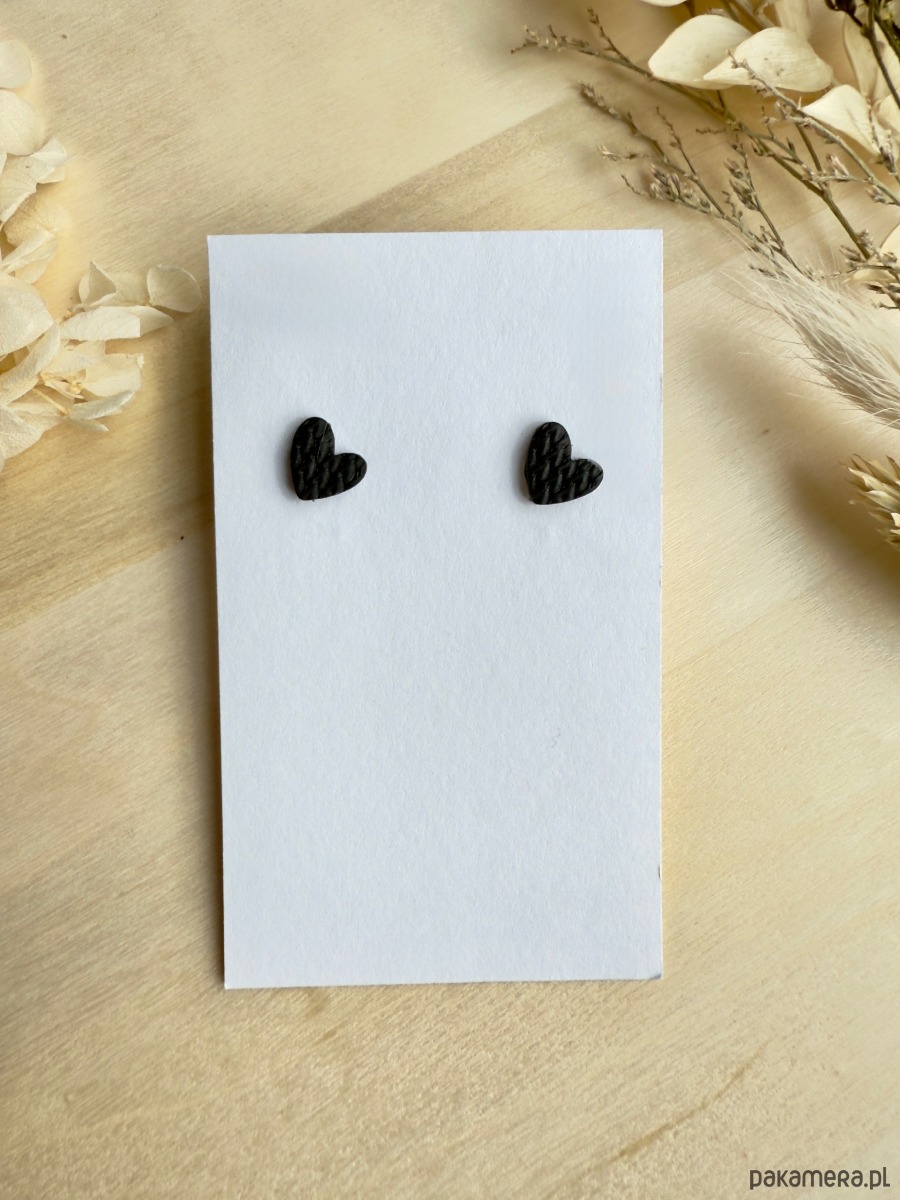 Te kolczyki to minimalistyczne, ręcznie wykonane sztyfty z czarnymi serduszkami z gliny polimerowej o wymiarach 1 cm, na stalowych sztyftach ze stali chirurgicznej – idealne także dla wrażliwych uszu.