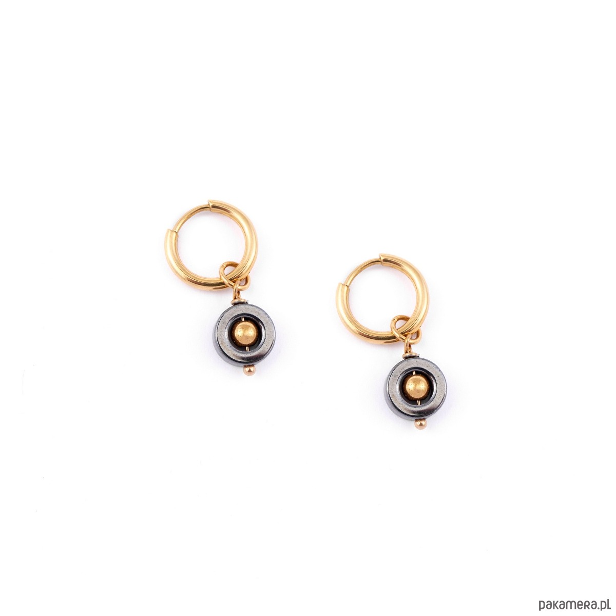 Poznaj naszą nowość! Pozłacane kolczyki koła w połączeniu z grafitową oponką z Hematytu w której środku znajduje się kuleczka: do wyboru kamień w kolorze złotym - wykonany z Hematytu, bądź kamień w kolorze czarnym - wykonany z Turmalinu. Całość tworzy niepowtarzalną stylizację.Hematyt to kamień wojowników. Silnie oczyszcza krew. Budzi radość do życia, dodaje odwagi i wiary we własne umiejętności.Turmalin to kamień ochrony. Jest wyjątkowym kamieniem, który zapewnia ochronę przed tzw. „złym okiem” czyli zazdrością, szkodliwymi intencjami oraz innymi rodzajami negatywnych wpływów takich jak obawy, strach, złość.