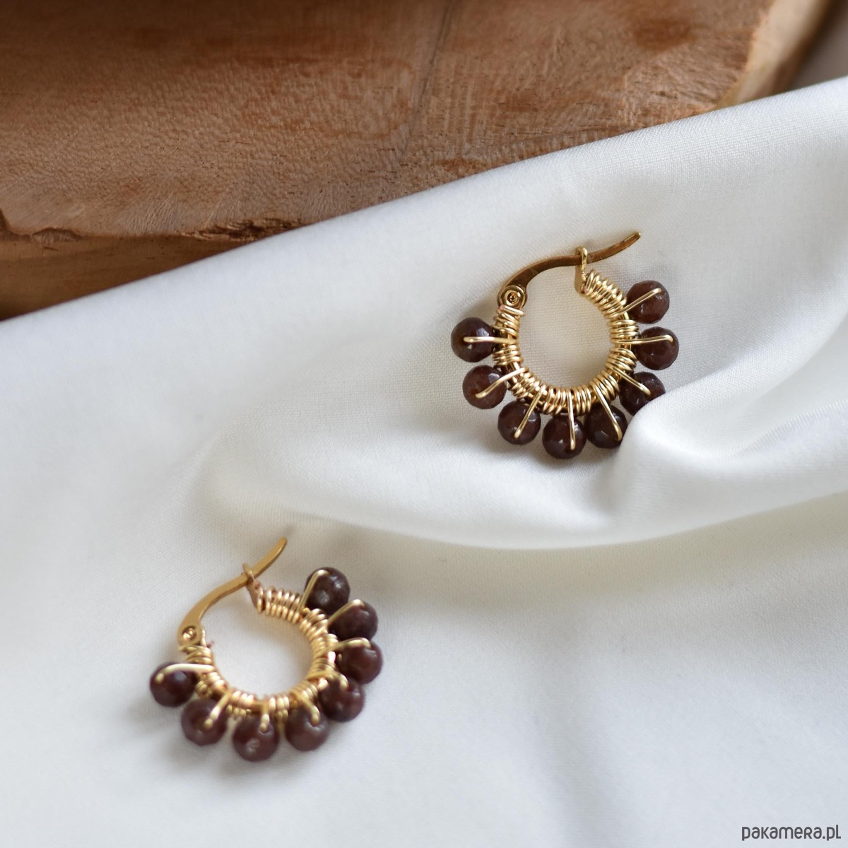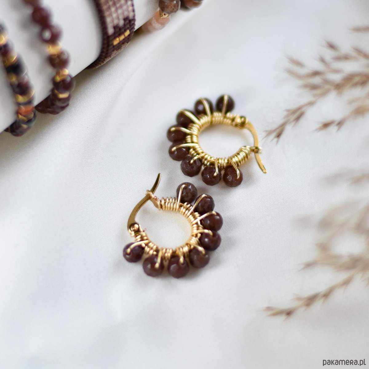 Subtelne, ręcznie wykonane kolczyki z delikatnie fasetowanych kulek brązowego awenturynu. Kamienie mają stonowany, naturalny połysk — ich szlif jest bardzo subtelny, dzięki czemu nie odbijają mocno światła, zachowując elegancki i spokojny charakter.