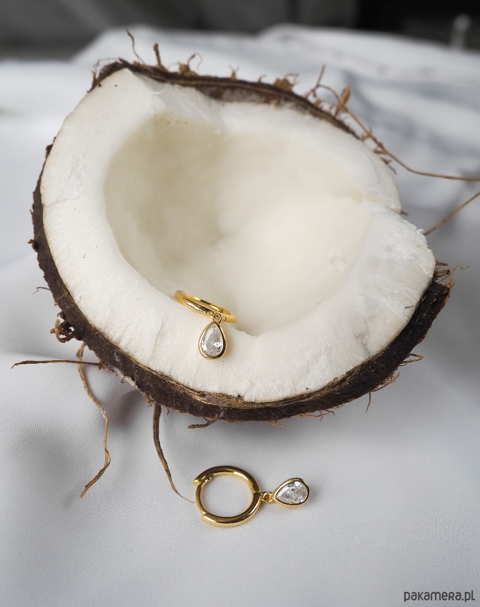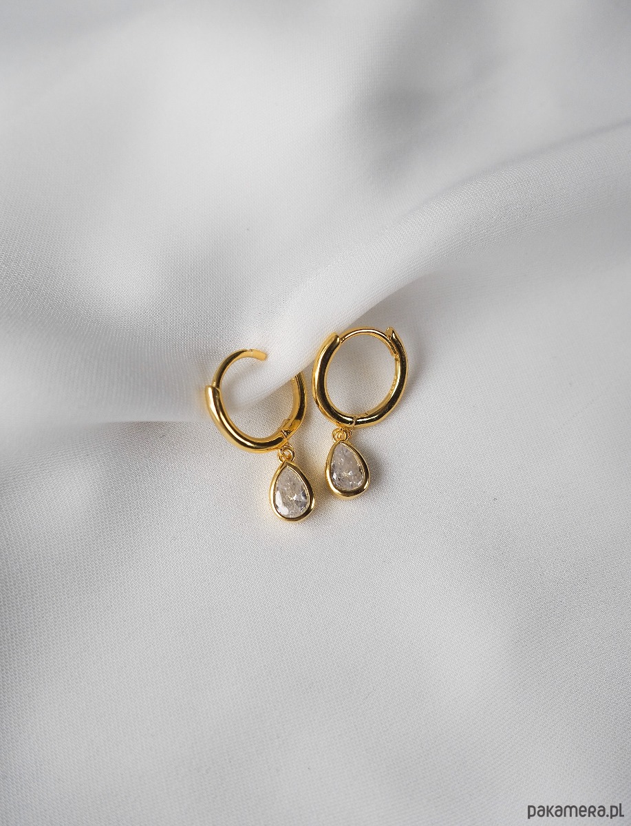 Modne kolczyki koła z dodatkiem białej cyrkonii w kształcie kropelki. Wykonane ze srebra o próbie 925 pozłacane 24- karatowym złotem.