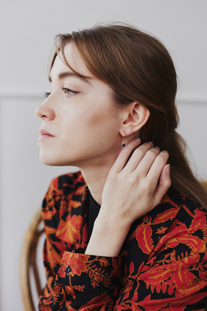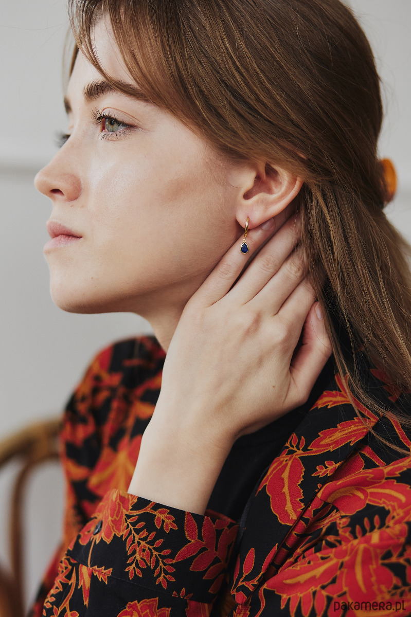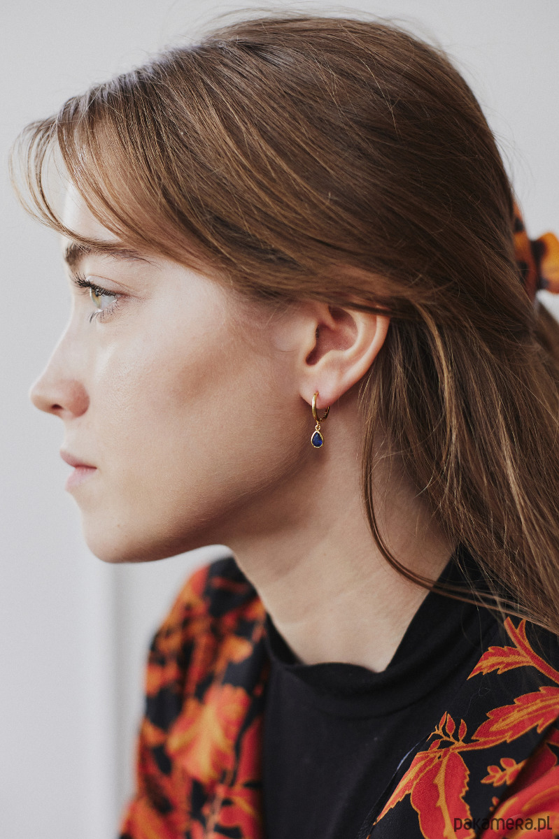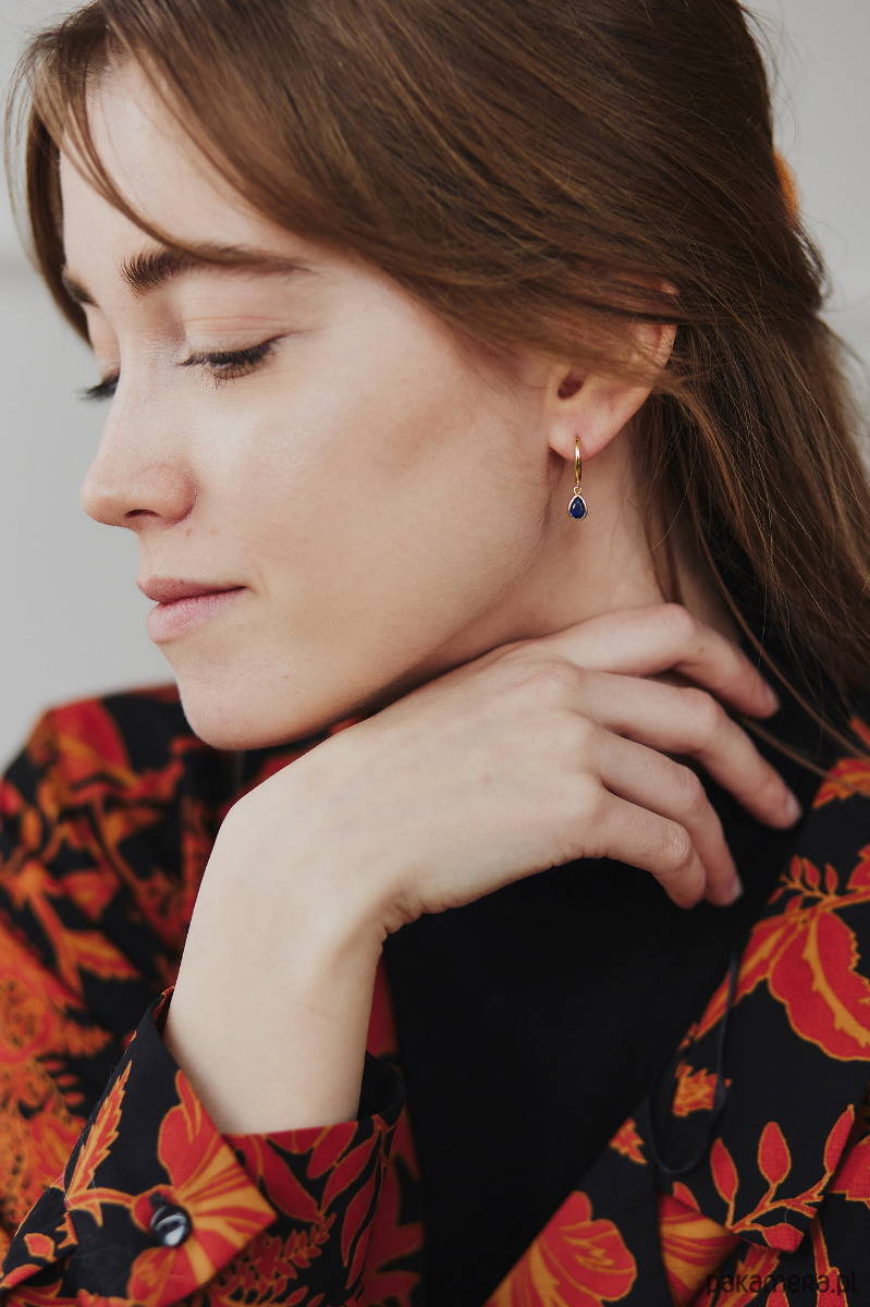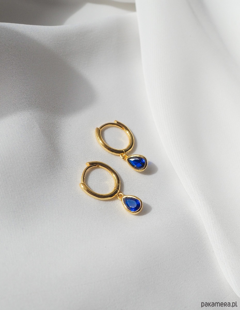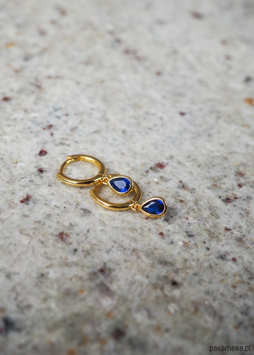 Modne kolczyki koła z dodatkiem niebieskiej cyrkonii w kształcie kropelki. Wykonane ze srebra o próbie 925 pozłacane 24- karatowym złotem.