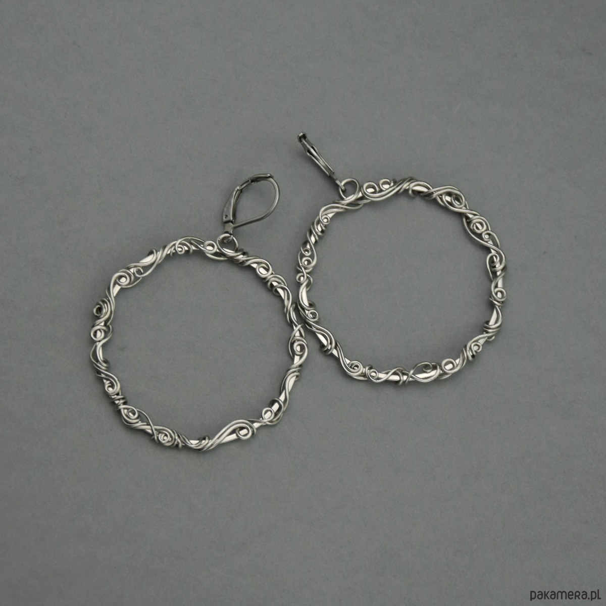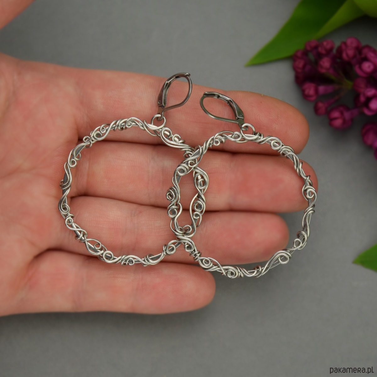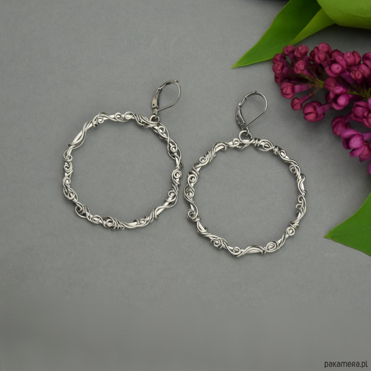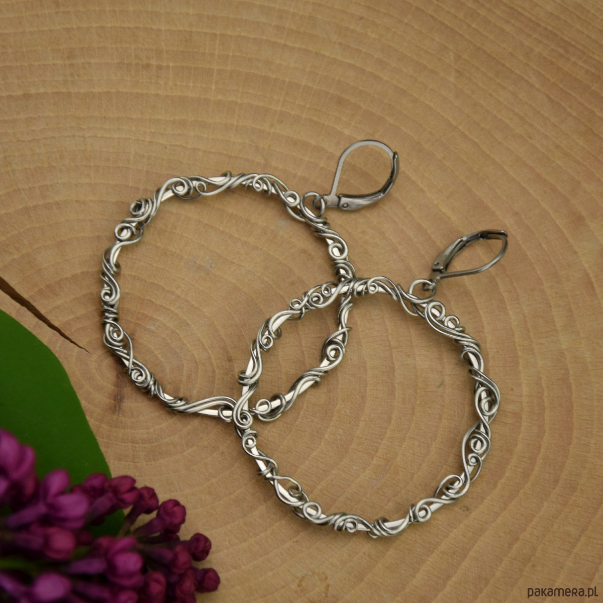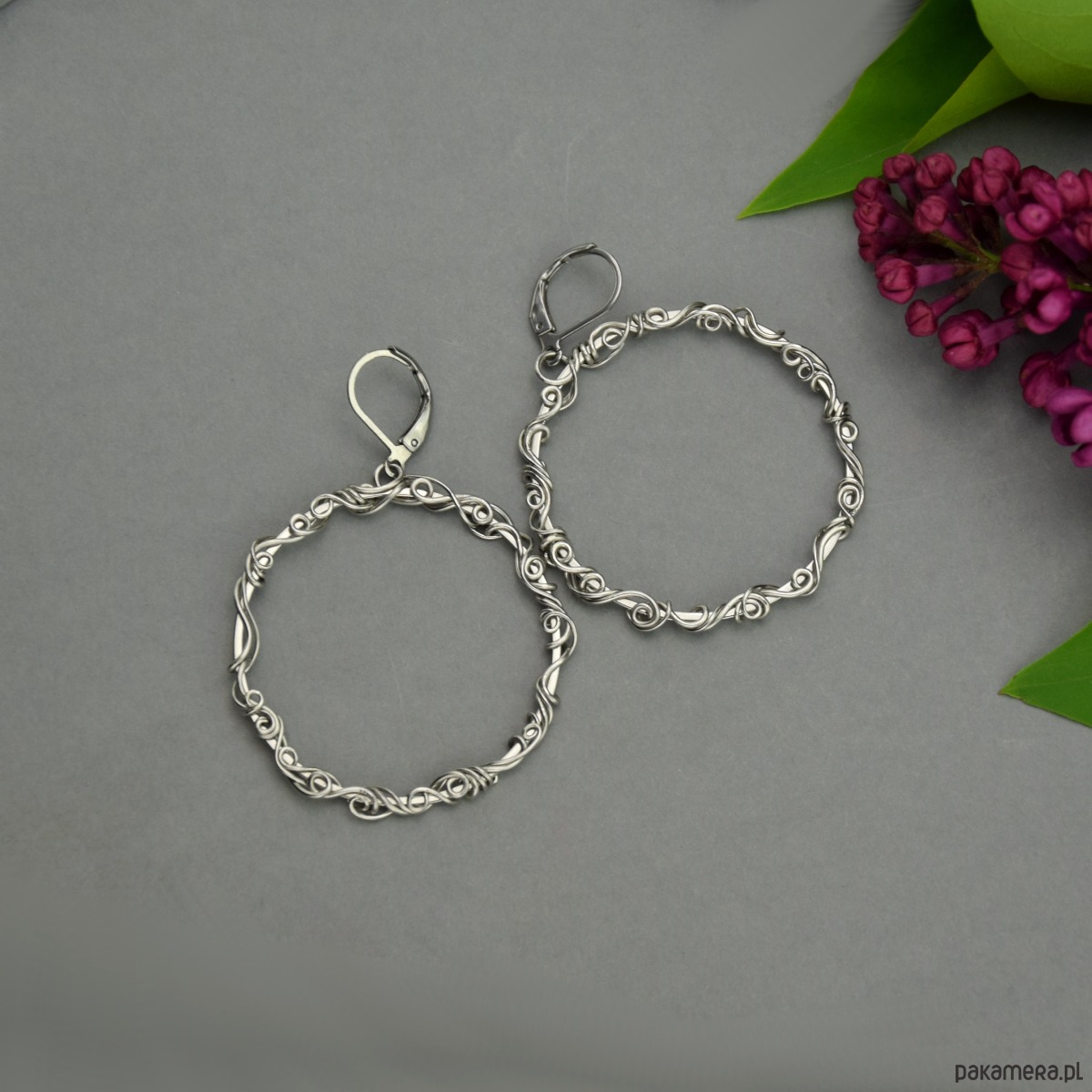 Oryginalne kolczyki koła wykonane techniką wire wrapping ze stali chirurgicznej. Kolczyki są unikatowe, ręcznie oplatane i różnią się od siebie. Całkowita długość kolczyków (z biglami) 6 cm. Średnica koła około 4cm. Kolczyki wysyłane są losowo. Na zdjęciach przedstawione są przykładowe kolczyki.