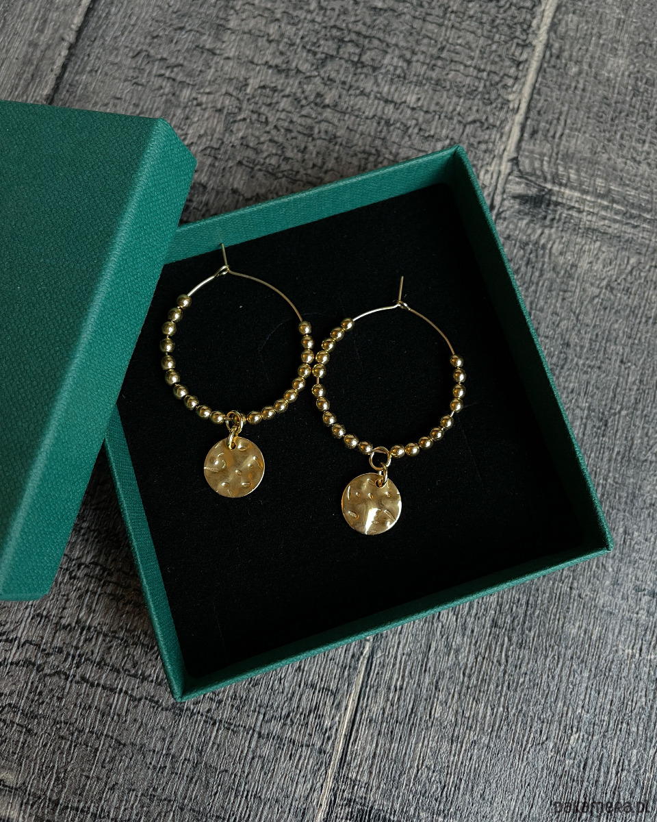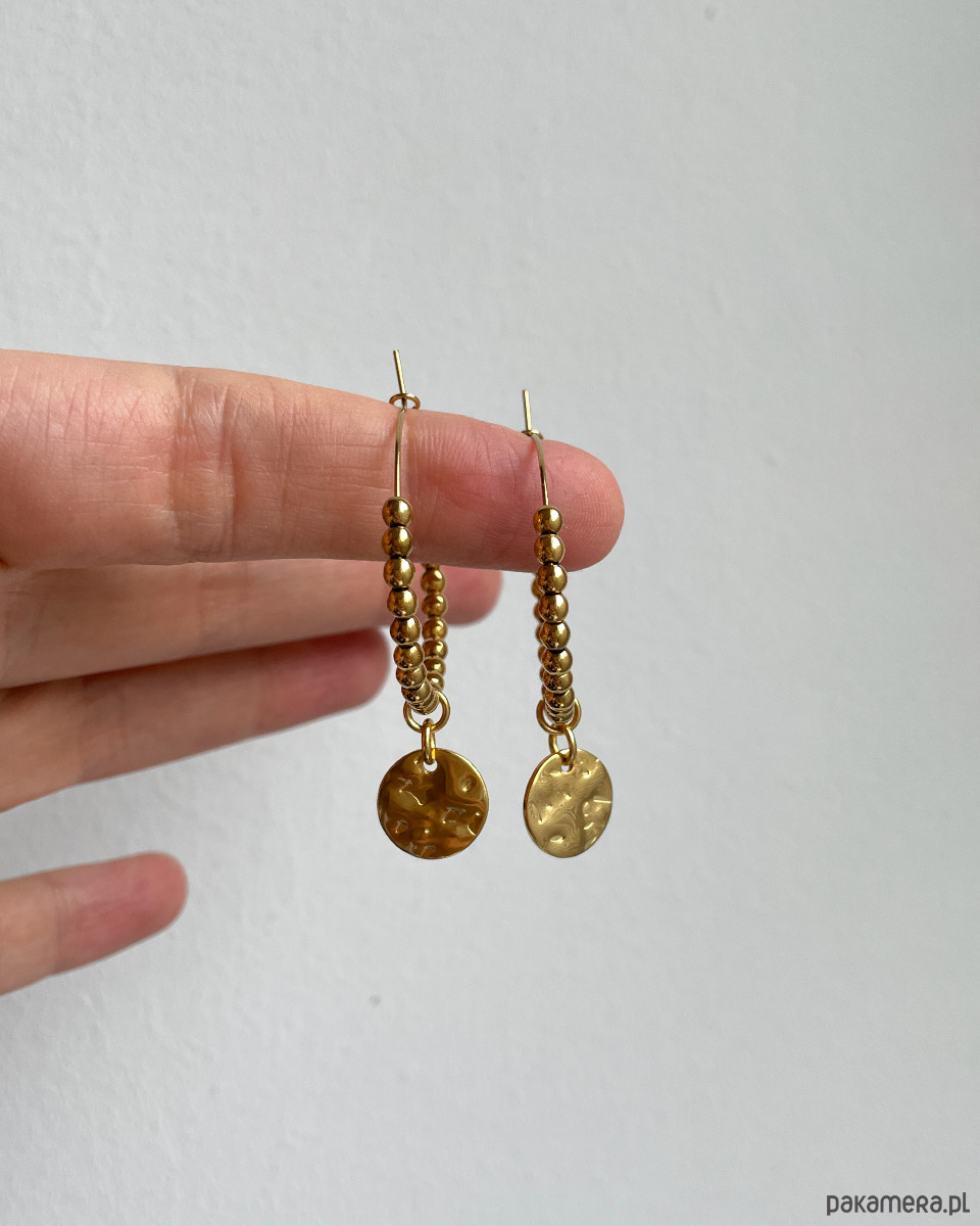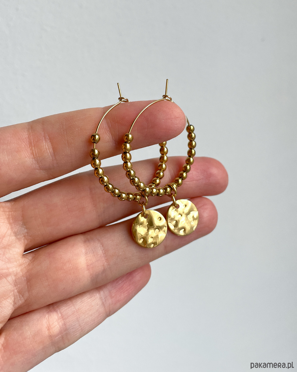 Ozdobne kolczyki koła z blaszkami o nieregularnej powierzchni i kuleczkami ze złotego HEMATYTU. Druciki i blaszki wykonane są ze STALI SZLACHETNEJ. Do kolczyków dodaję silikonowe zatyczki (tzw. baranki) aby dodatkowo zabezpieczyć kolczyk przed odpięciem.