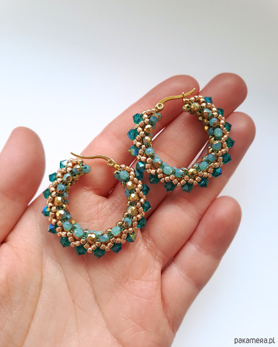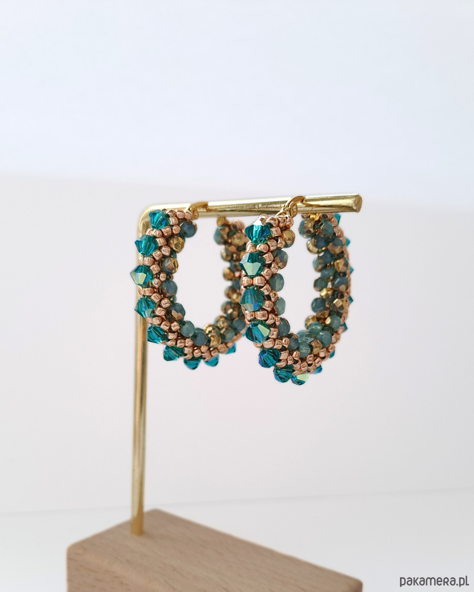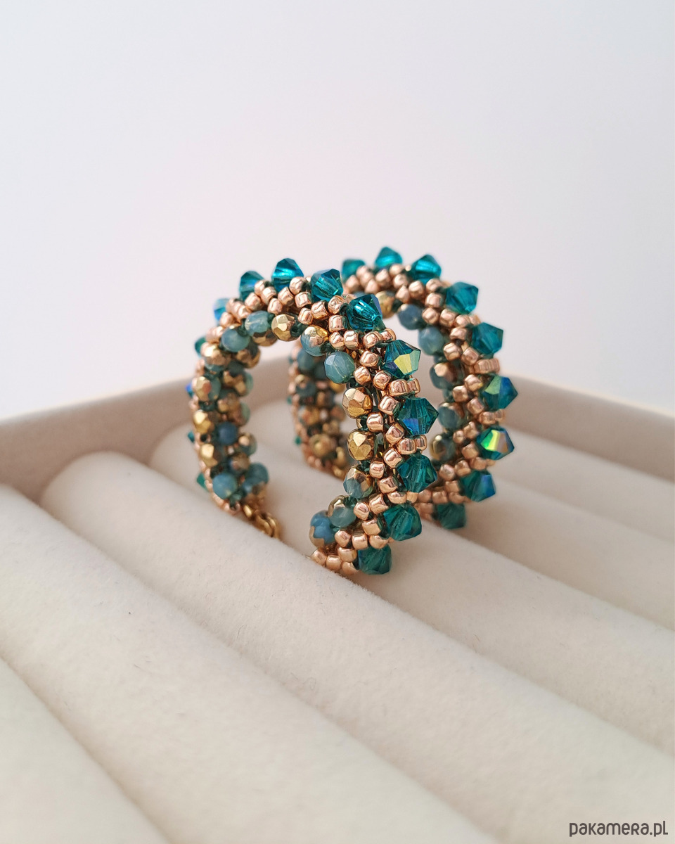 Największą rolę grają tu kryształki Preciosa 4 mm w kolorze Blue Zircon – nasycone, pełne życia i pięknie odbijające światło. Ich chłodny, morski odcień kontrastuje ze złotem, tworząc harmonijne i bardzo stylowe zestawienie.