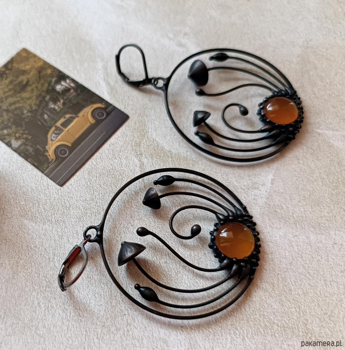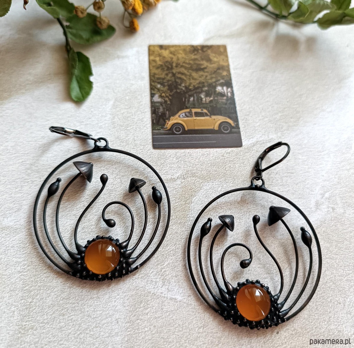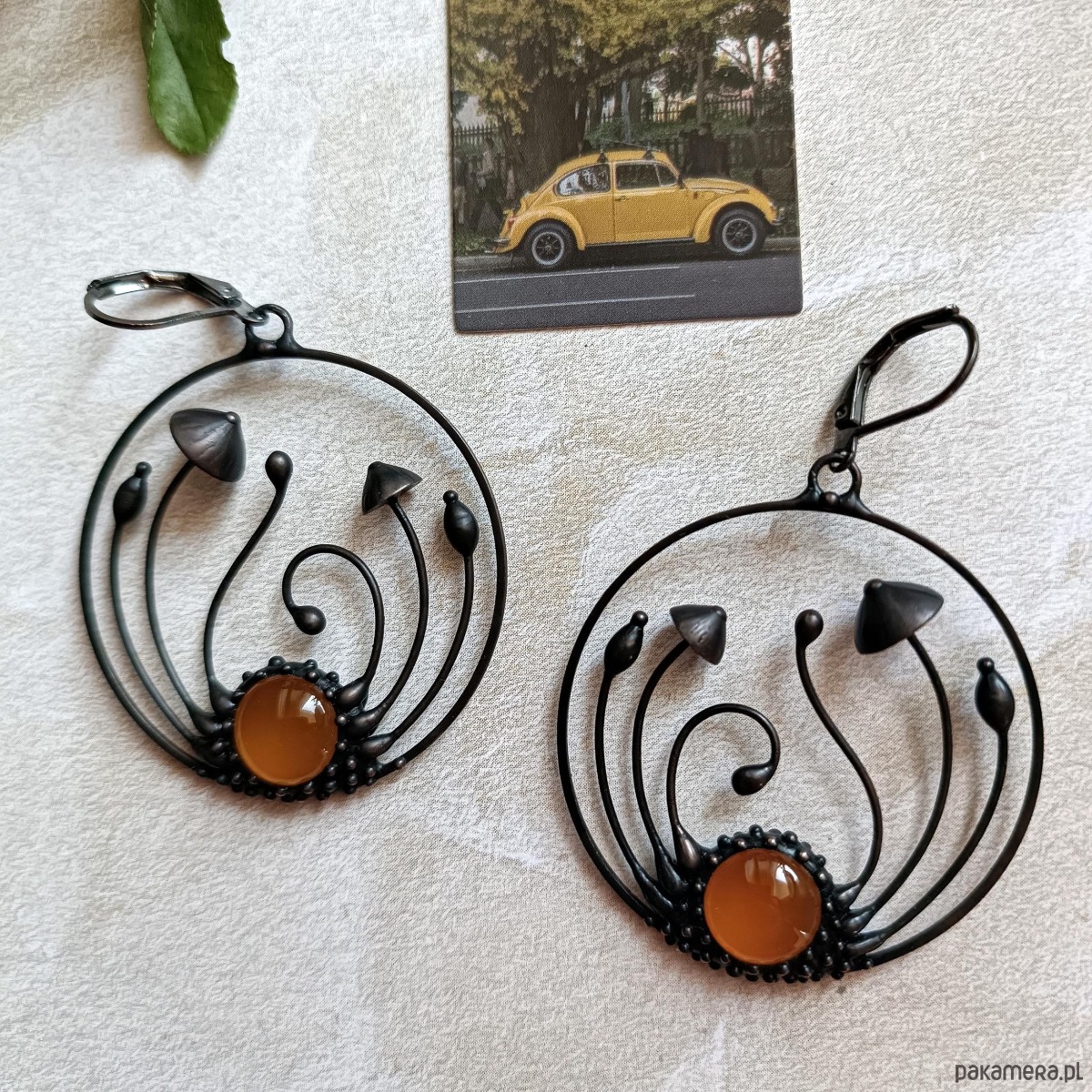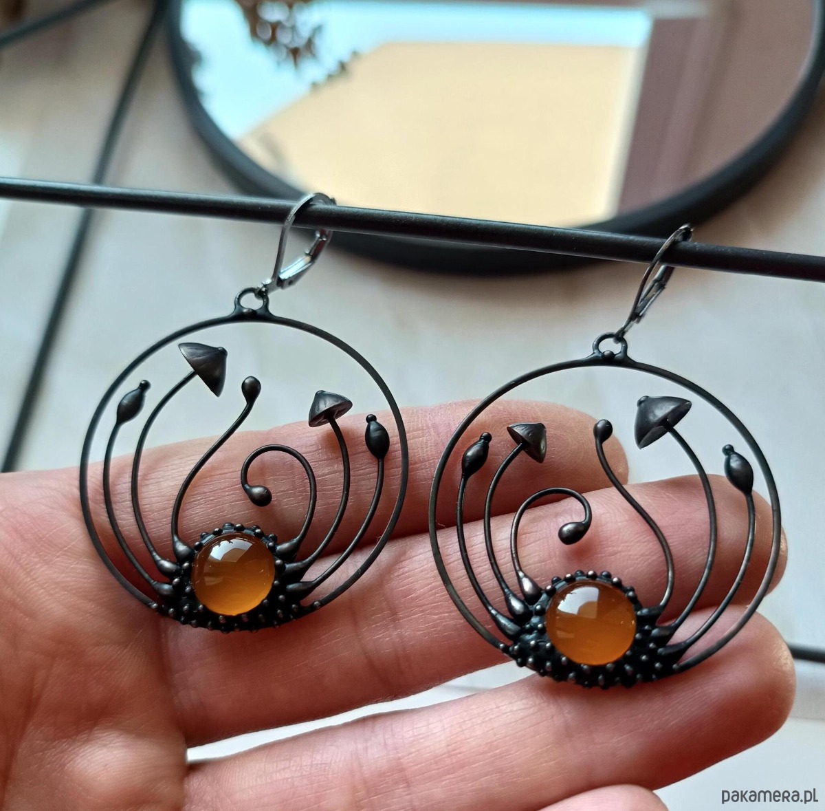 Te kolczyki koła w stylu boho „Mushroom Rings” zostały ręcznie wyrzeźbione z miedzi, cyny, stali i żółtych kamieni agatowych. Pokryte patyną i pokryte środkiem przeciwutleniającym, wyszlifowane, wypolerowane. Średnica 4 cm. Są lekkie i cienkie.