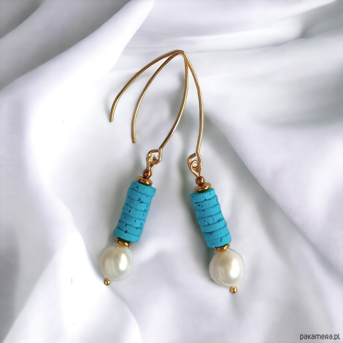 Kolczyki zostały wykonane z krążków turkusowej, porowatej lawy (ok.6mm), przepięknych , naturalnych pereł (ok. 10mm) przekładek ze złotego hematytu.