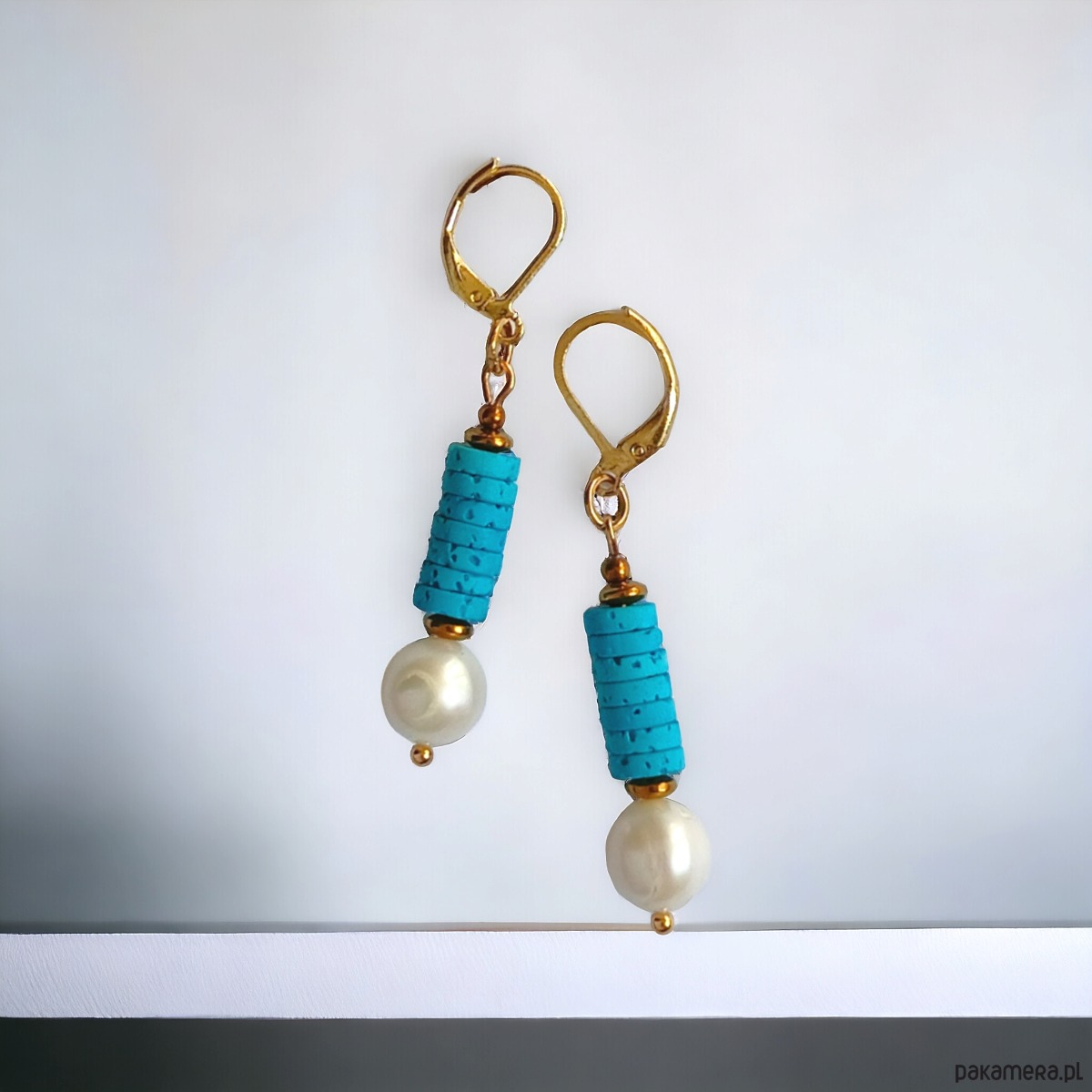 Kolczyki zostały wykonane z krążków turkusowej, porowatej lawy (ok.6mm), przepięknych , naturalnych pereł (ok. 10mm) przekładek ze złotego hematytu.