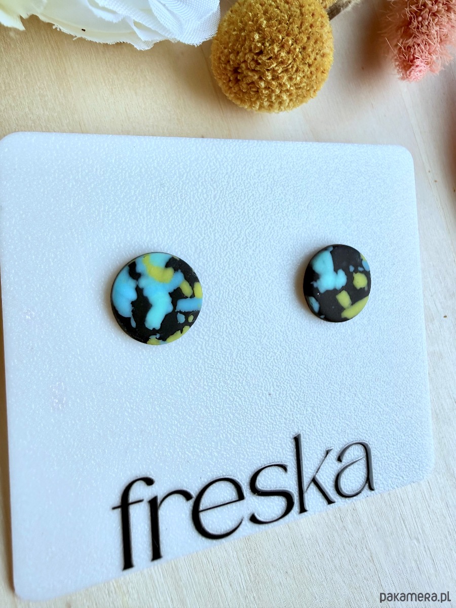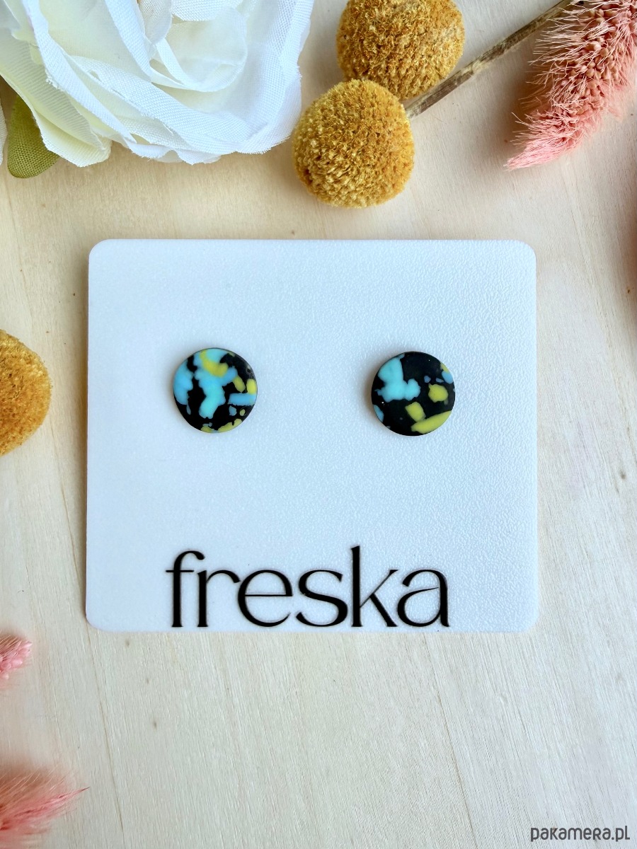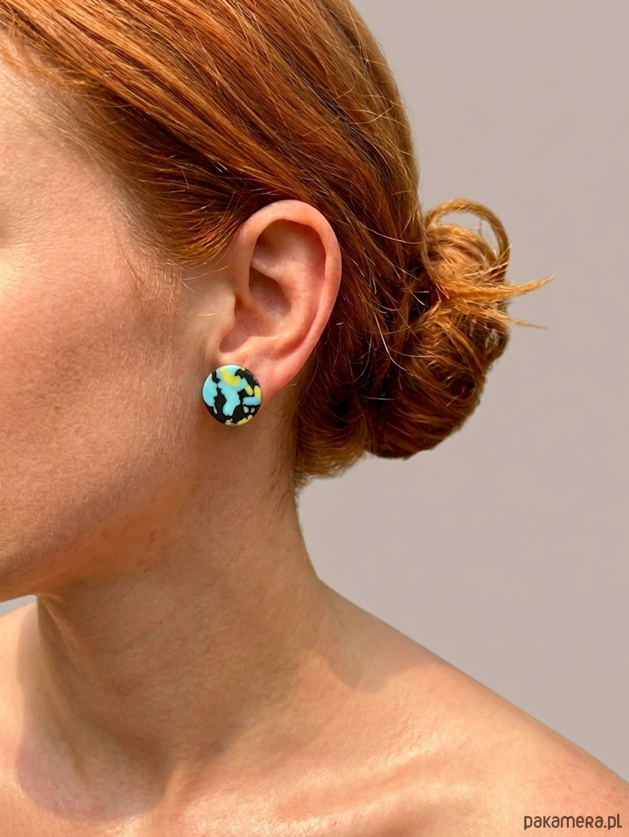 Kolczyki powstają w krótkich, autorskich seriach, dlatego rozmieszczenie kolorowych plamek może minimalnie różnić się między parami, co podkreśla ich unikatowy charakter. Sztyfty ze stali chirurgicznej są hipoalergiczne i odporne na codzienne użytkowanie, dzięki czemu kolczyki dobrze sprawdzą się także u osób z wrażliwą skórą.