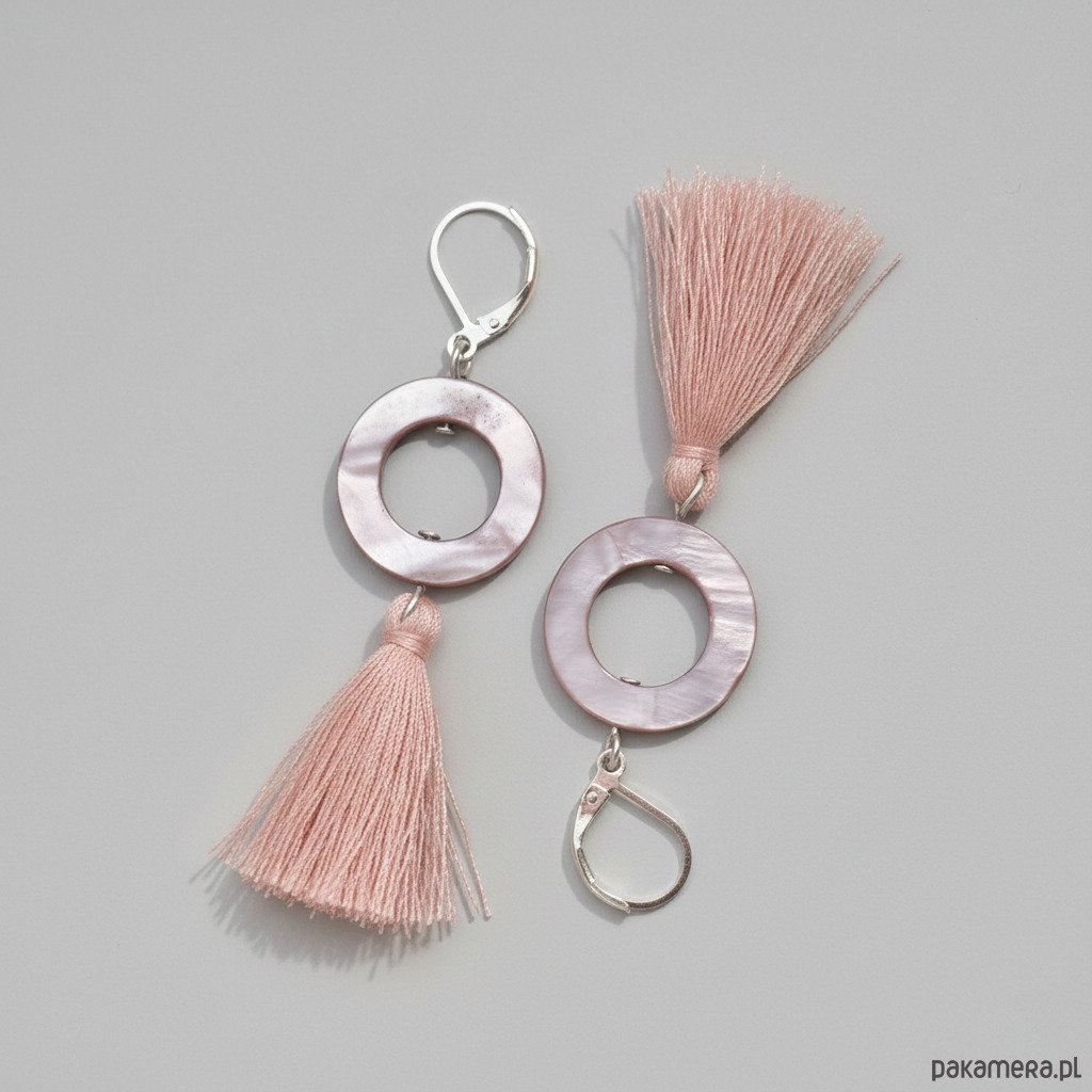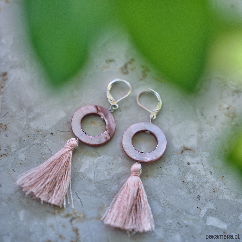 Kolczyki w kształcie kółek wykonane z masy perłowej, zdobione chwostami w kolorze pudrowego różu, to idealny dodatek dla kobiet lubiących styl boho. Doskonale komponują się z koronkami i falbanami, a dla Panny Młodej stanowią ciekawą alternatywę dla klasycznych kolczyków. Kolczyki są unikatowe, więc możesz mieć pewność, że nosić będziesz coś wyjątkowego.