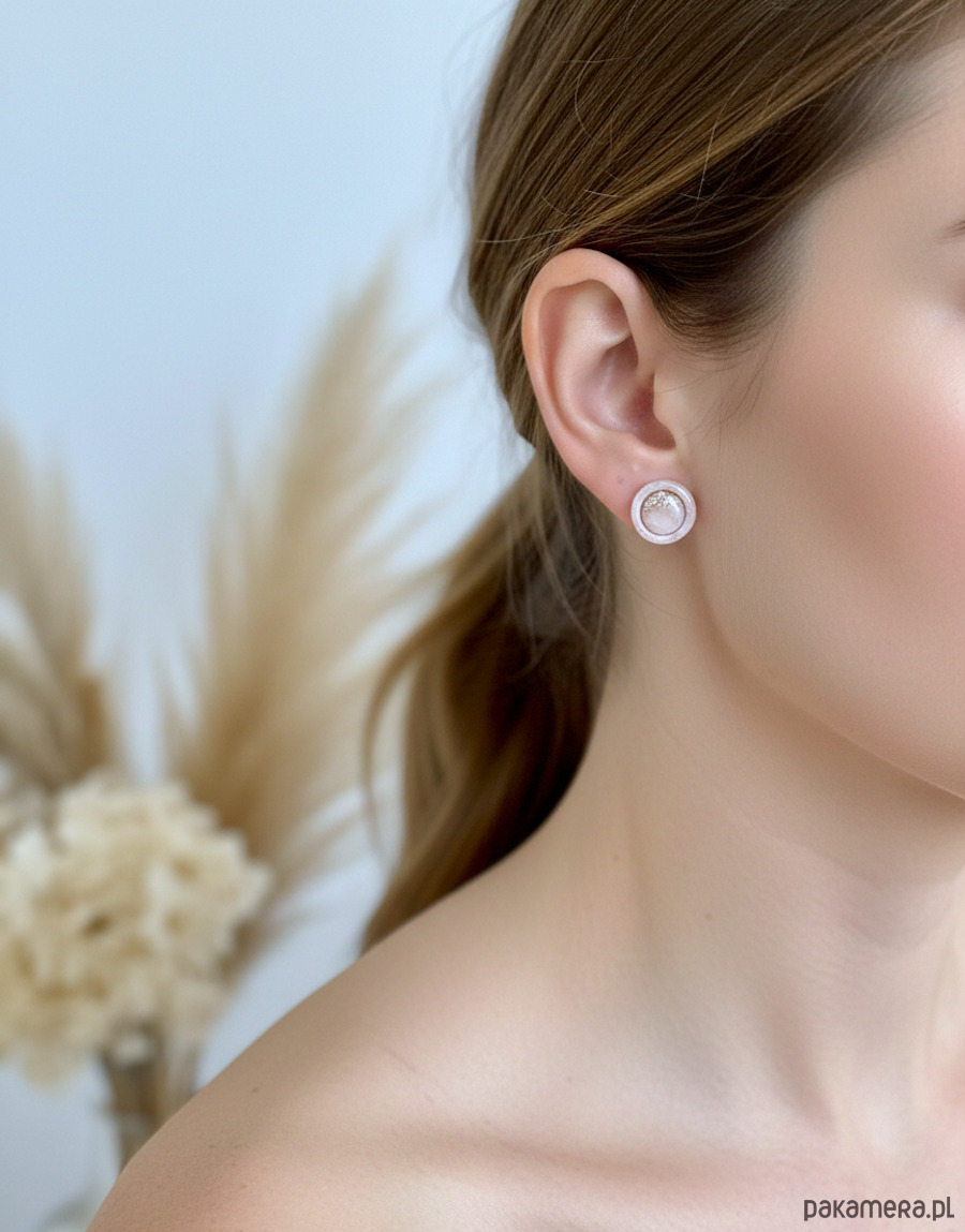 Delikatne kolczyki‑koła w pudrowym różu to subtelny, ale efektowny akcent, który pięknie dopełni zarówno codzienne, jak i eleganckie stylizacje. Przeźroczysty środek z zatopionymi drobinkami oraz matowa obręcz tworzą wrażenie małej „galaktyki” na uchu i dodają stylizacji świetlistego charakteru.