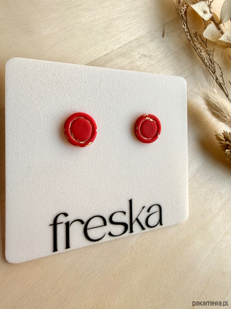 Dodaj energiczny akcent do swojej biżuterii z minimalistycznymi kolczykami–kółkami w intensywnej czerwieni ze złotą ramką! Ręcznie wykonane elementy z gliny polimerowej mają matową powierzchnię i wyrazistą obwódkę, a całość osadzono na bazie ze stali chirurgicznej – odpowiedniej również dla osób z wrażliwą skórą.