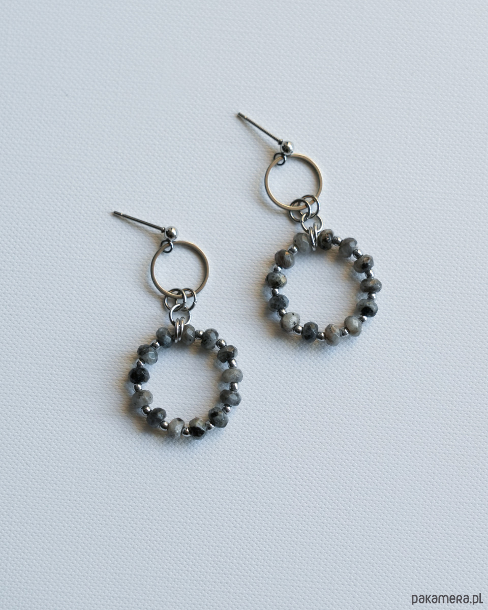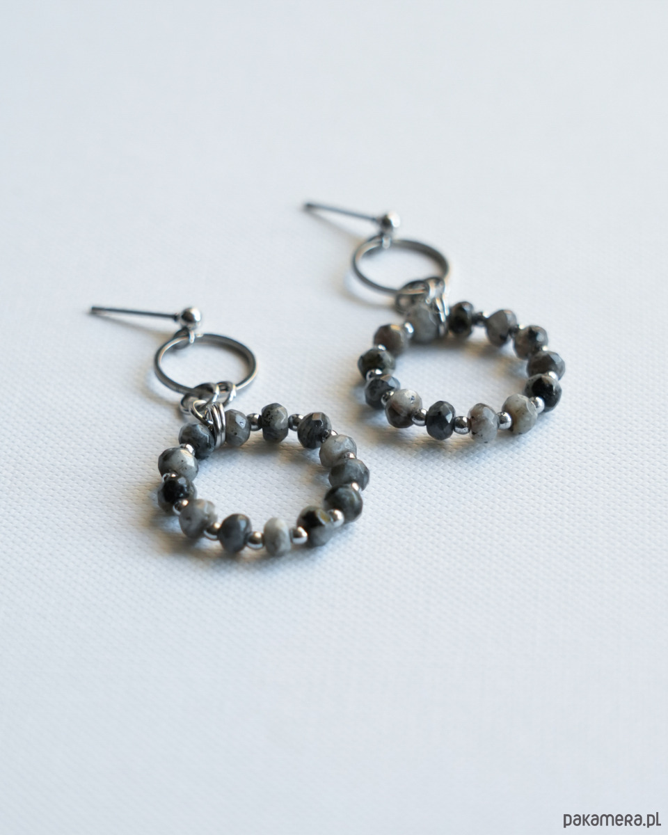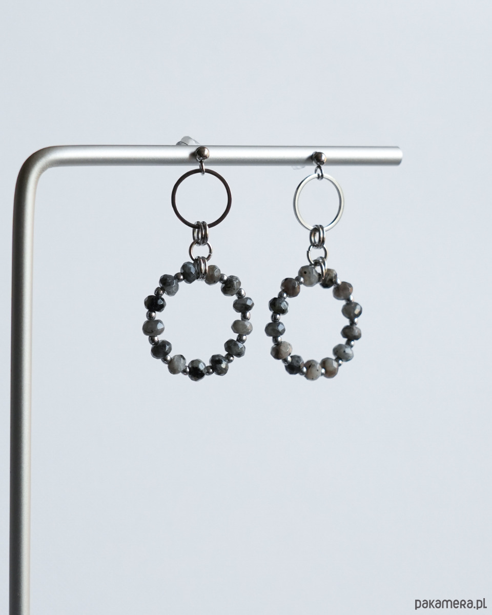 Wiszące kolczyki z szarym jadeitem i srebrnym hematytem. Koraliki zostały nawleczone na podwójną, stalową linkę jubilerską i kółka są lekko elastyczne (nie są sztywne).