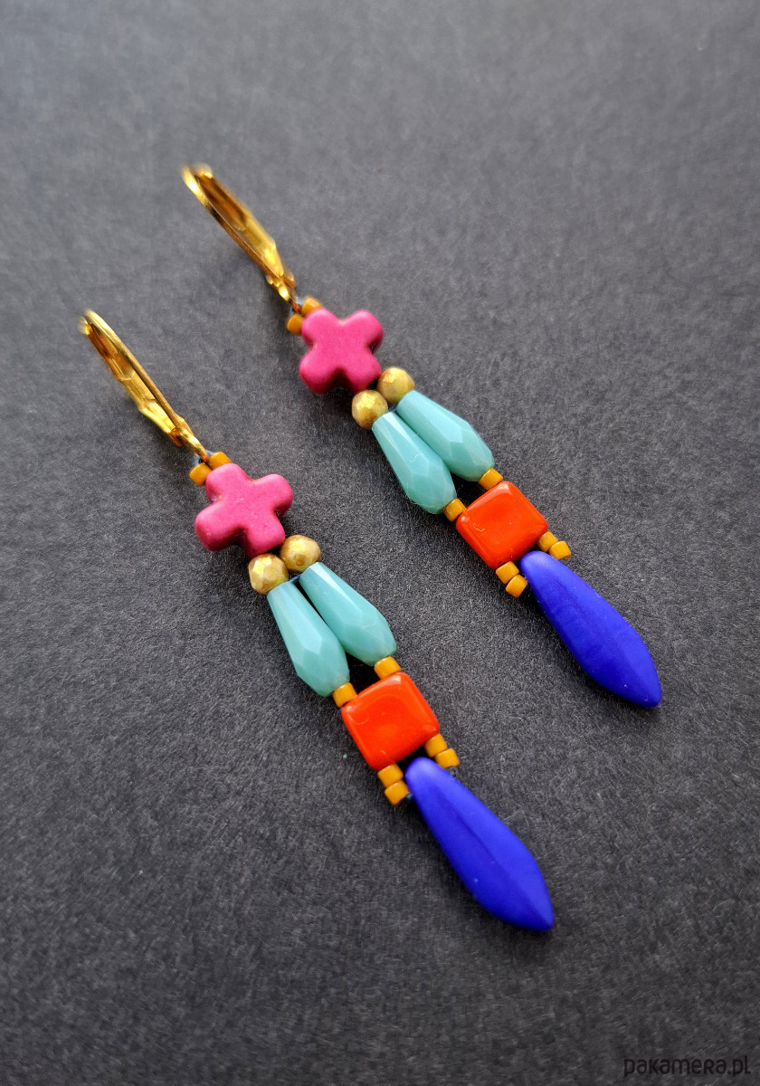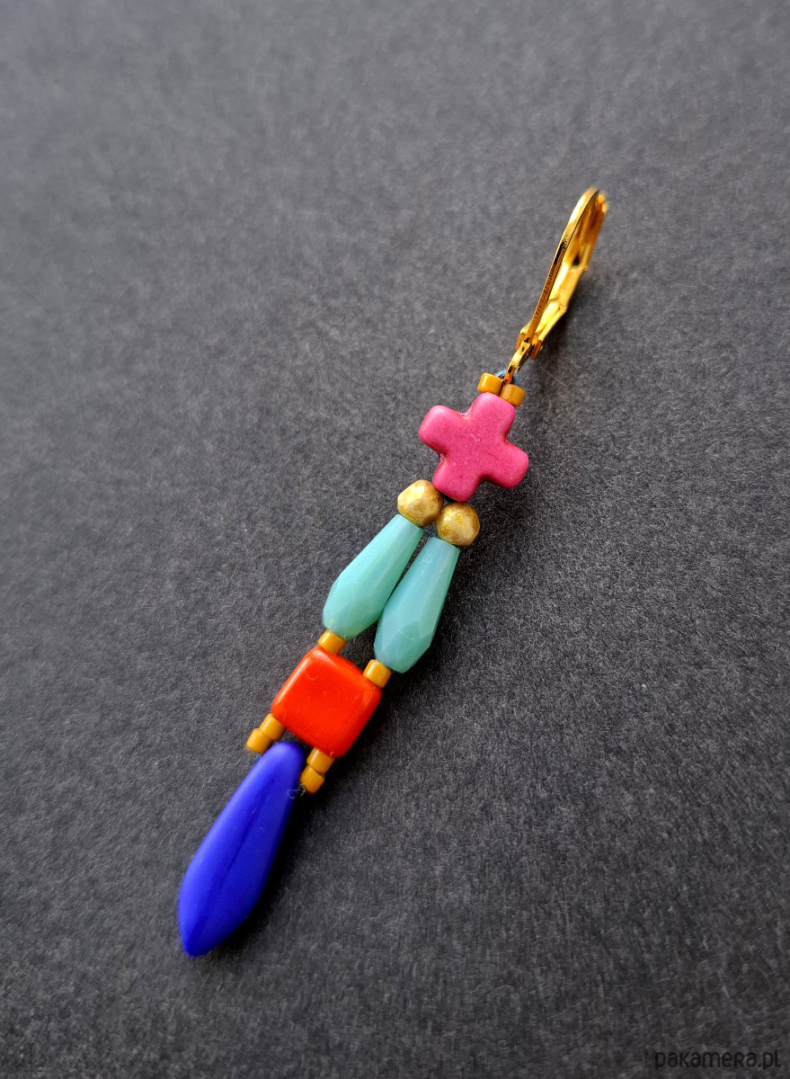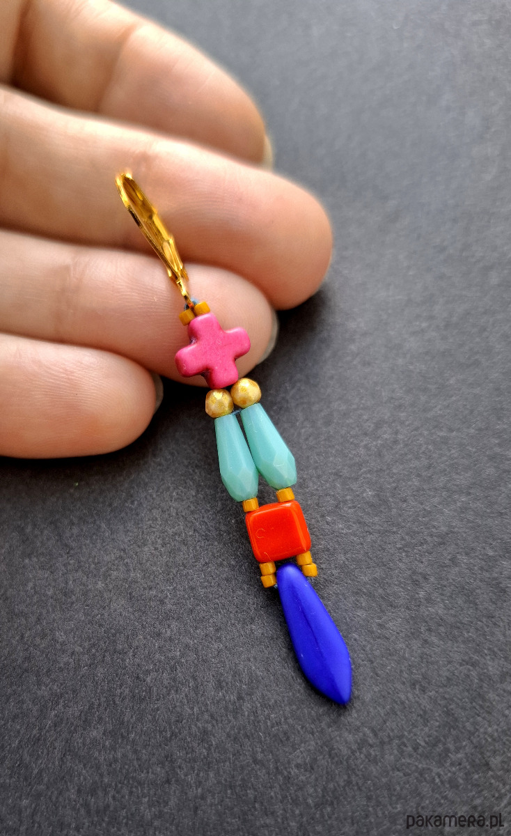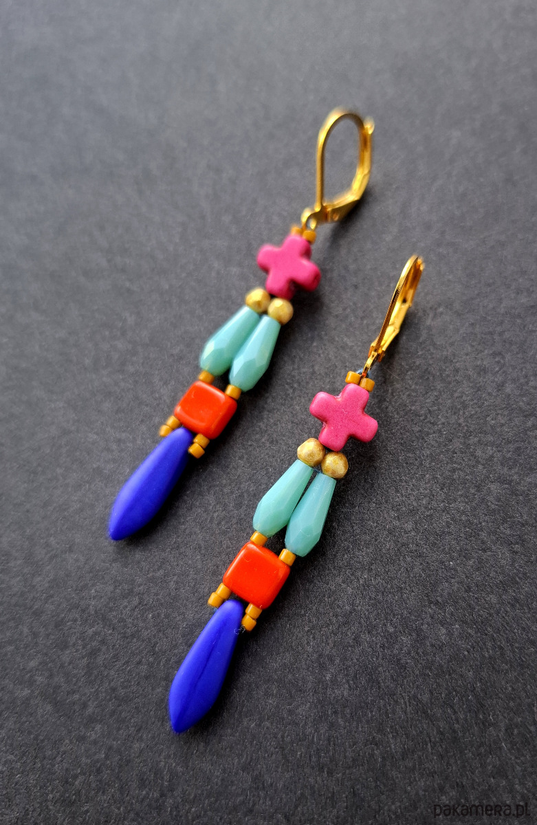 Kolczyki wiszące, wykonane techniką swoistego haftu drobnymi, szklanymi koralikami w połączeniu z niebieskimi howlitami. Dwustronne, podwieszone na pozłacanych i nieuczulających biglach typy angielskiego. Wymiary - długość wraz z zapięciem: 6 cm, szerokość max. 8 mm. Wykonane w jedynym egzemplarzu.