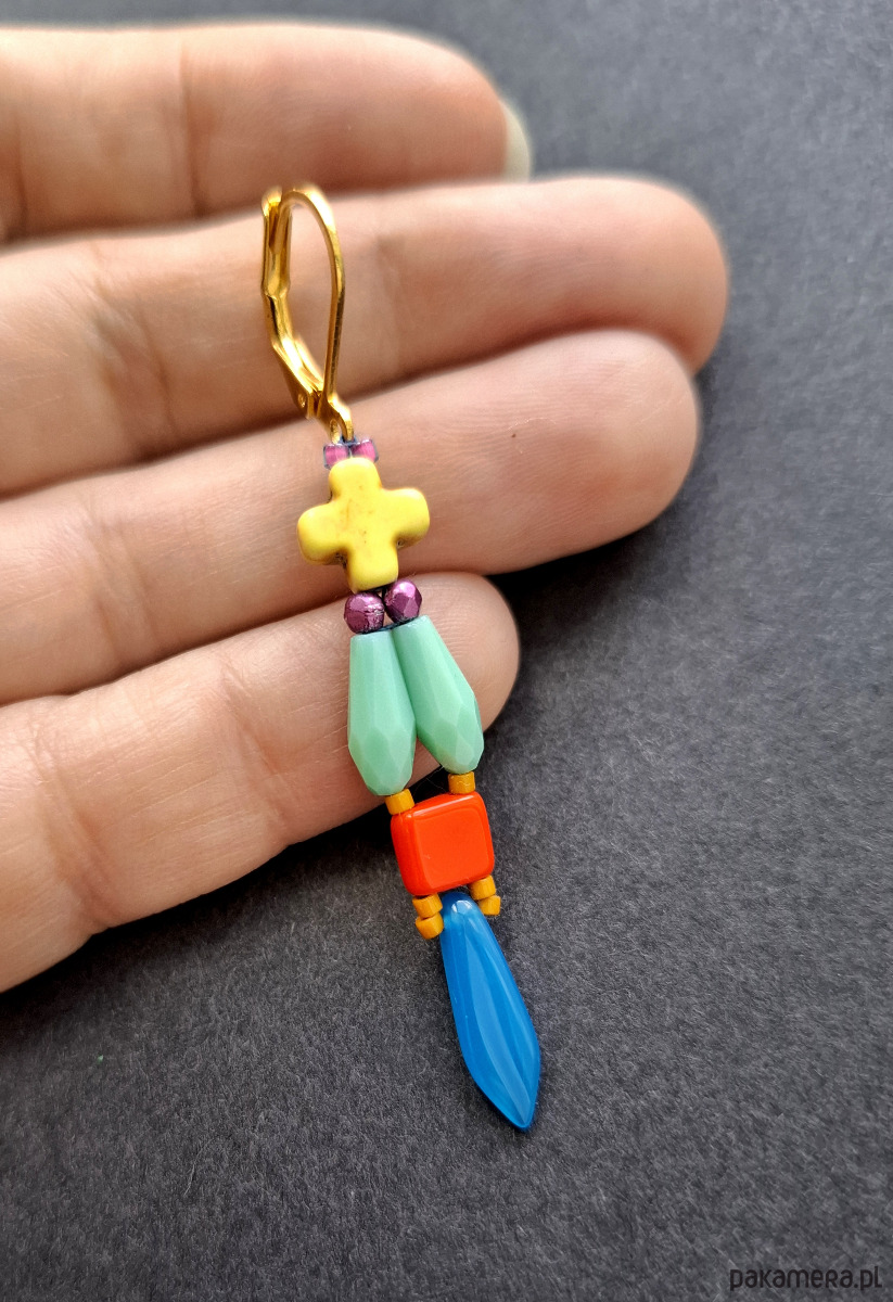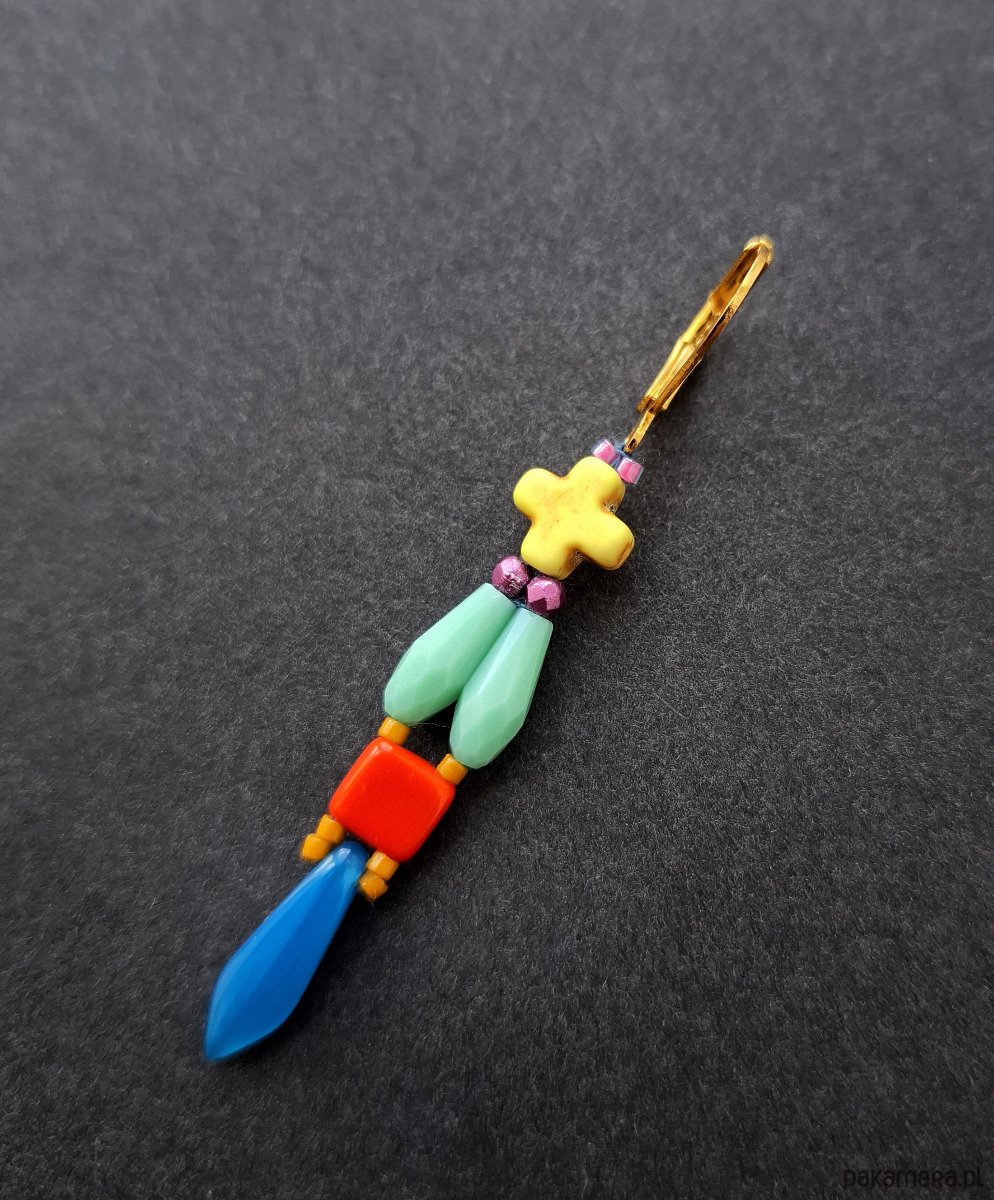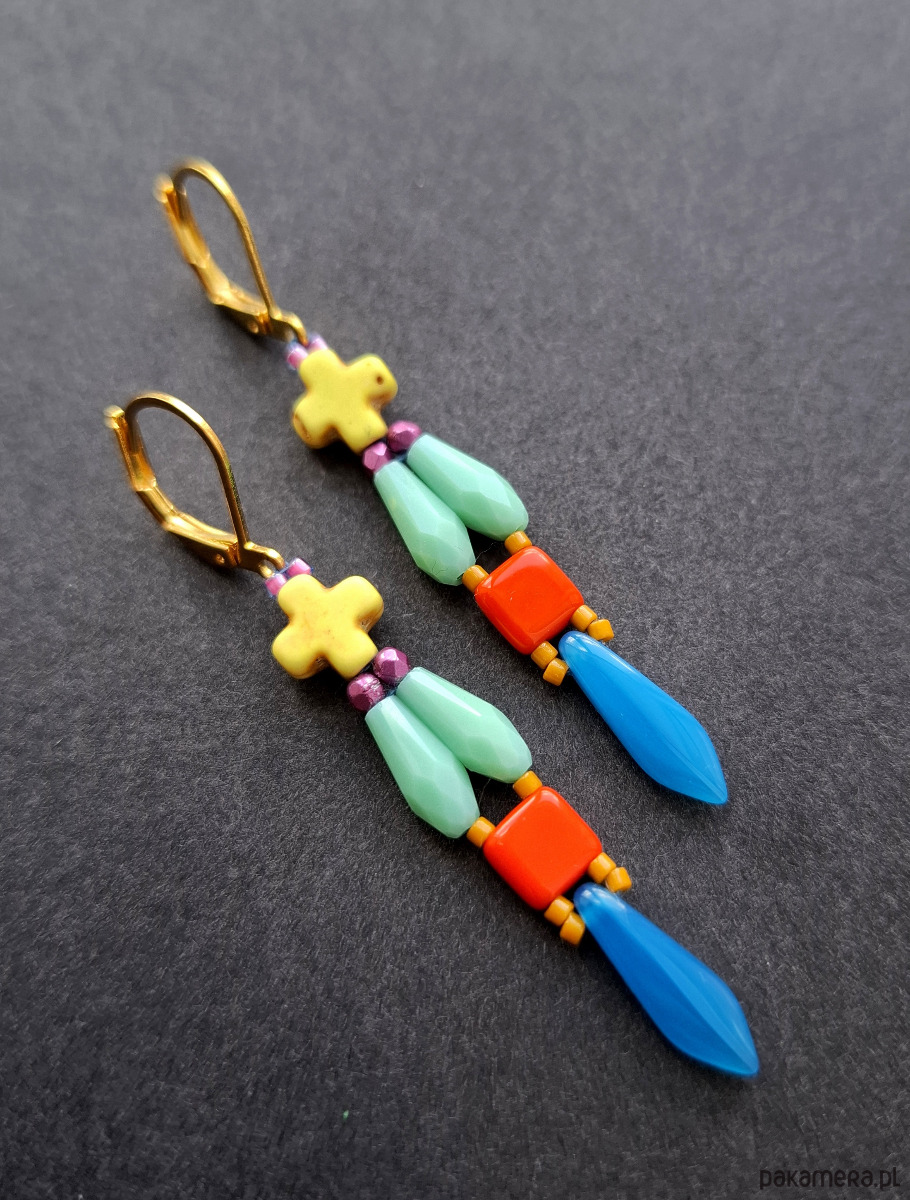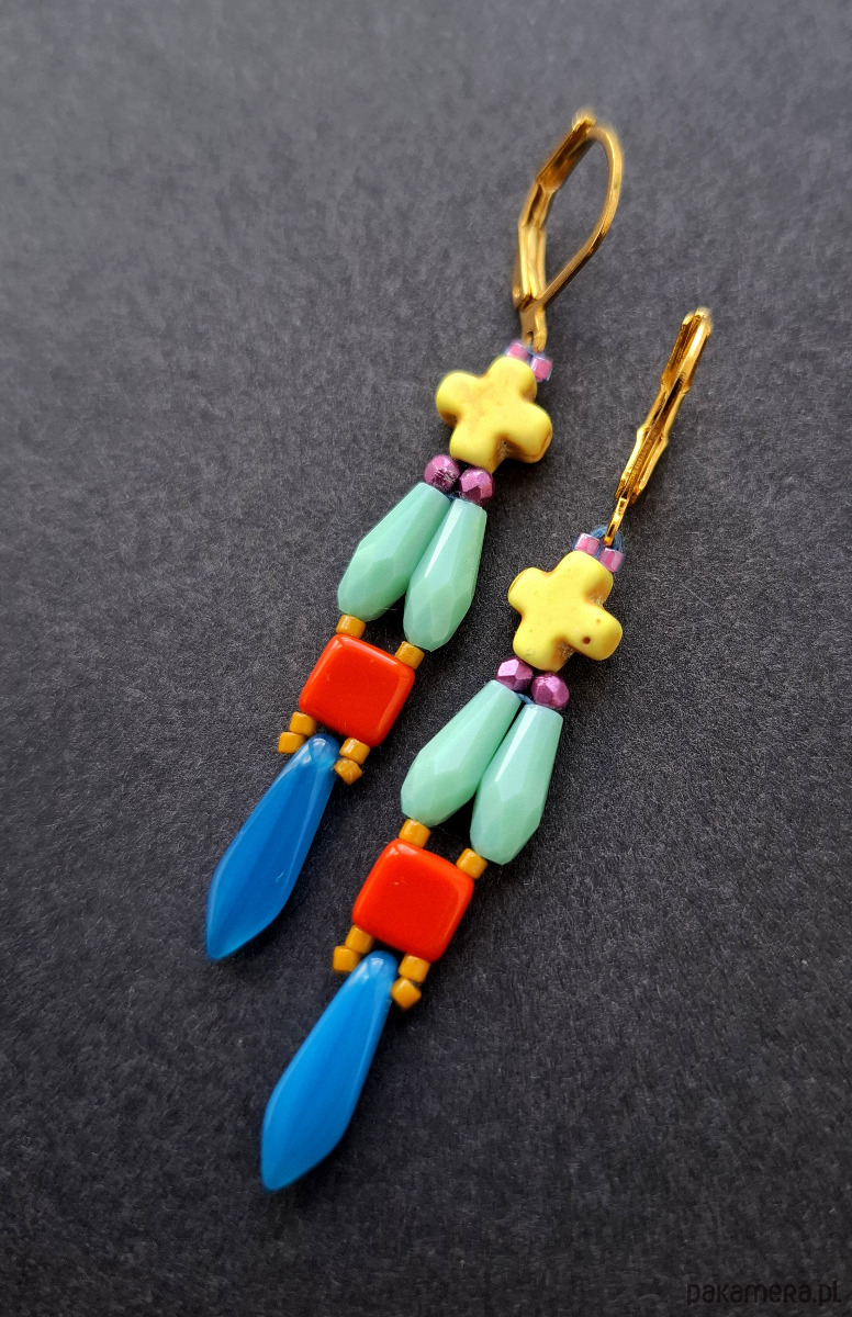 Kolczyki wiszące, wykonane techniką swoistego haftu drobnymi, szklanymi koralikami w połączeniu z żółtymi howlitami. Dwustronne, podwieszone na pozłacanych i nieuczulających biglach typy angielskiego. Wymiary - długość wraz z zapięciem: 6 cm, szerokość max. 8 mm. Wykonane w jedynym egzemplarzu.