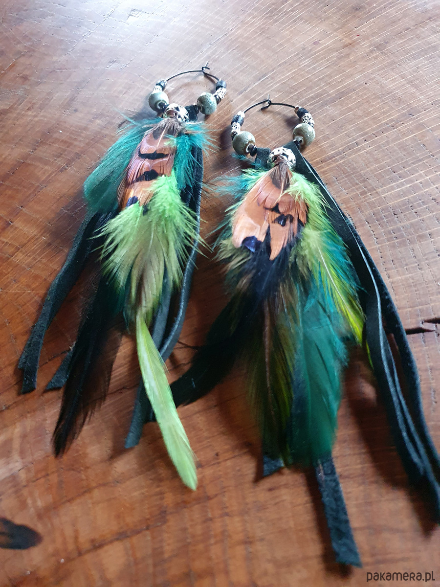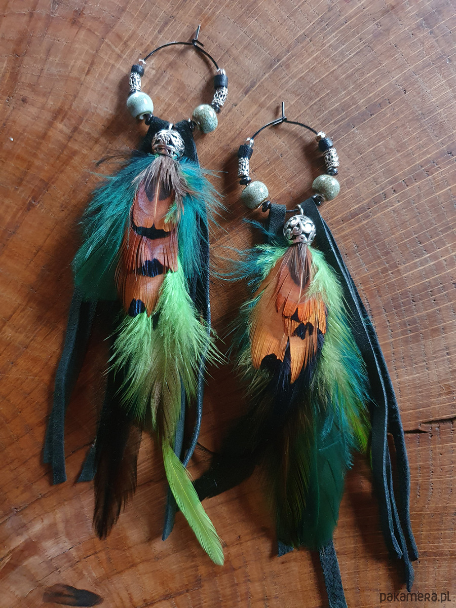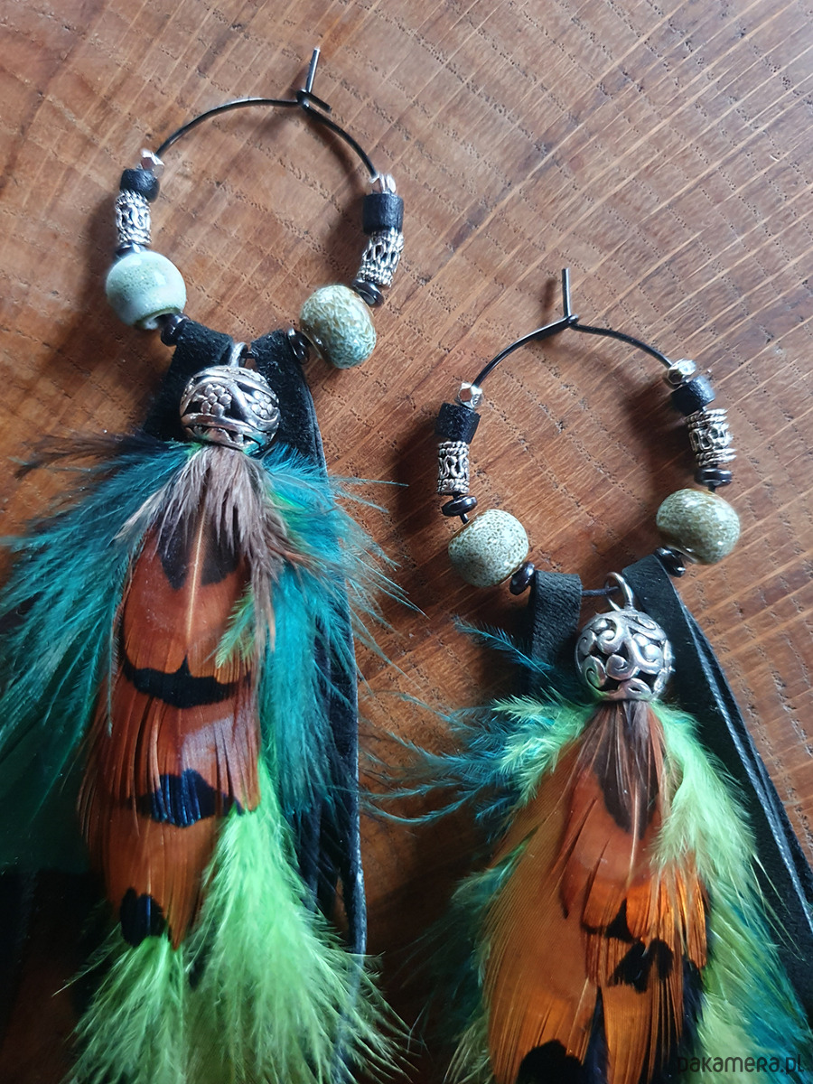 Etniczne kolczyki wykonane z metalowego barwionego drutu, czarnego rzemienia, piór naturalnych ptaków egzotycznych, koralików metalowych i ceramicznych