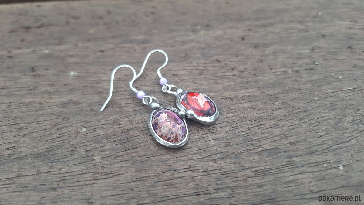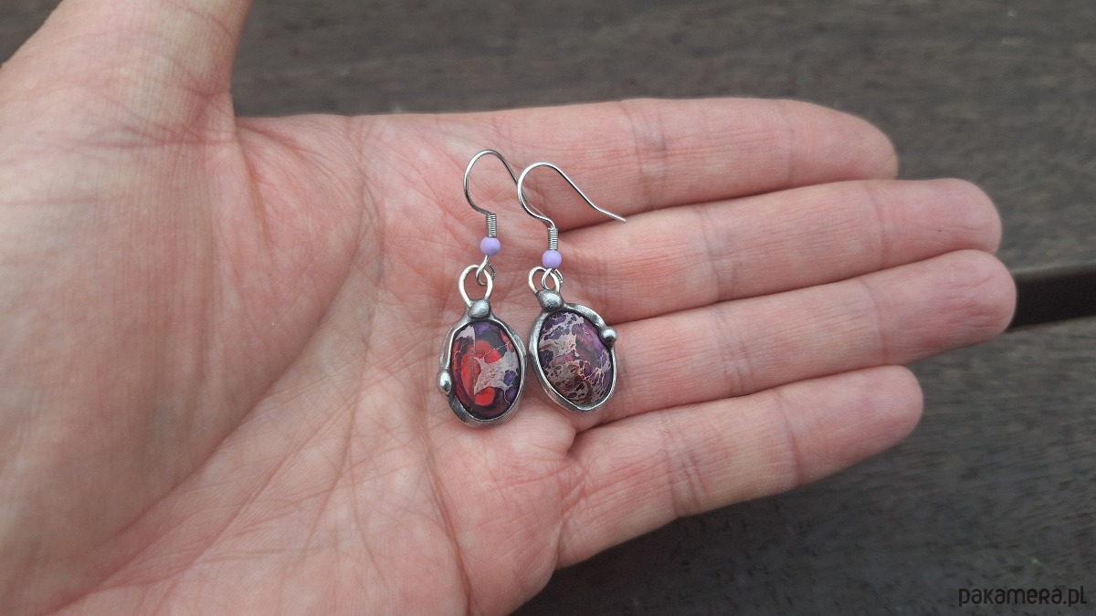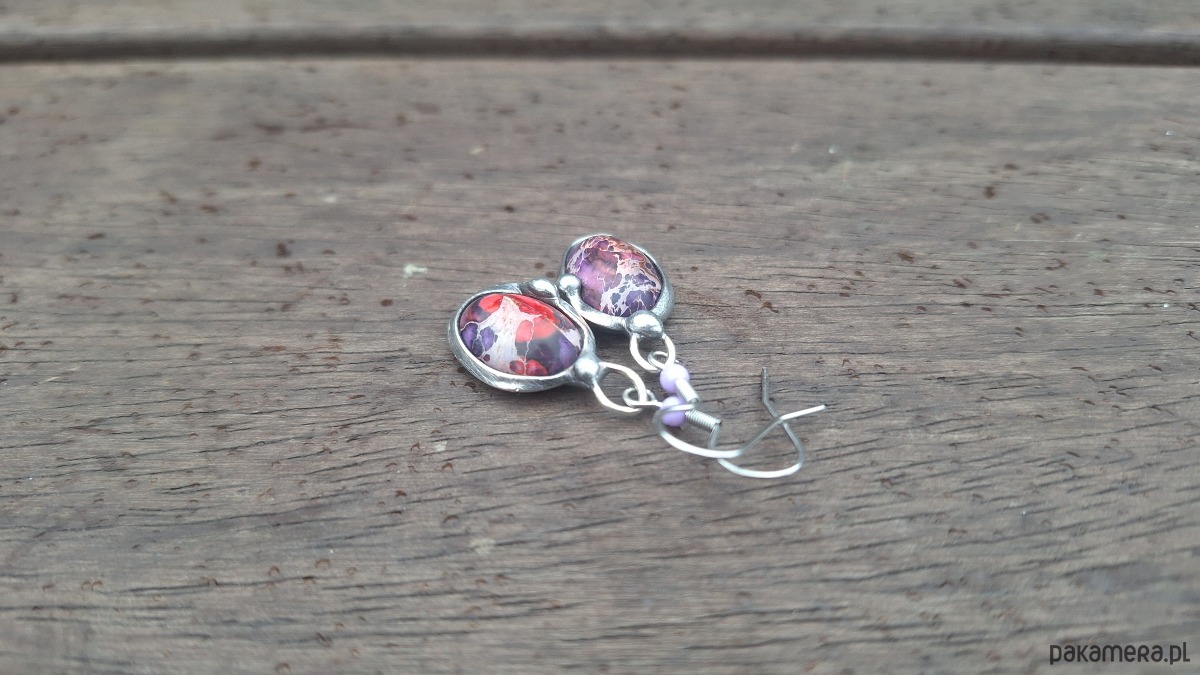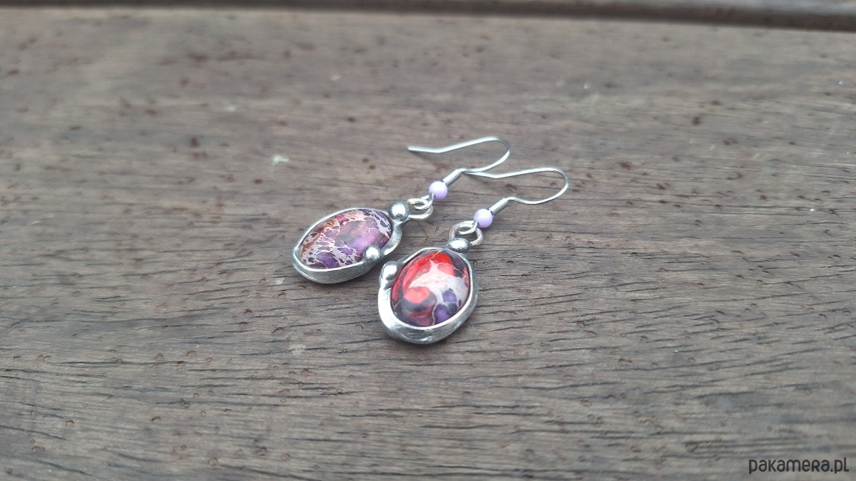 Kolczyki wykonane z miedzi, cyny i jaspisów. Długość ok. 4 cm z biglem. Kolczyki nie są idealnie równe. Bigle metalowe.