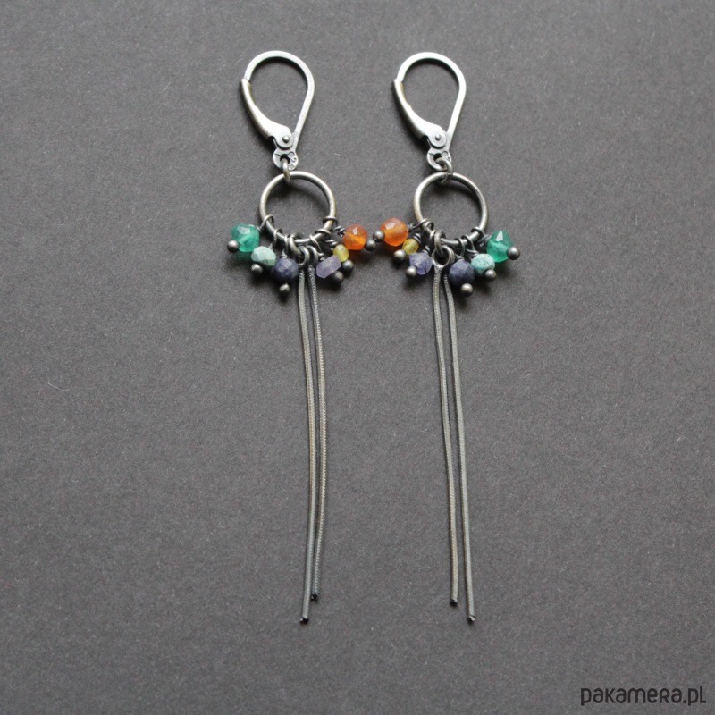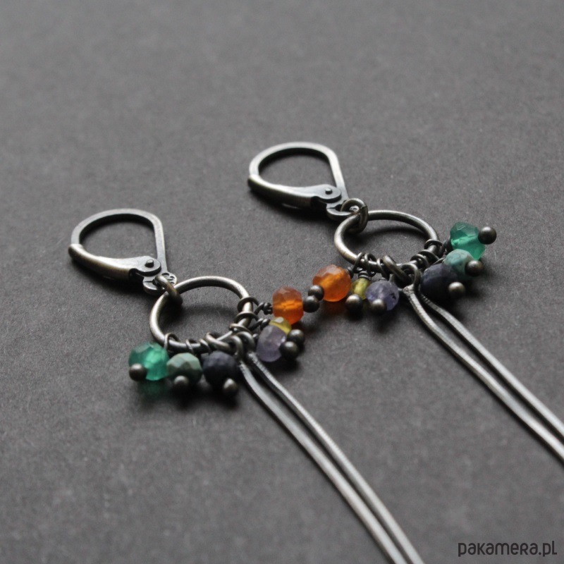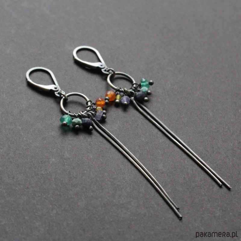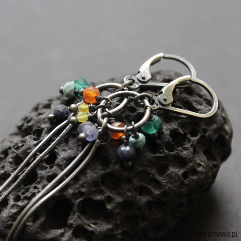 Długie kolczyki wykonane zostały z oksydowanego srebra próby 925 oraz fasetowanych minerałów: rubinu, tanzanitu, turkusu, zielonego onyksu, karneolu oraz żółtego opala (0,25 -0,35 cm).