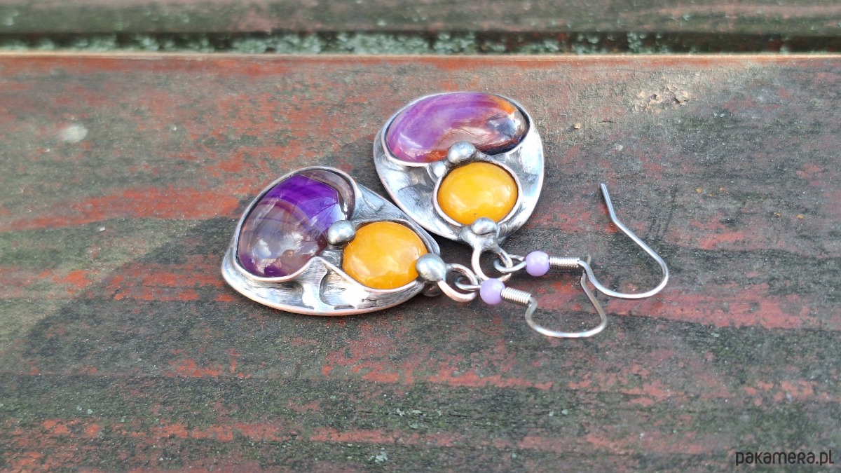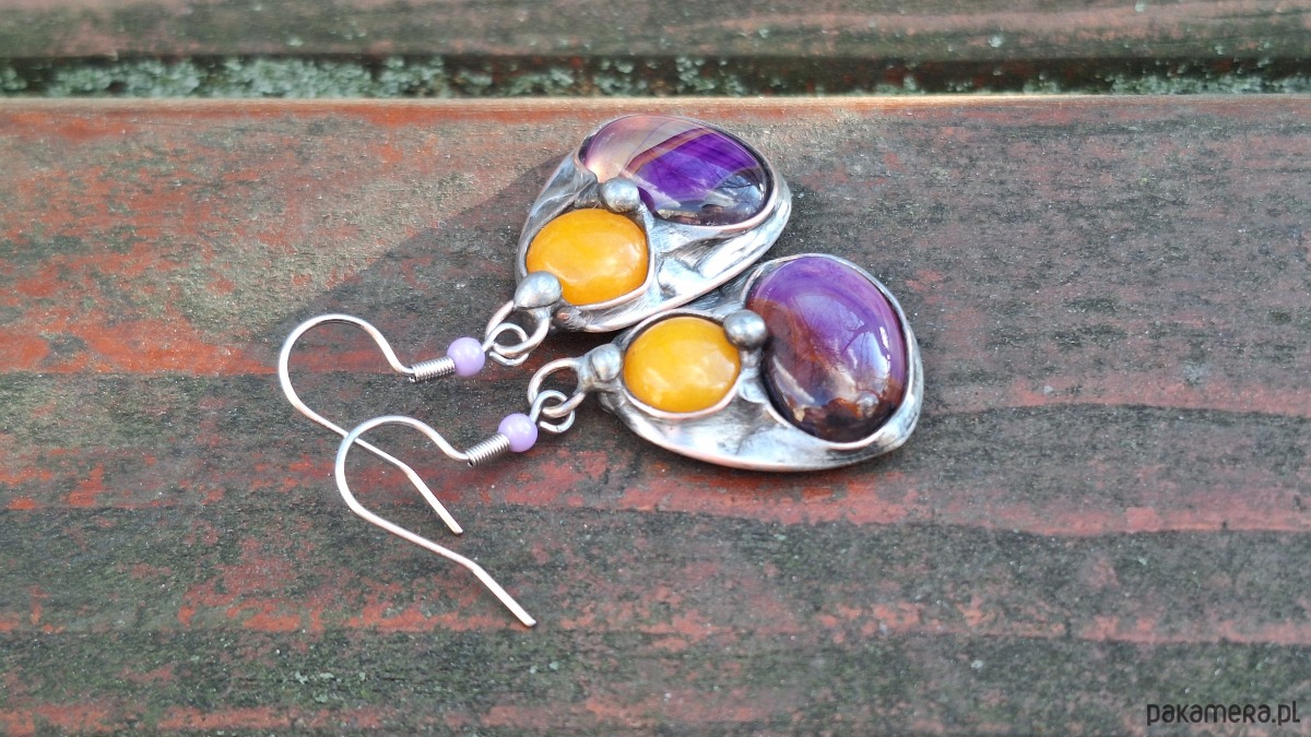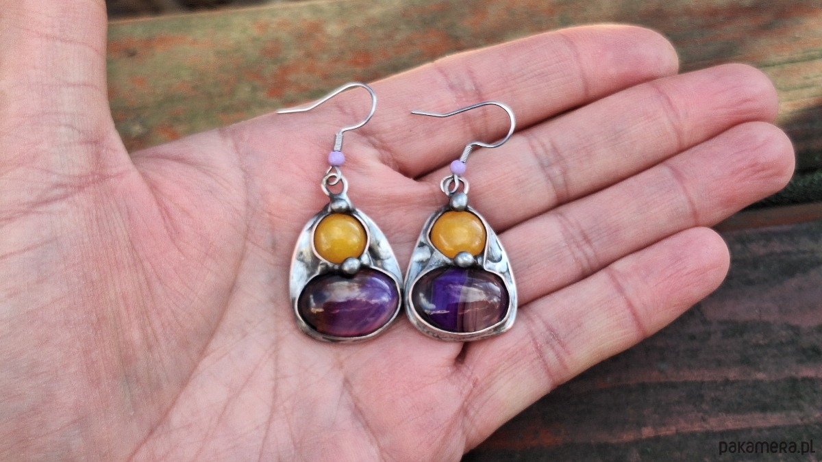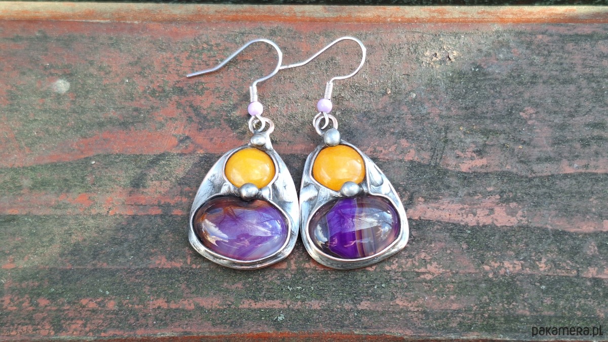 Kolczyki wykonane z miedzi, cyny, agatów i jadeitów. Długość z biglem ok. 4.5 cm, szerokość ok. 2 cm. Bigle metalowe.