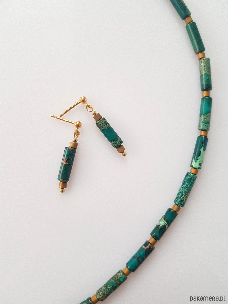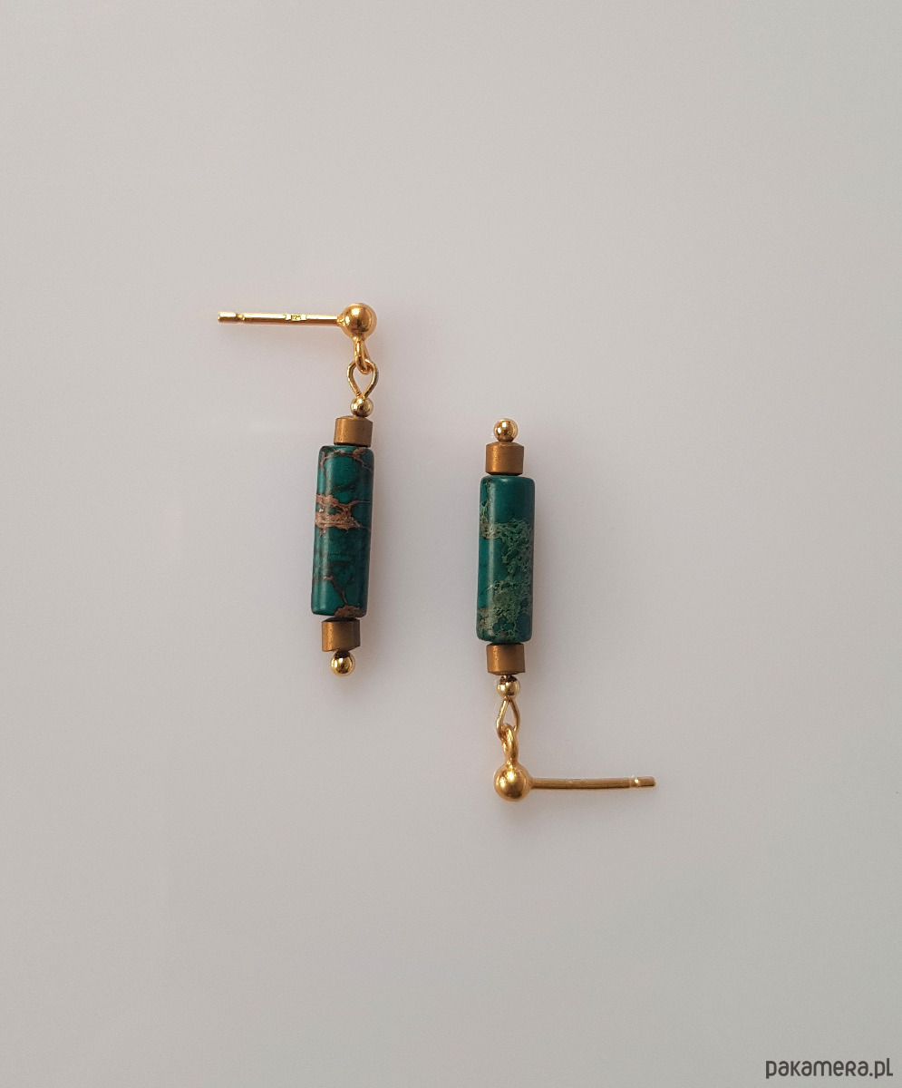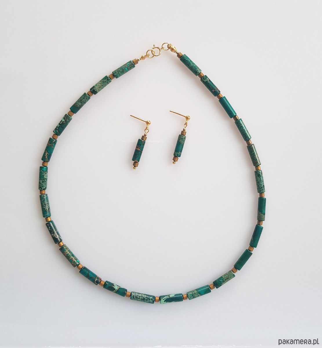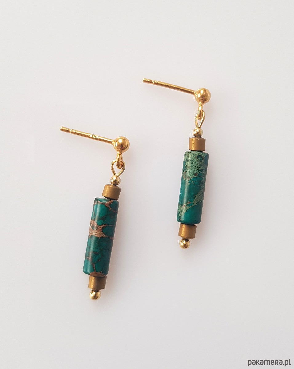 Hematyt w kolorze starego złota i słupek jaspisu cesarskiego w pięknych zielonych odcieniach.