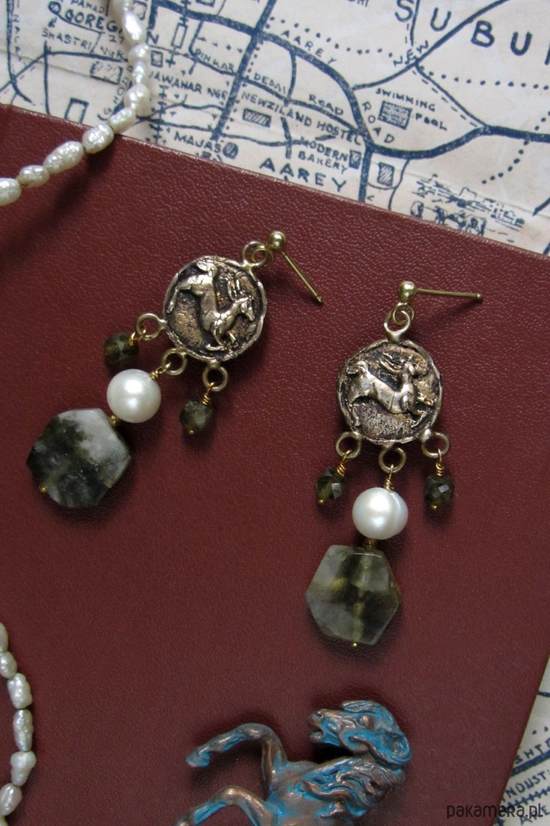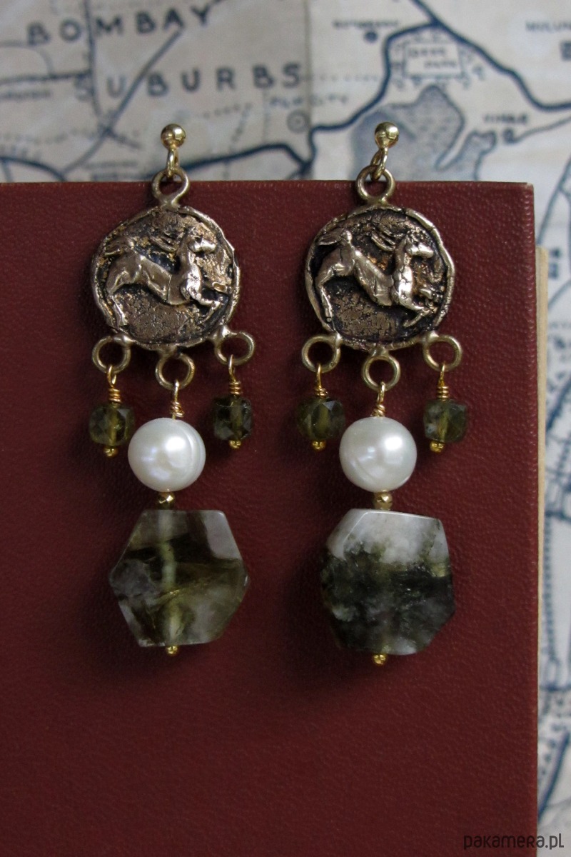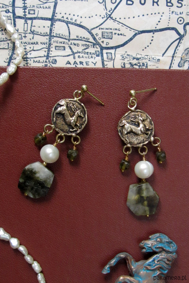 Wykonane ręcznie z grossularów, lepidolitów, pereł i brązu kolczyki z monetą z biegnącym koniem. Inspirowane monetami rzymskimi. Element centralny wyrzeźbiony ręcznie w Krakowie według autorskiego projektu.