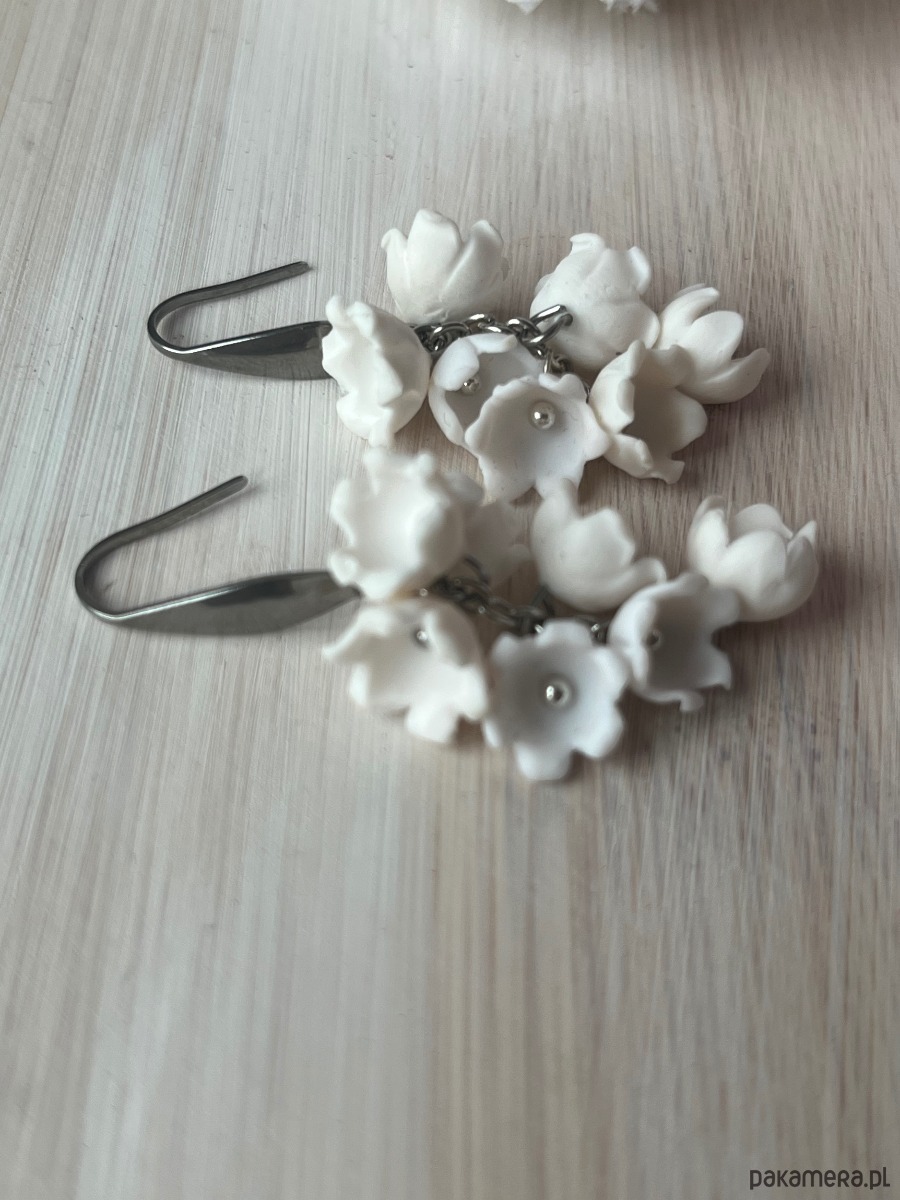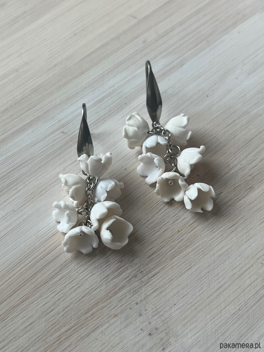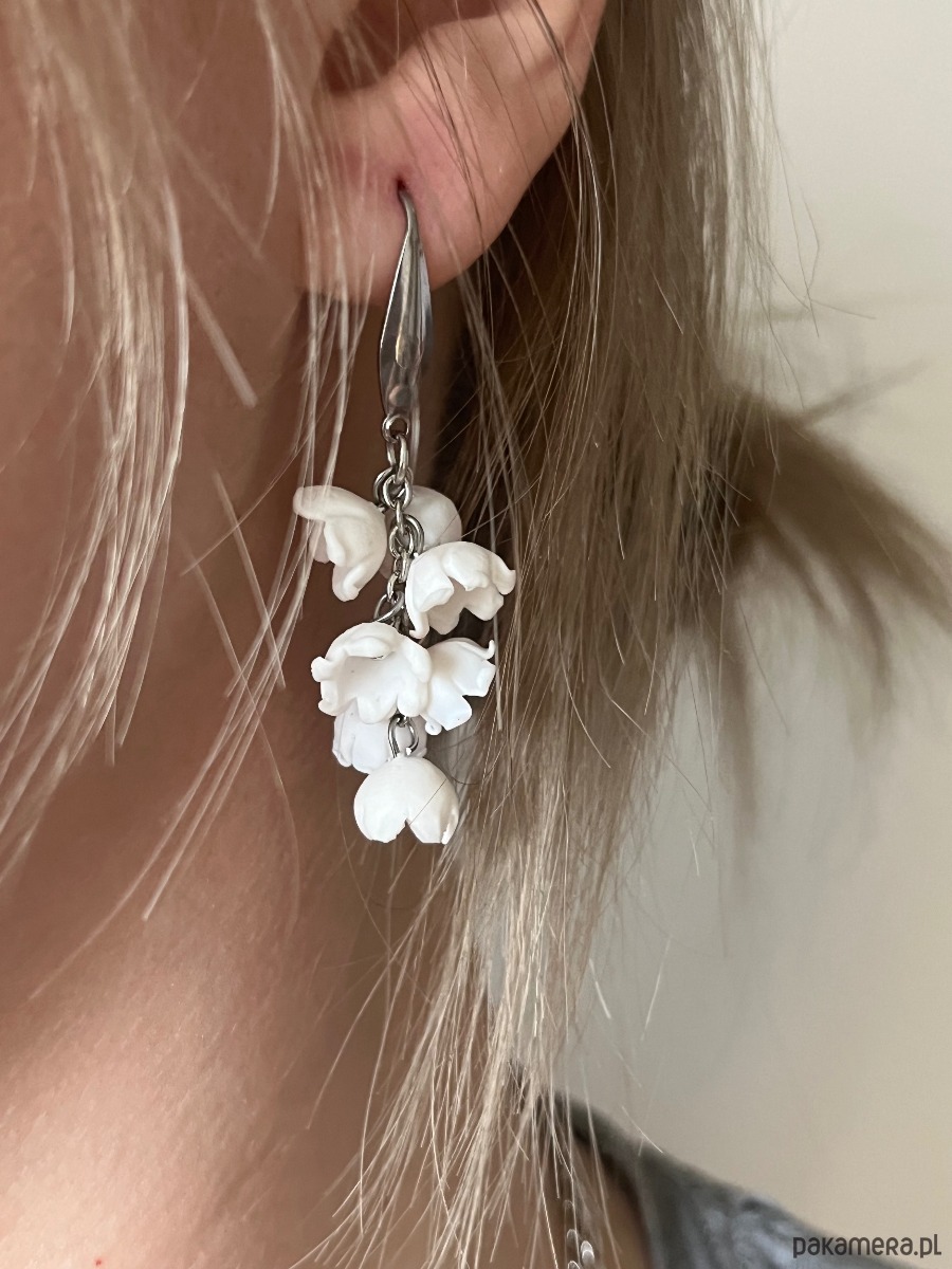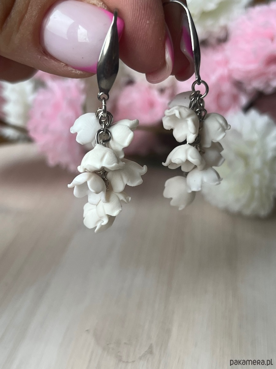 Delikatne, ręcznie wykonane kolczyki inspirowane konwaliami. Białe kwiaty zostały starannie uformowane z dbałością o każdy detal, dzięki czemu kolczyki wyglądają wyjątkowo subtelnie i romantycznie. Idealne na prezent dla bliskiej osoby, dodatek do ślubnej stylizacji albo ozdoba na co dzień dla miłośniczek natury.