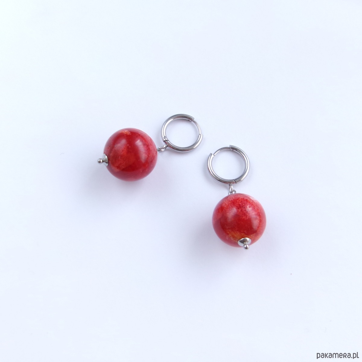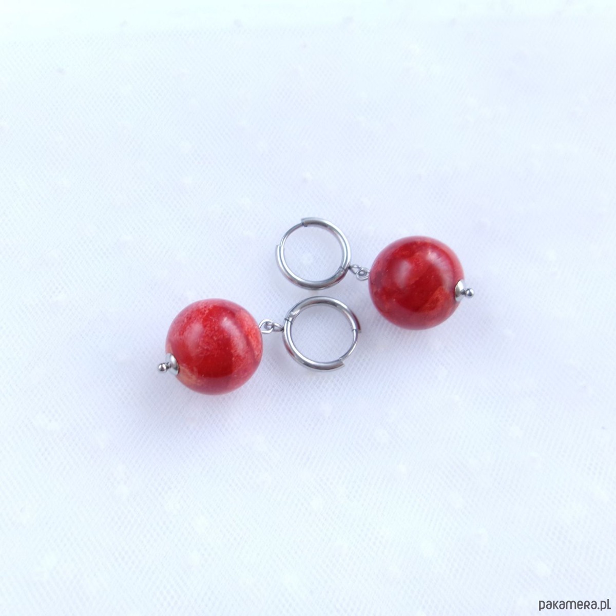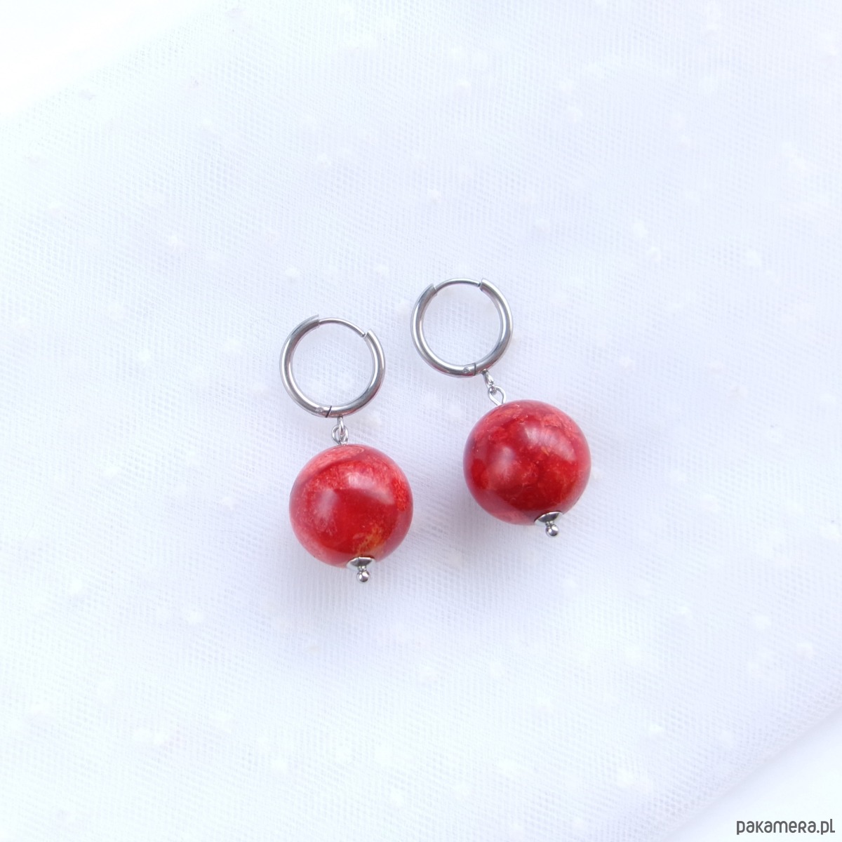 Kolczyki z kulami czerwonego korala w rozmiarze 16mm, zawieszone na biglach zatrzaskowych ze stali chirurgicznej.