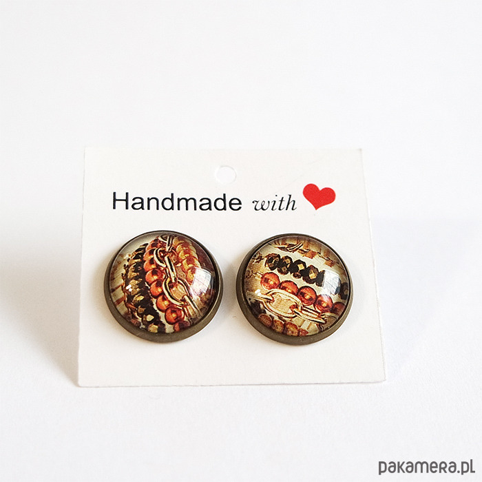 Grafika ukryta w prostych, eterycznych kolczykach, pod osłoną przeźroczystego półokrągłego szkiełka.
