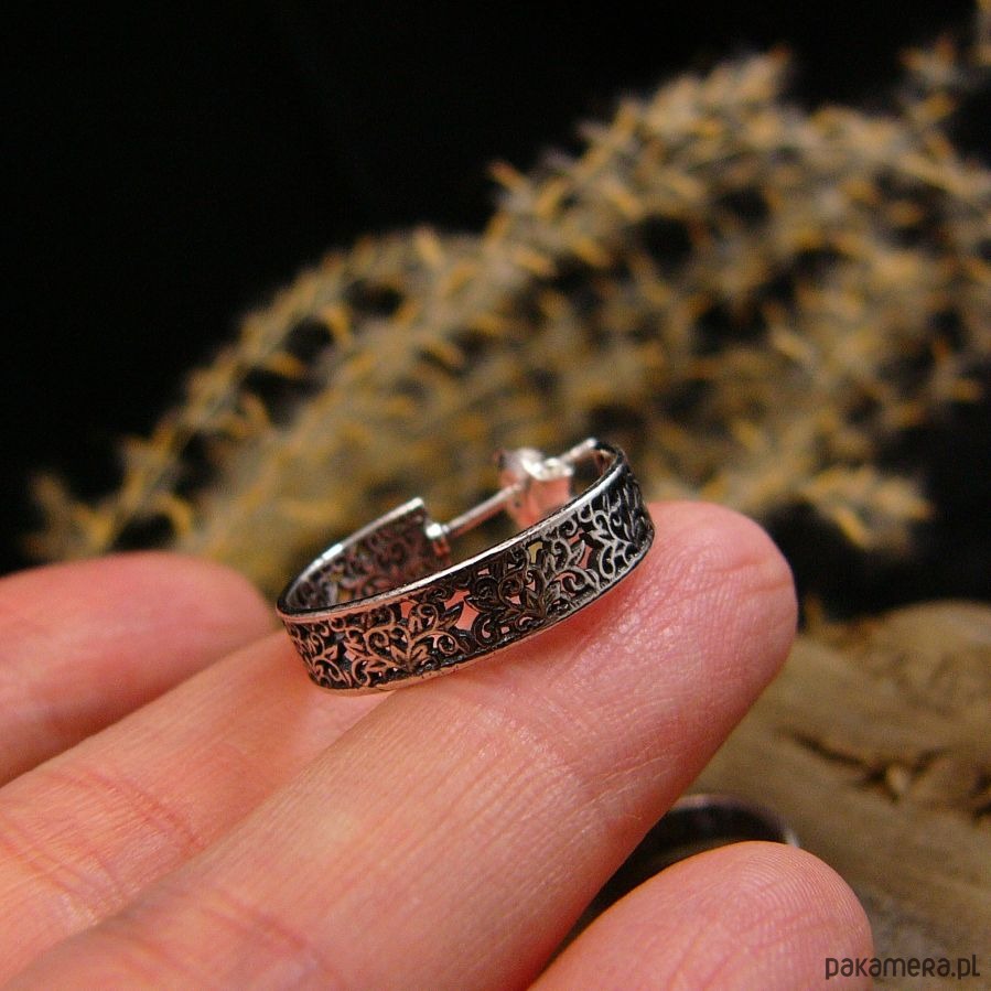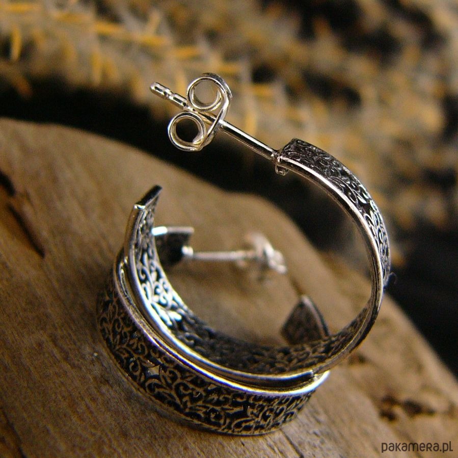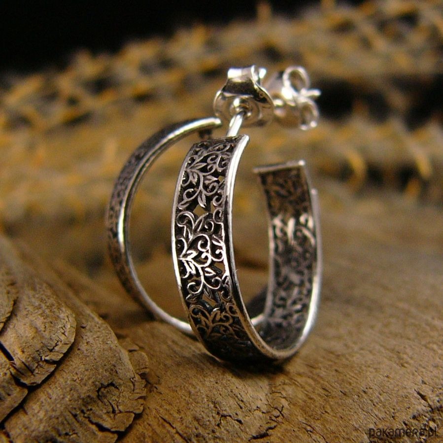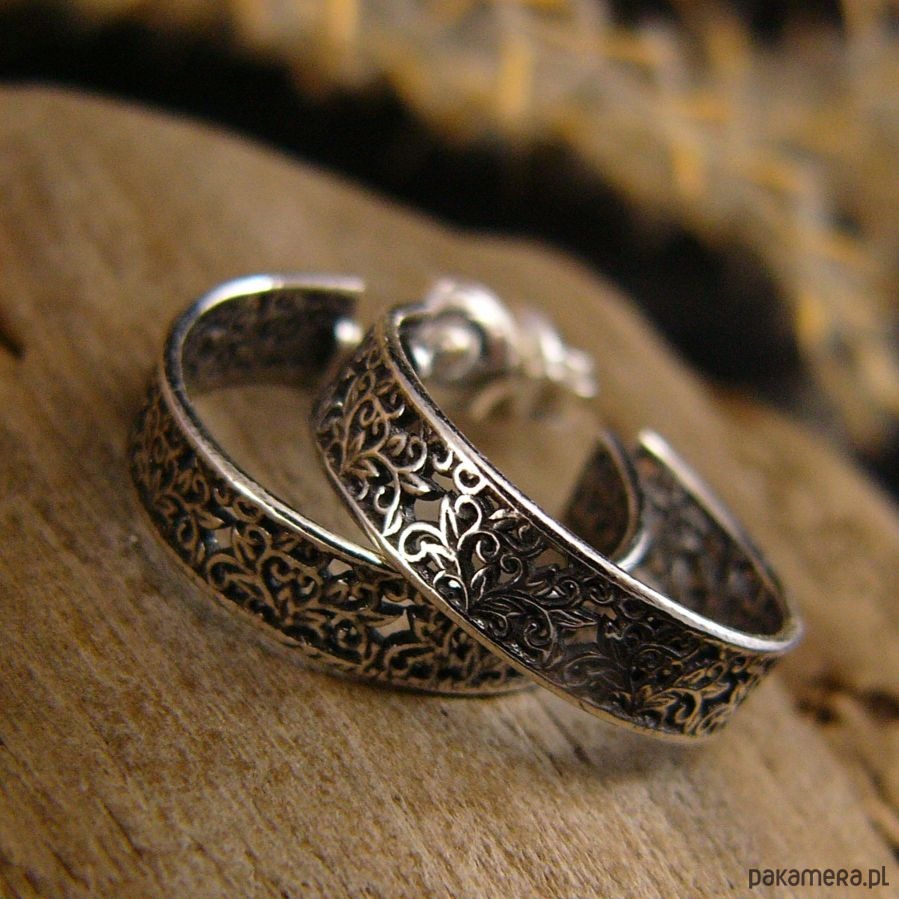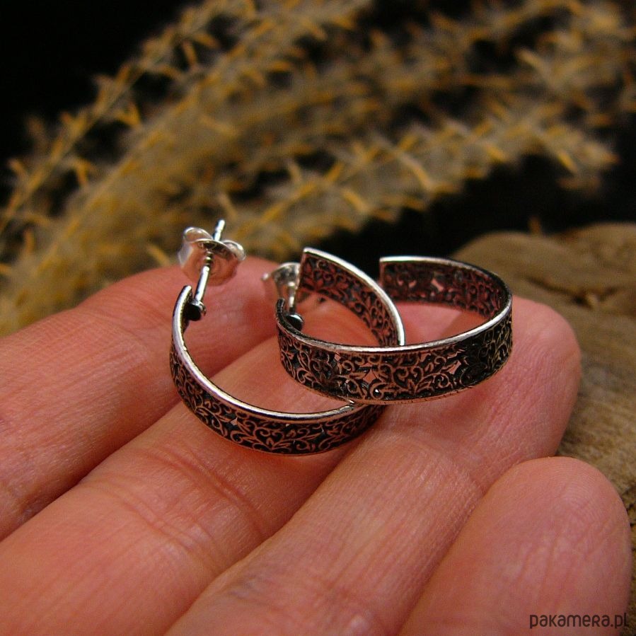 Kolczyki koronkowe koła wykonane ze srebra próby 925. Są przyczernione przetarte i wypolerowane co uwydatniło ażurowy wzór. Szerokość koła to 0,5 centymetra, średnica koła to 19 milimetrów. Kolczyki zapinane są na sztyft - tzw baranki. Polecam Nehesi :)