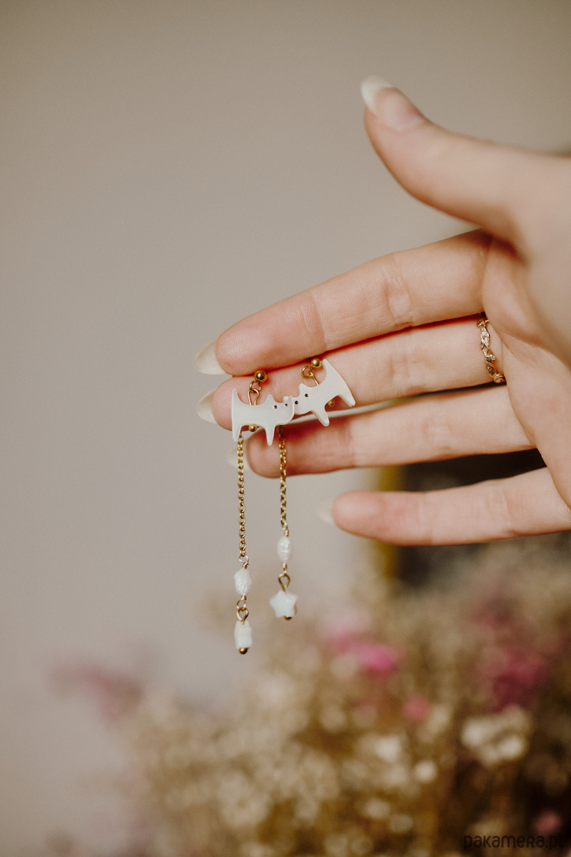 Unikatowe kolczyki z masy perłowej i naturalnych pereł. Zawieszki w kształcie kotków. Dzięki zawieszeniu łańcuszka na zapięciu kolczyki tworzą efekt 3D.