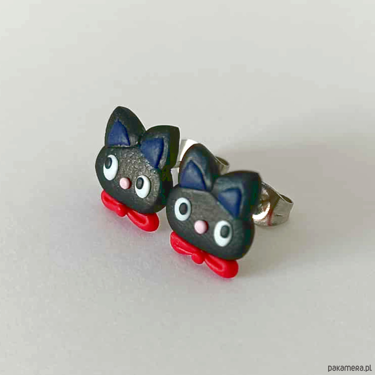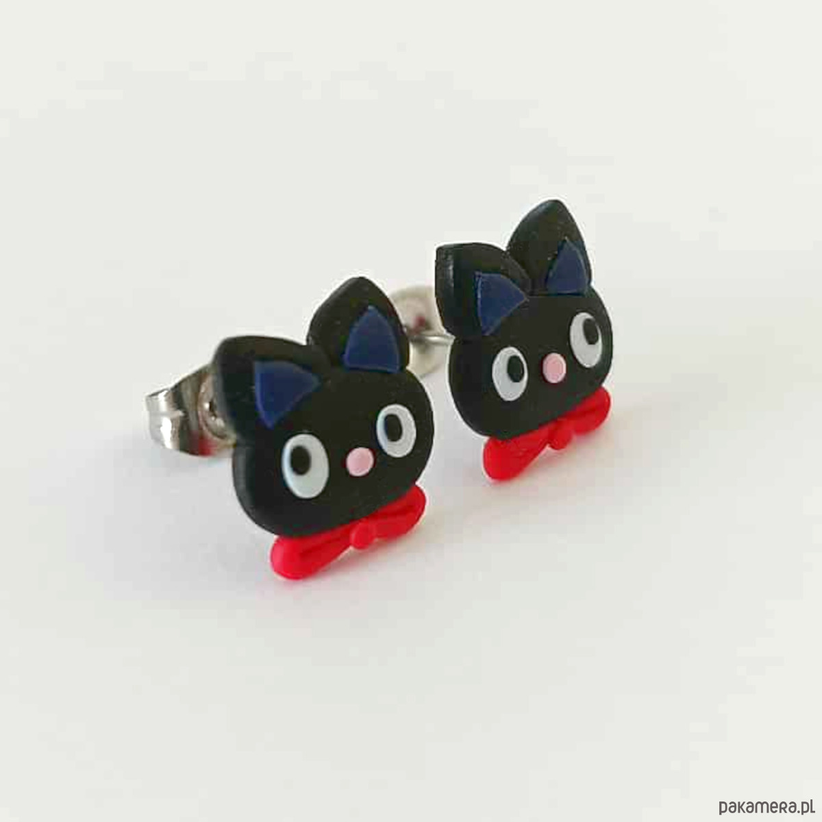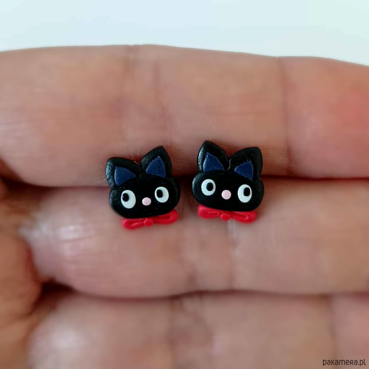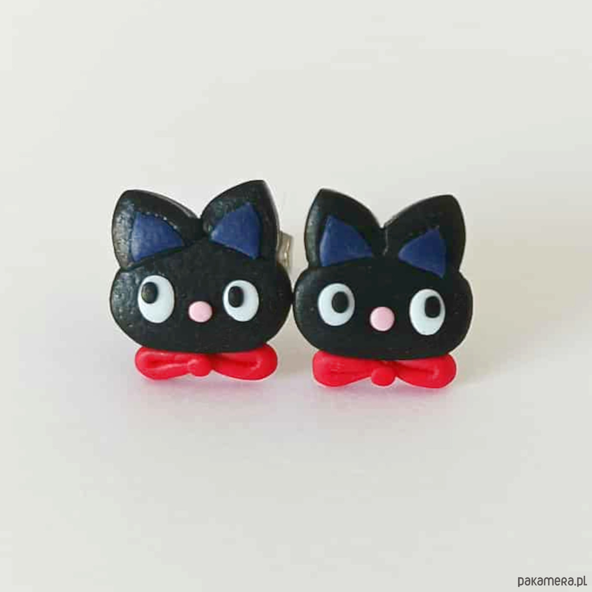 Urocze kolczyki w kształcie czarnych kotków z czerwonymi kokardkami. Ręcznie wykonane z modeliny, lekkie i wygodne do noszenia na co dzień. Idealne jako prezent dla miłośniczki kotów, wielbicielki oryginalnej biżuterii albo jako drobiazg na święta czy Halloween. Każda para jest unikatowa i wykonana z dbałością o detale.