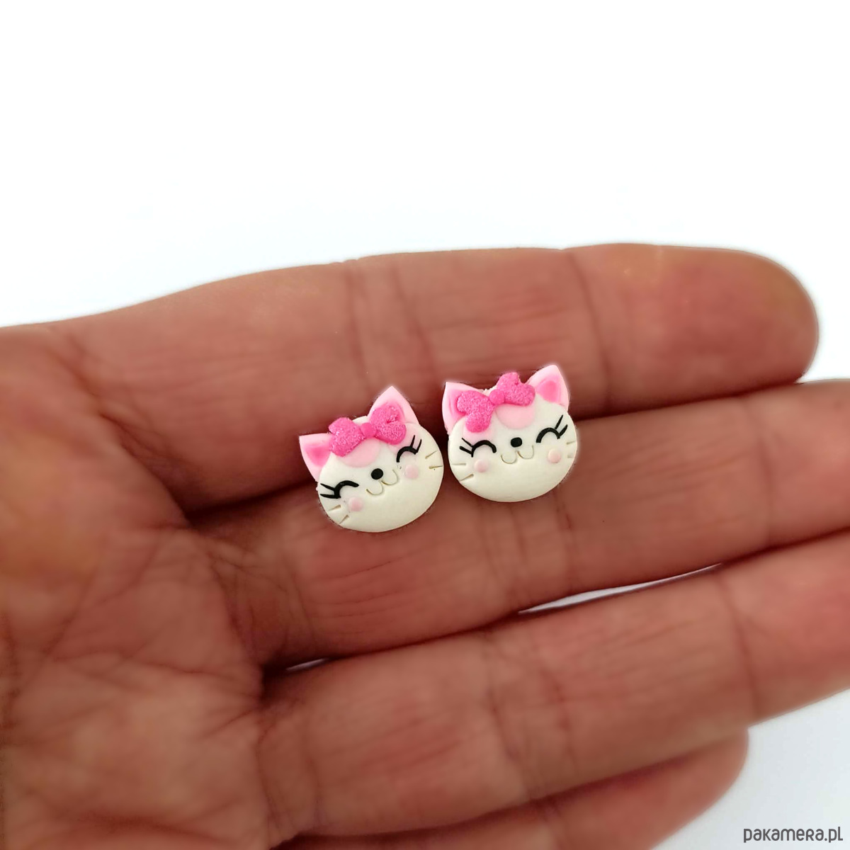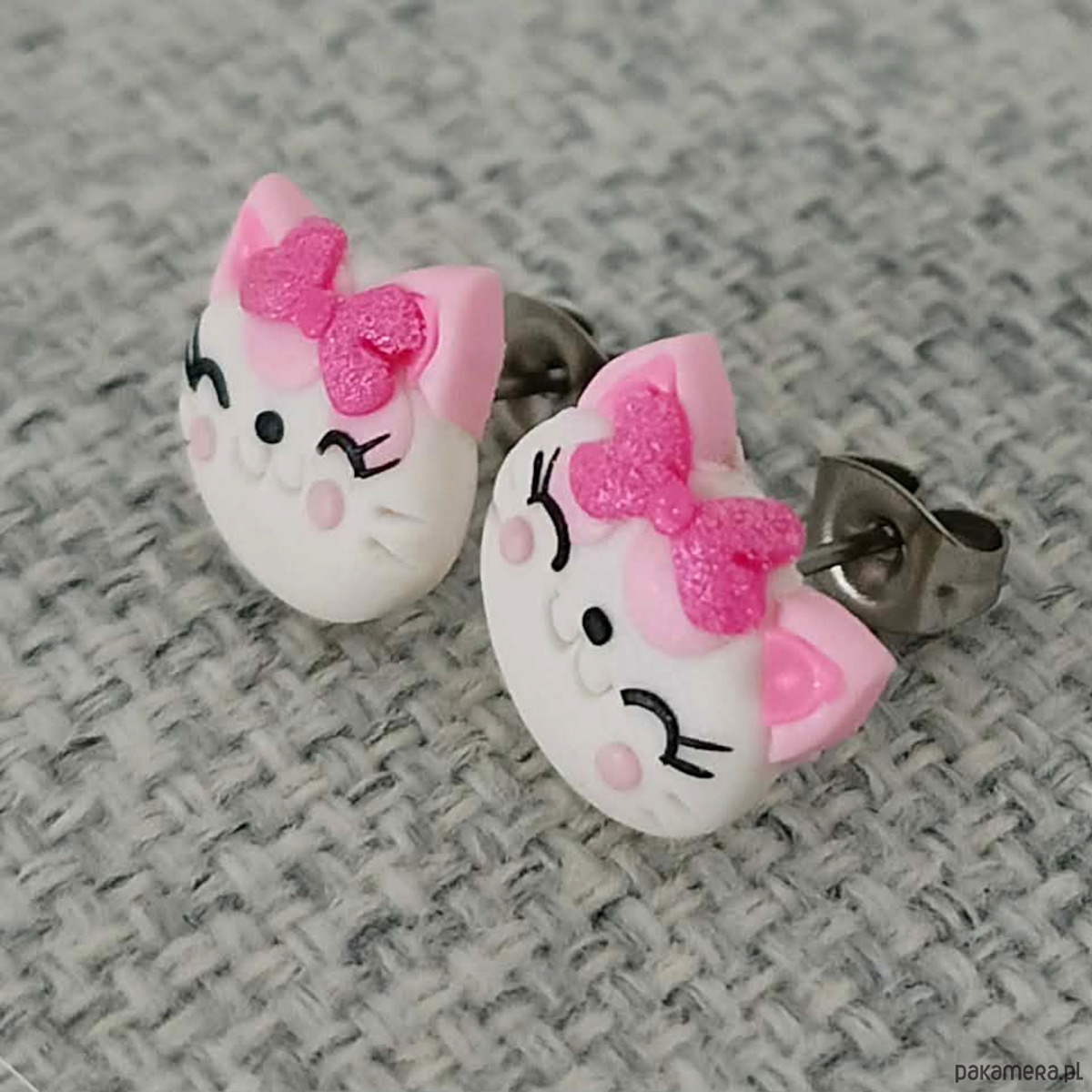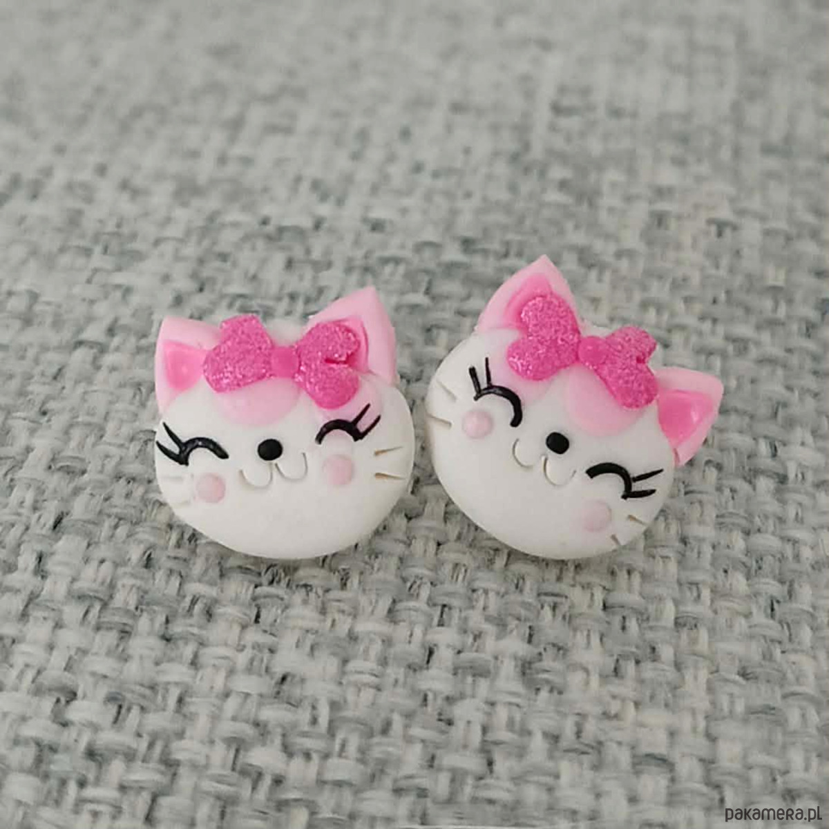 Urocze kolczyki w kształcie kotków z różowymi kokardkami, ręcznie wykonane z masy polimerowej.