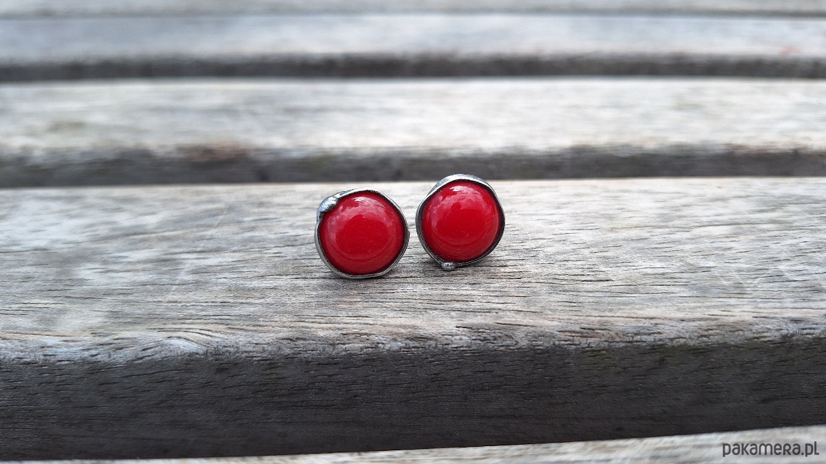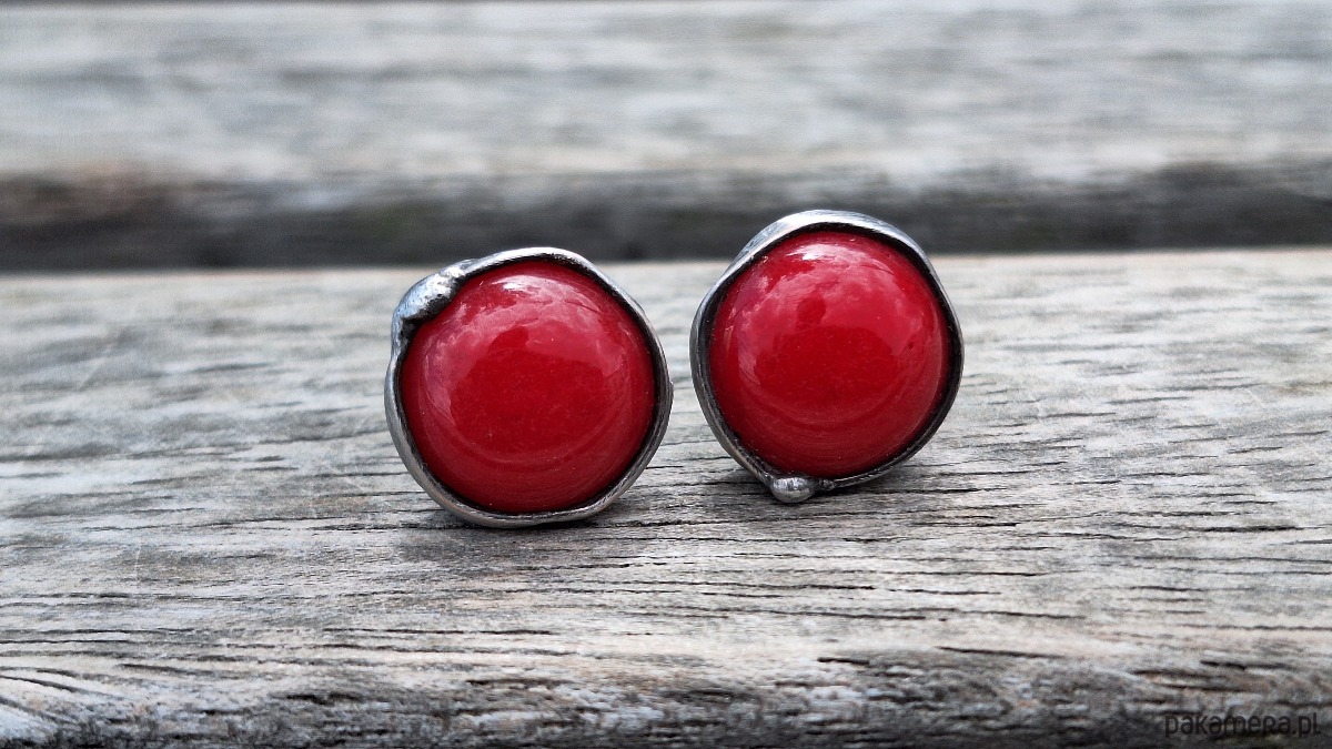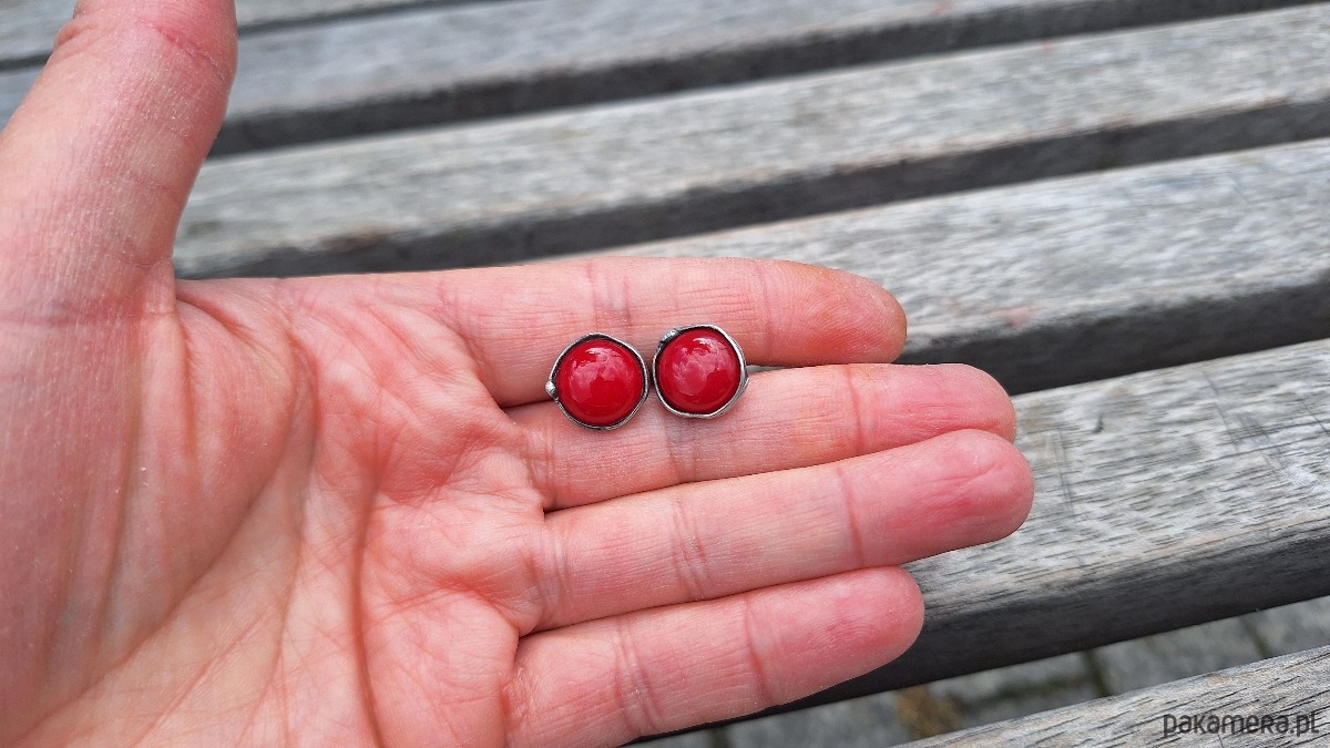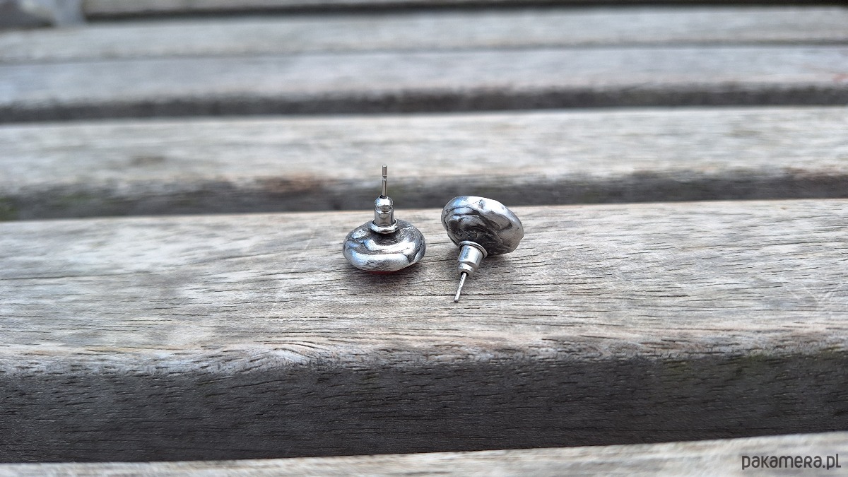 Kolczyki wykonane z miedzi, cyny i jadeitów. Średnica ok. 1 cm. Sztyfty metalowe.