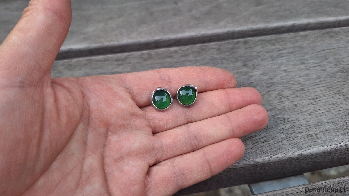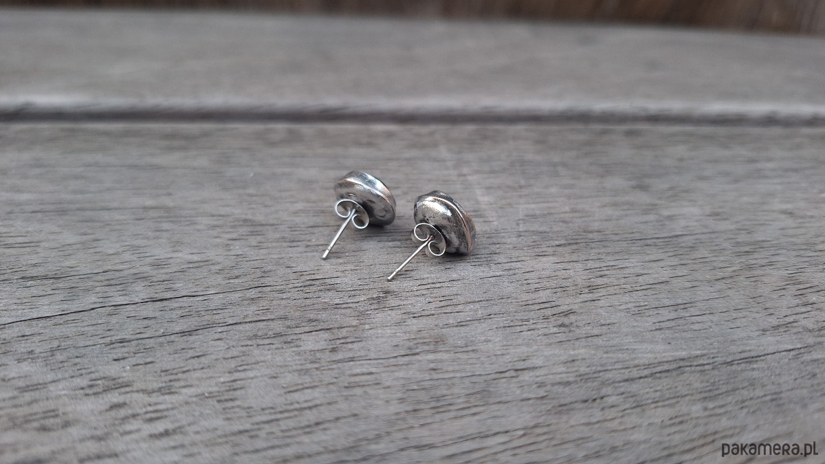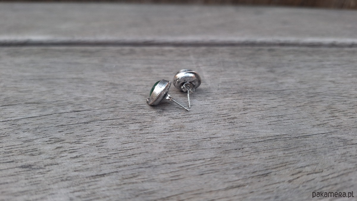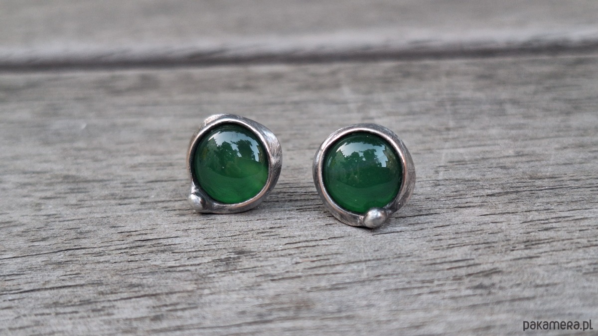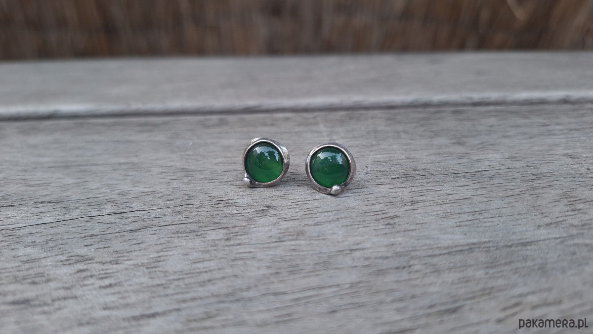 Kolczyki wykonane z miedzi, cyny i agatów. Średnica ok. 1 cm. Sztyfty metalowe.
